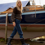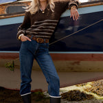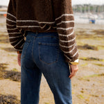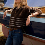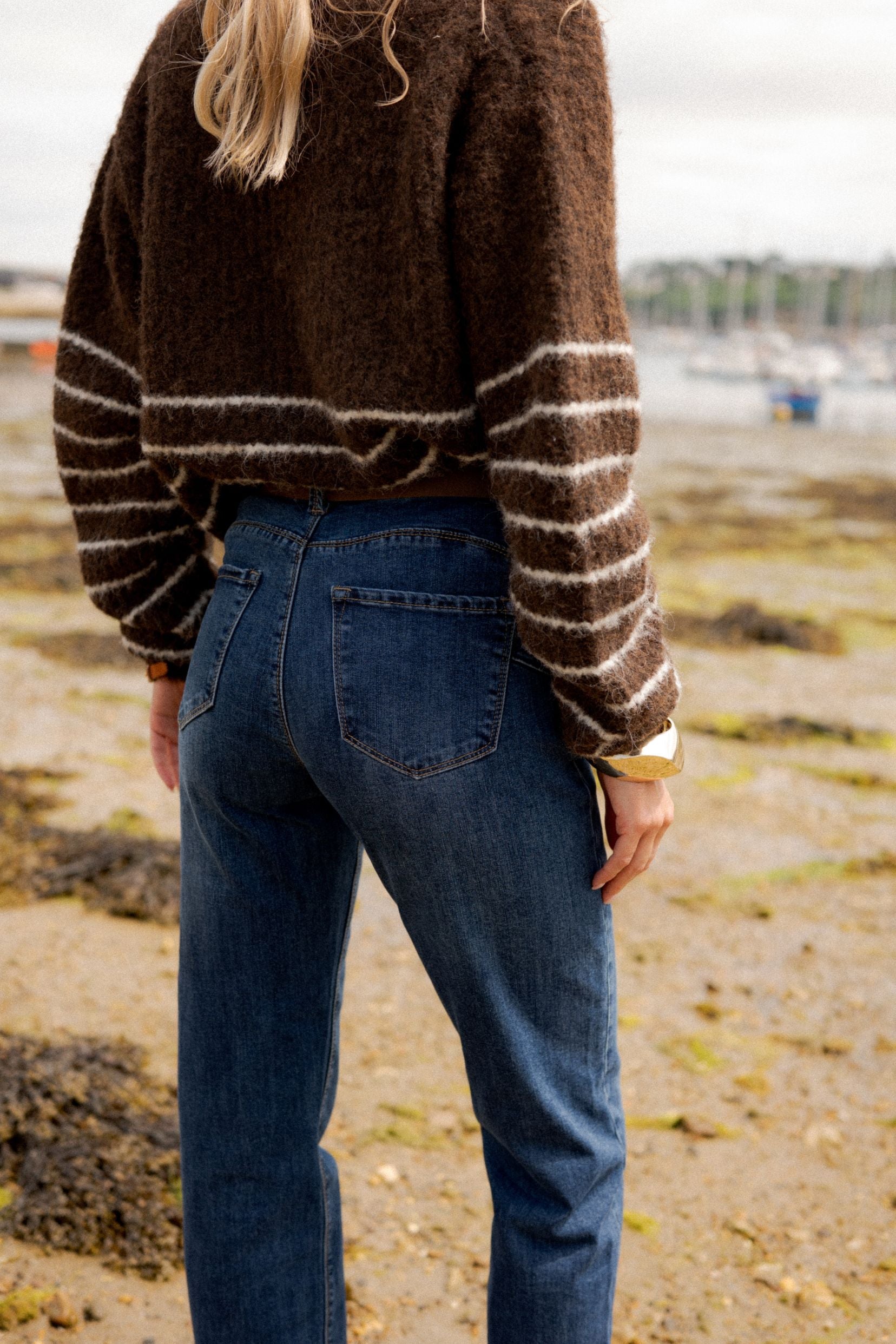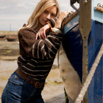 Détails : Maille duveteuse couleur chocolat avec rayures blanches irrégulières, col rond dégagé.