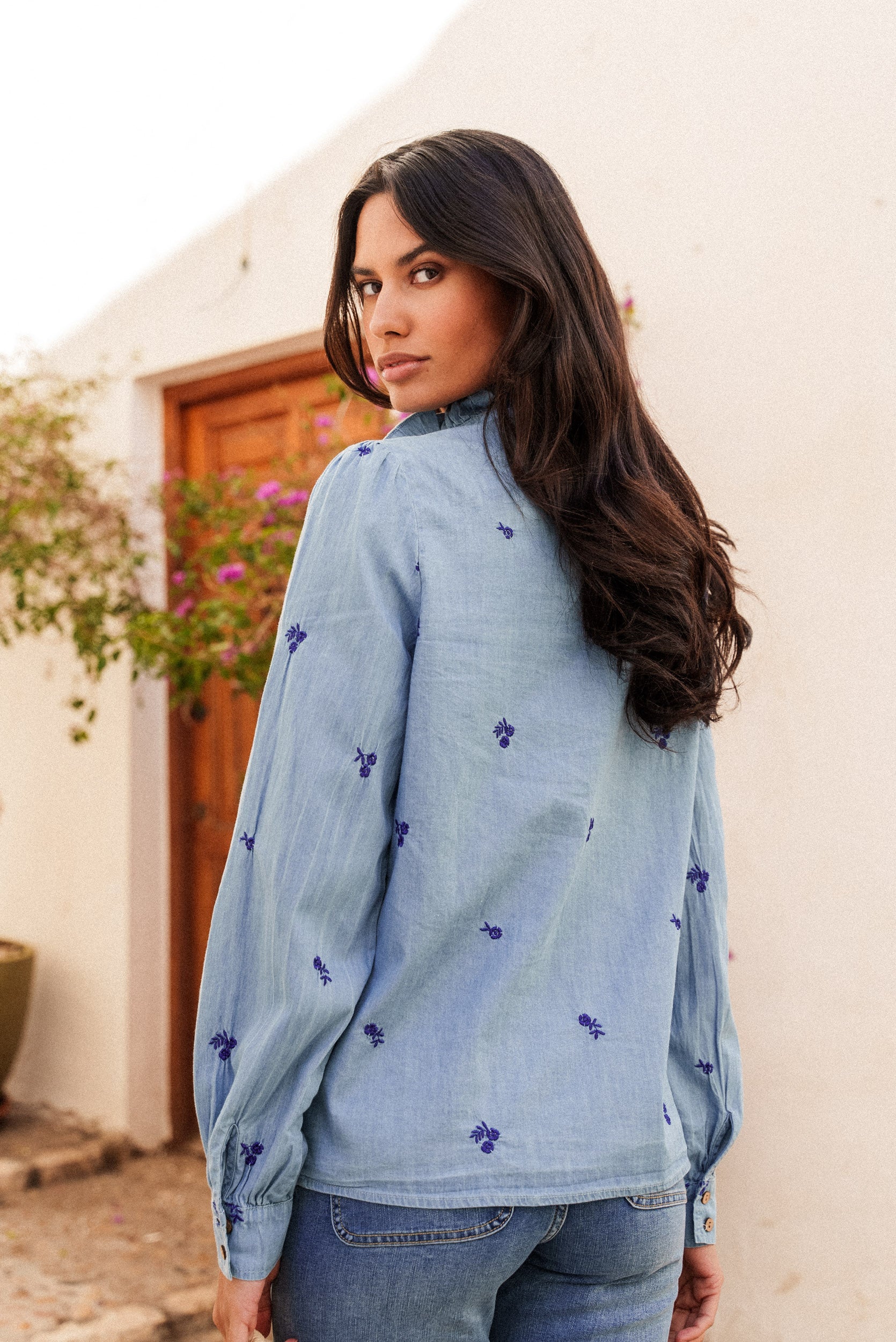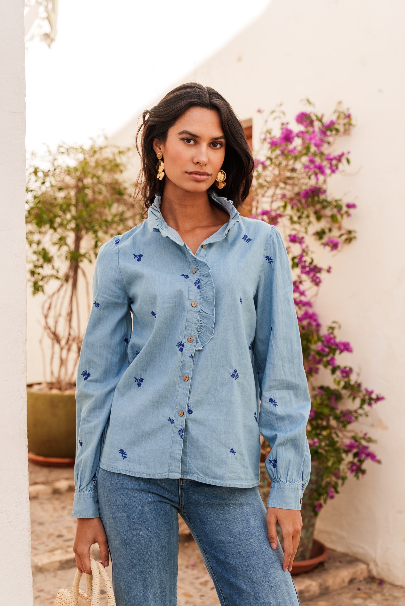 The Azura cotton shirt is distinguished by its delicate floral embroidery. The collar closure is decorated with wooden buttons, adding a natural and authentic touch to the piece. The ruffles finishing the collar complete the look elegantly, bringing a feminine and refined touch to this shirt. A refined choice for a delicate style.