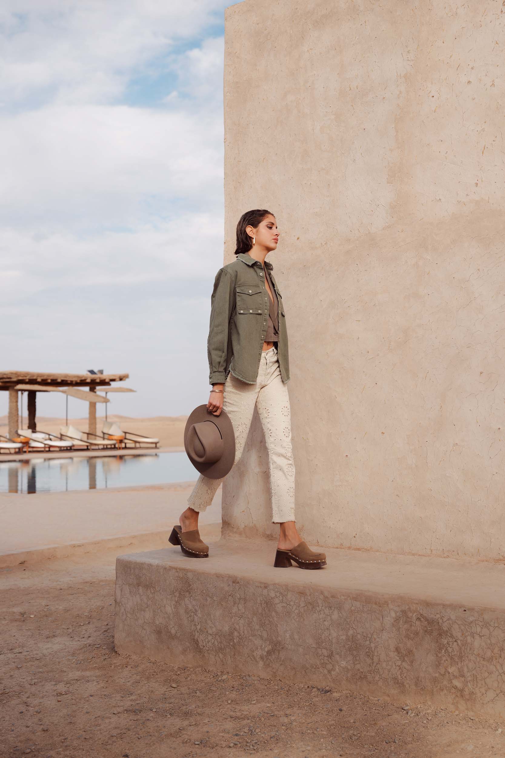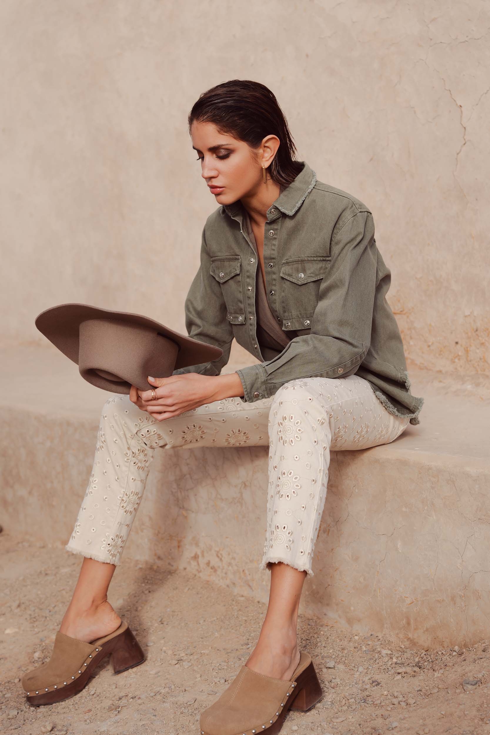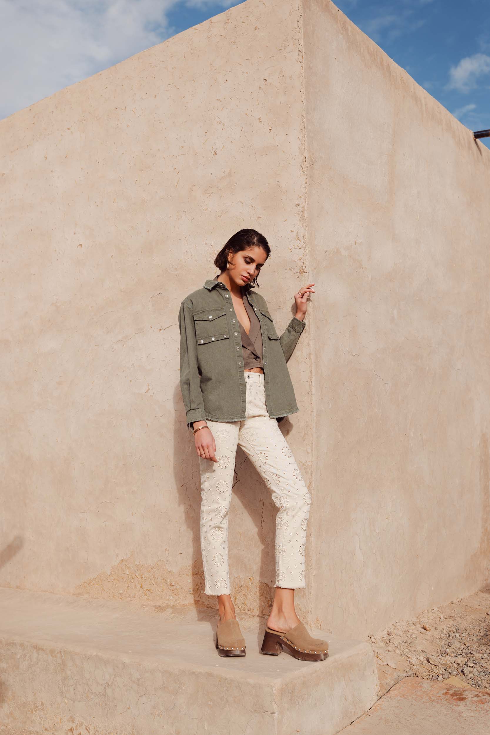 This denim shirt is made from khaki canvas for a casual look. Its jacket-style neckline is decorated with fringes for an extra touch of character. Featuring metal buttons and two chest pockets, this versatile piece can be worn as an overcoat or as a shirt in its own right.