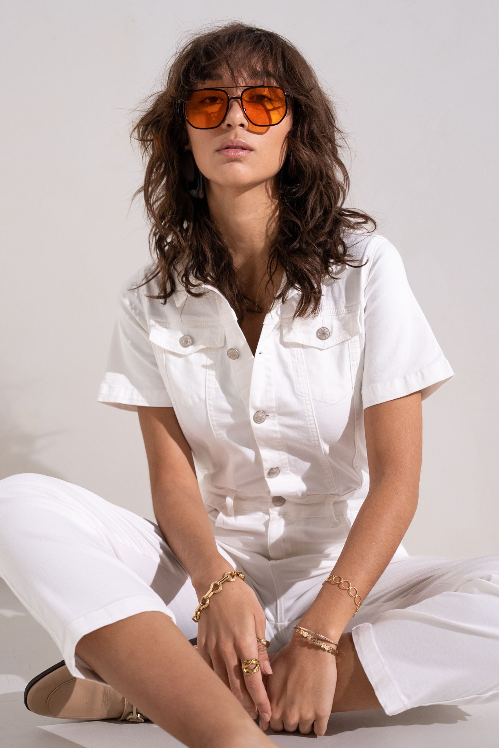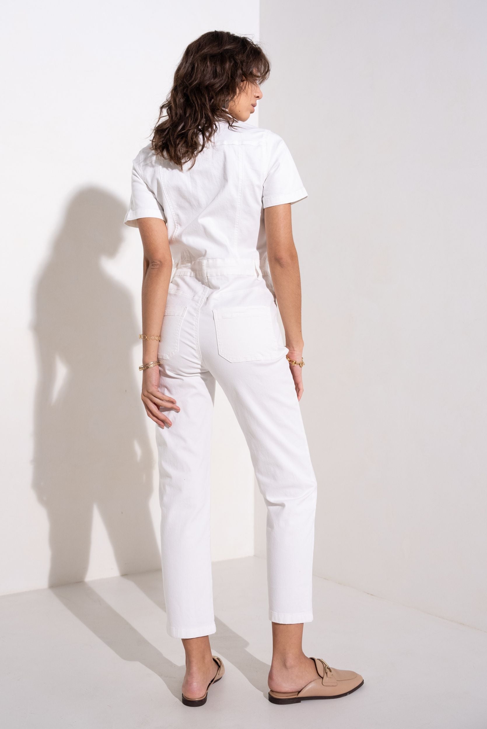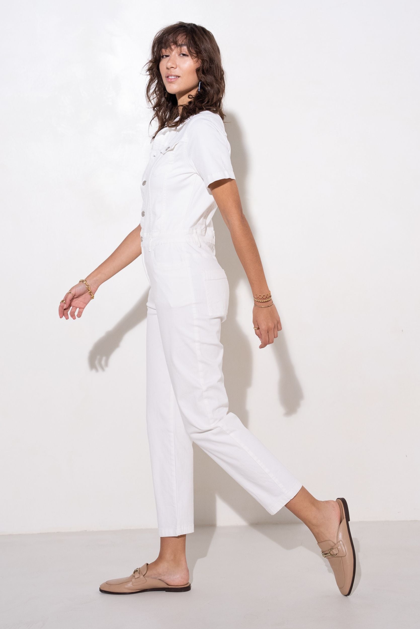 • Design: White denim jumpsuit, short sleeves and buttoned, wide straight legs