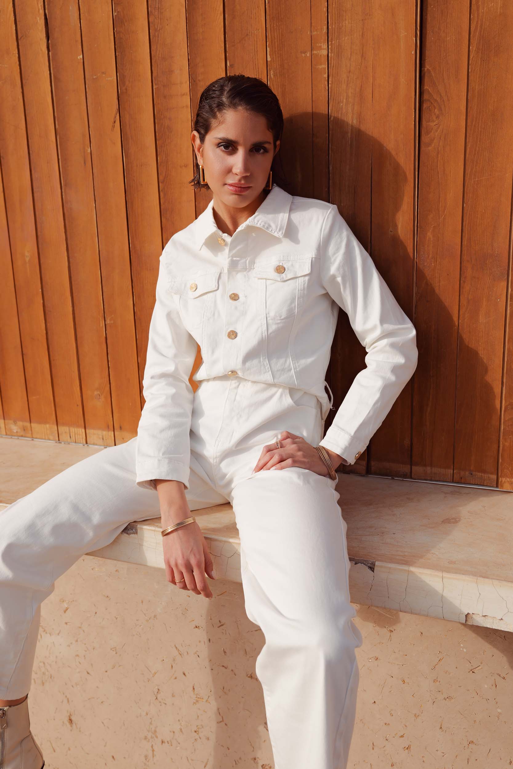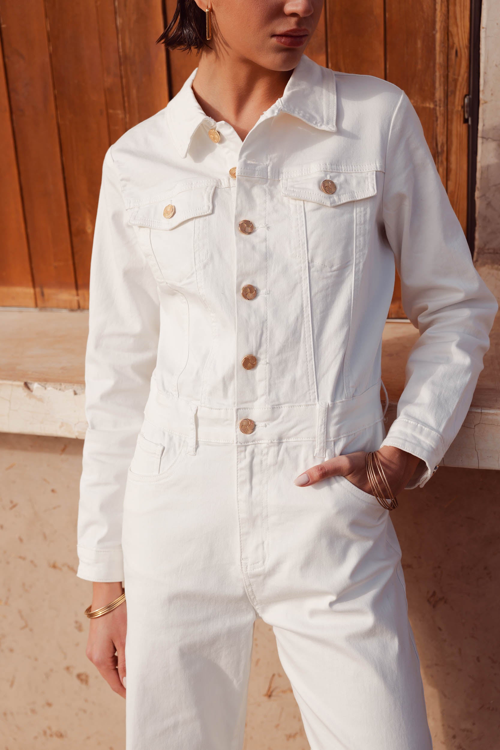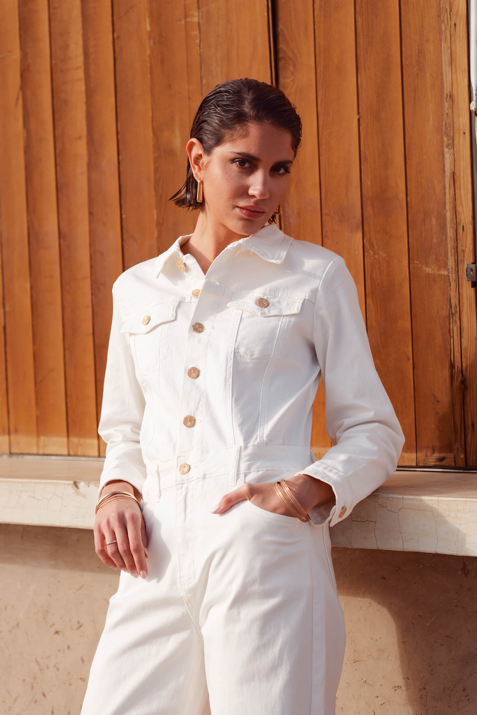 The wide straight leg cut jumpsuit, with long sleeves and gold buttons, embodies the perfect marriage between comfort and style. Perfect for any occasion, this versatile piece adds a touch of sophistication to your wardrobe, whether for a day at the office or a night out with friends. With its flattering cut and refined details, it is the ultimate expression of modernity and self-confidence.