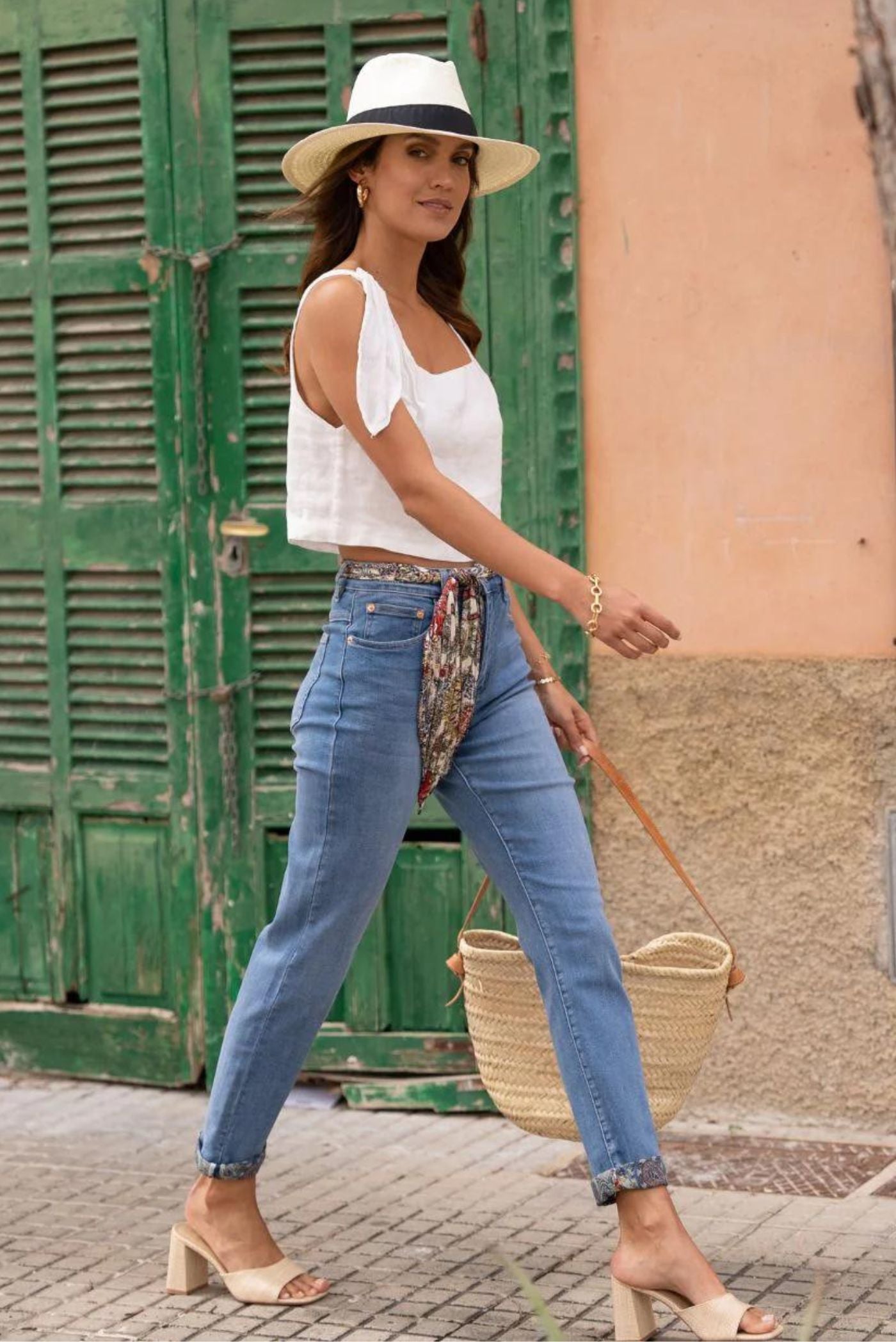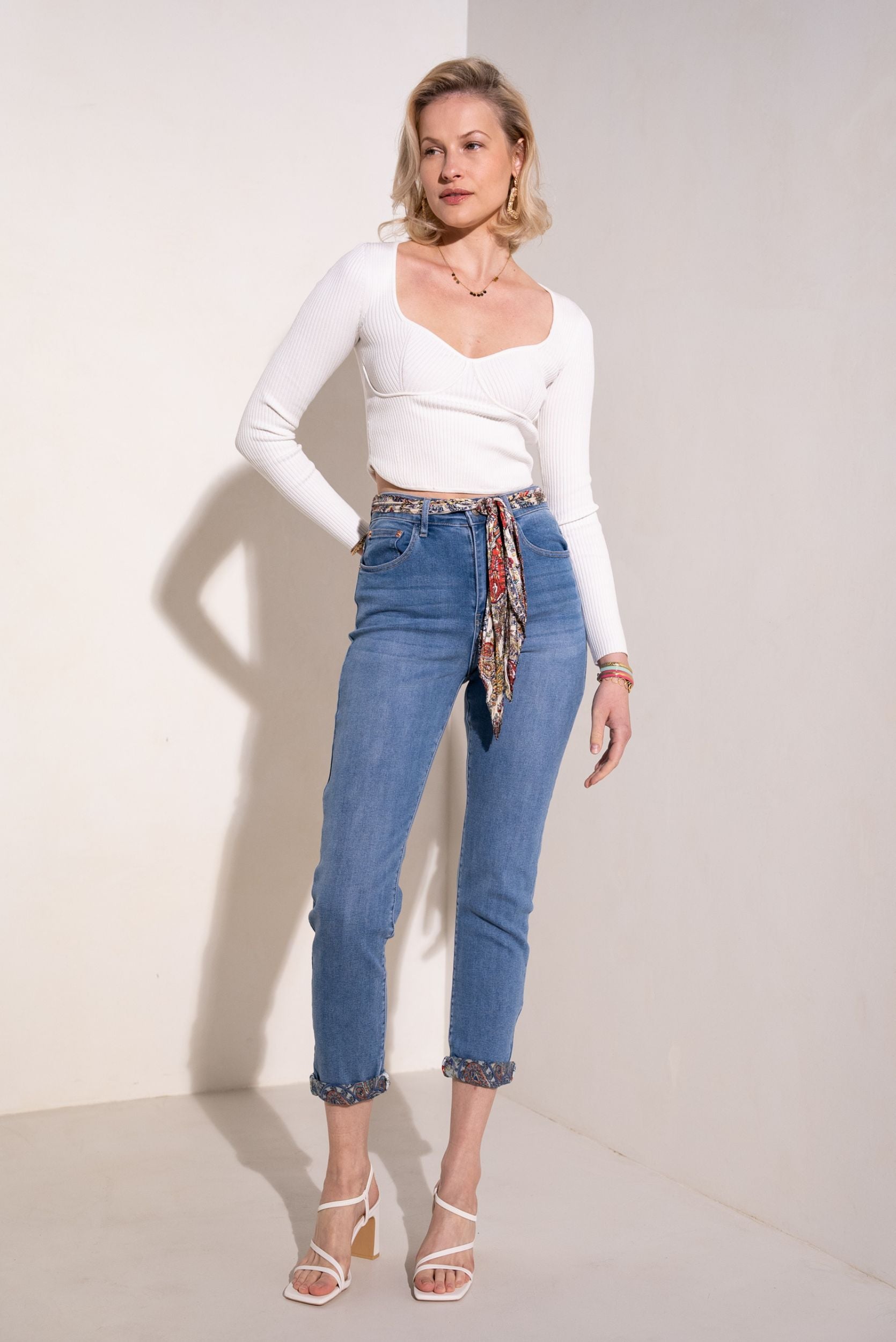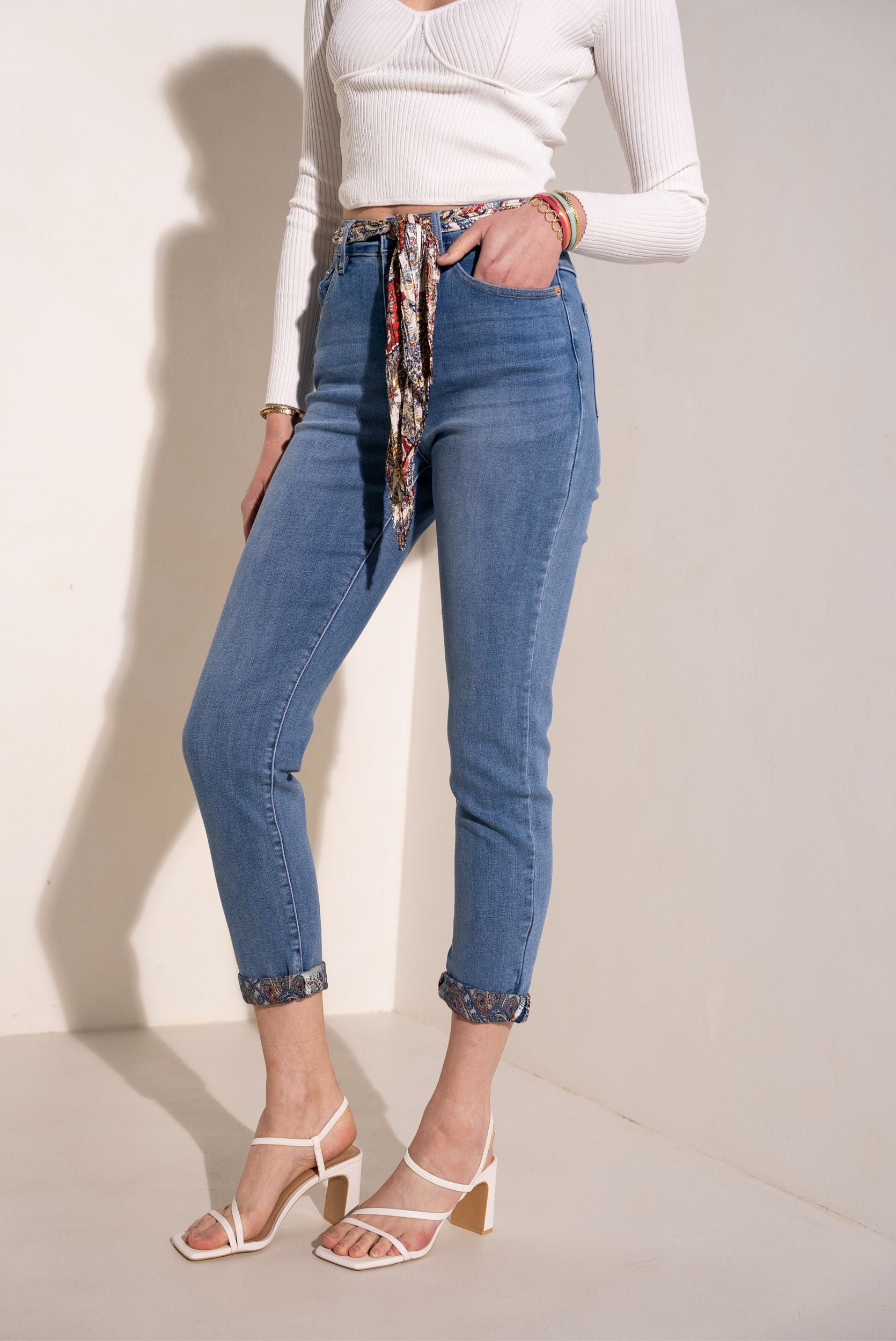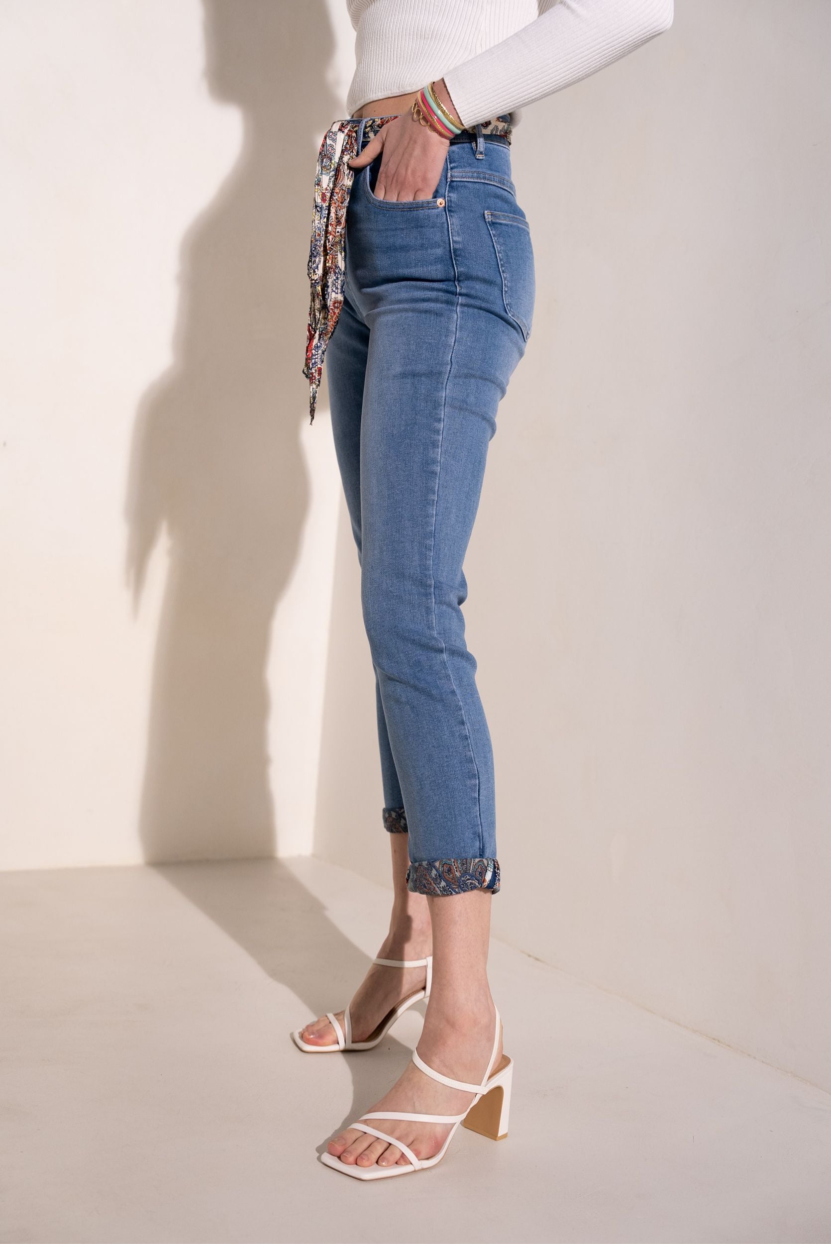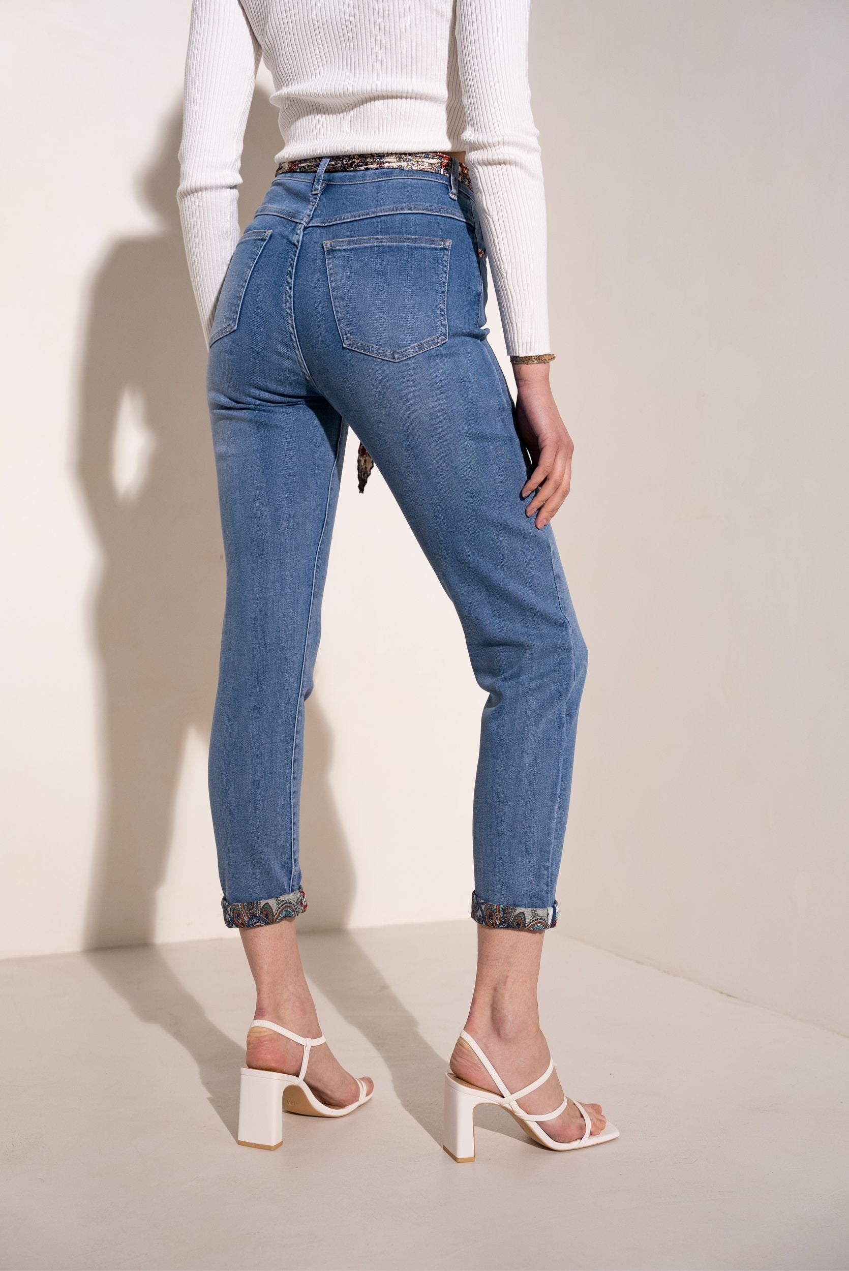 Mom pants with printed cuffs and printed belt. Belt loop. Jeans pockets.