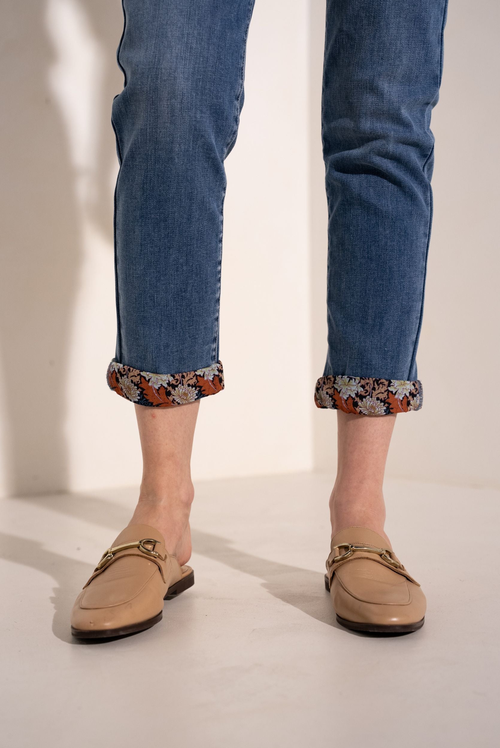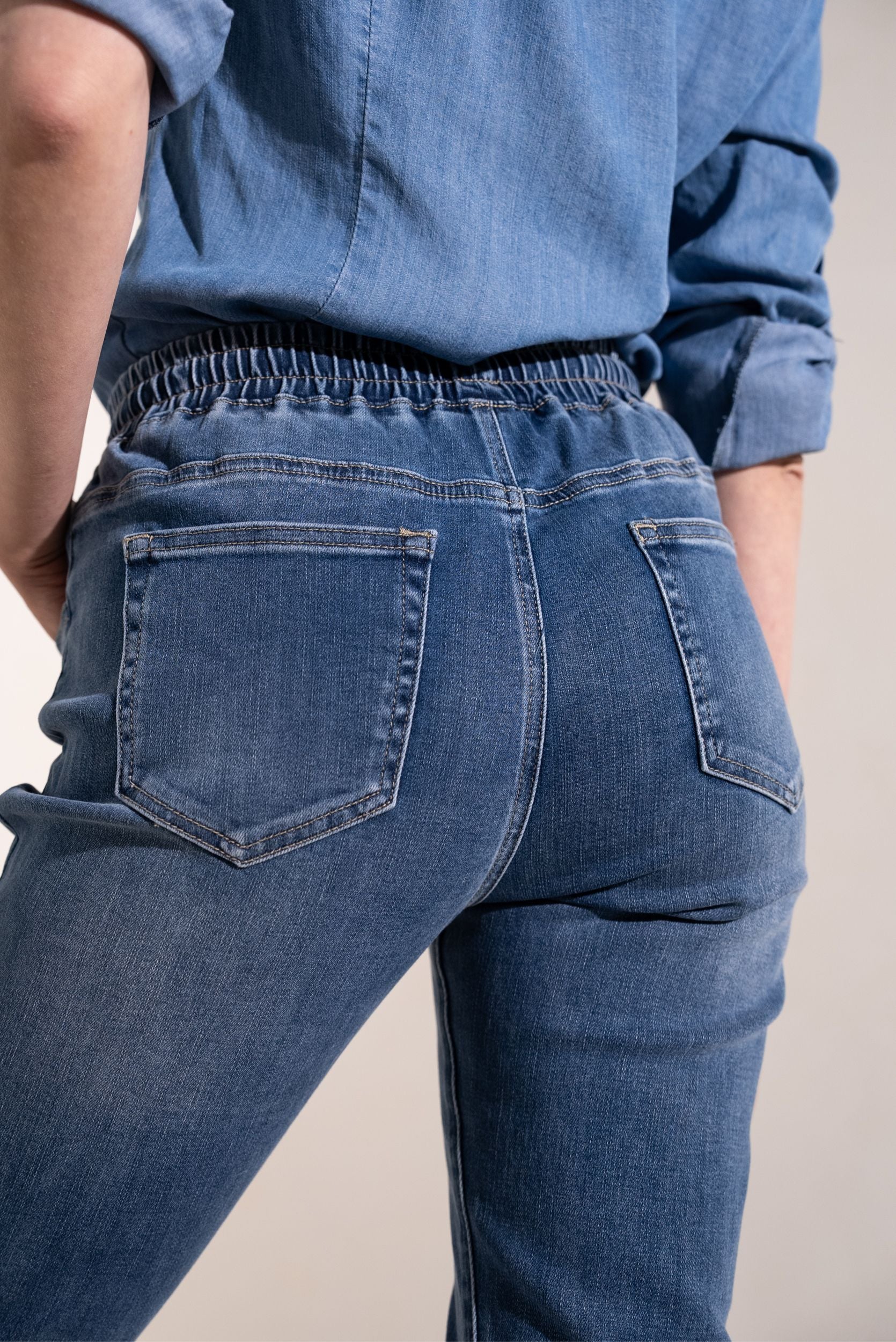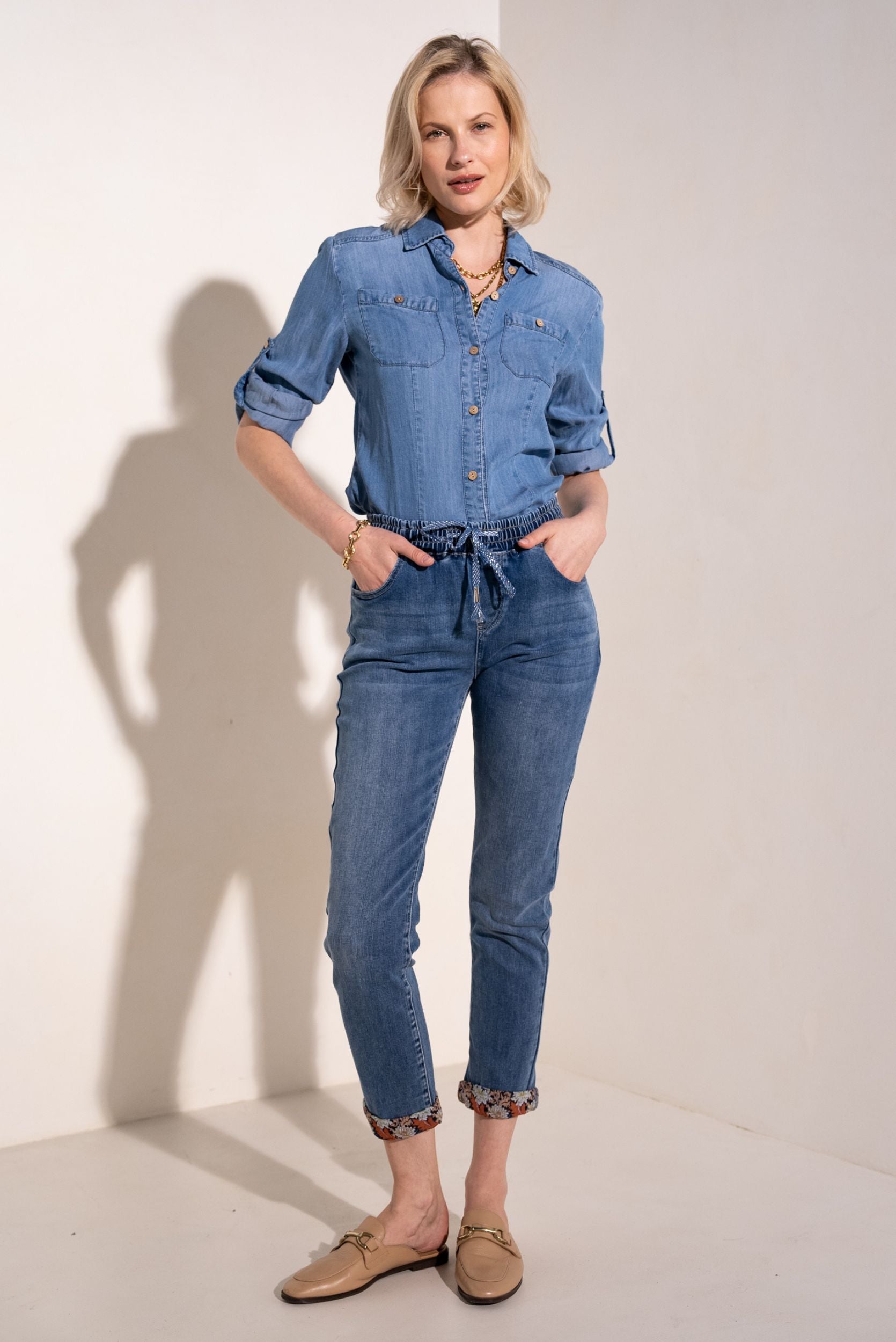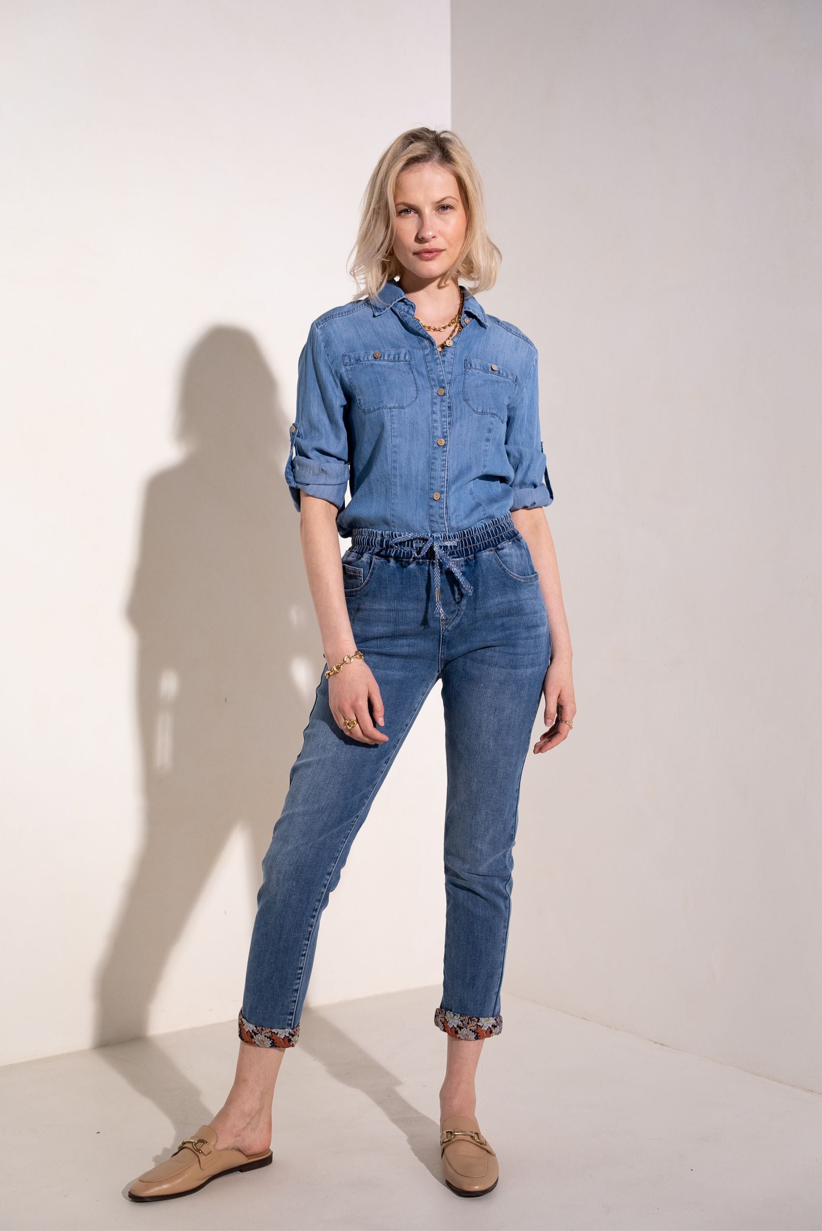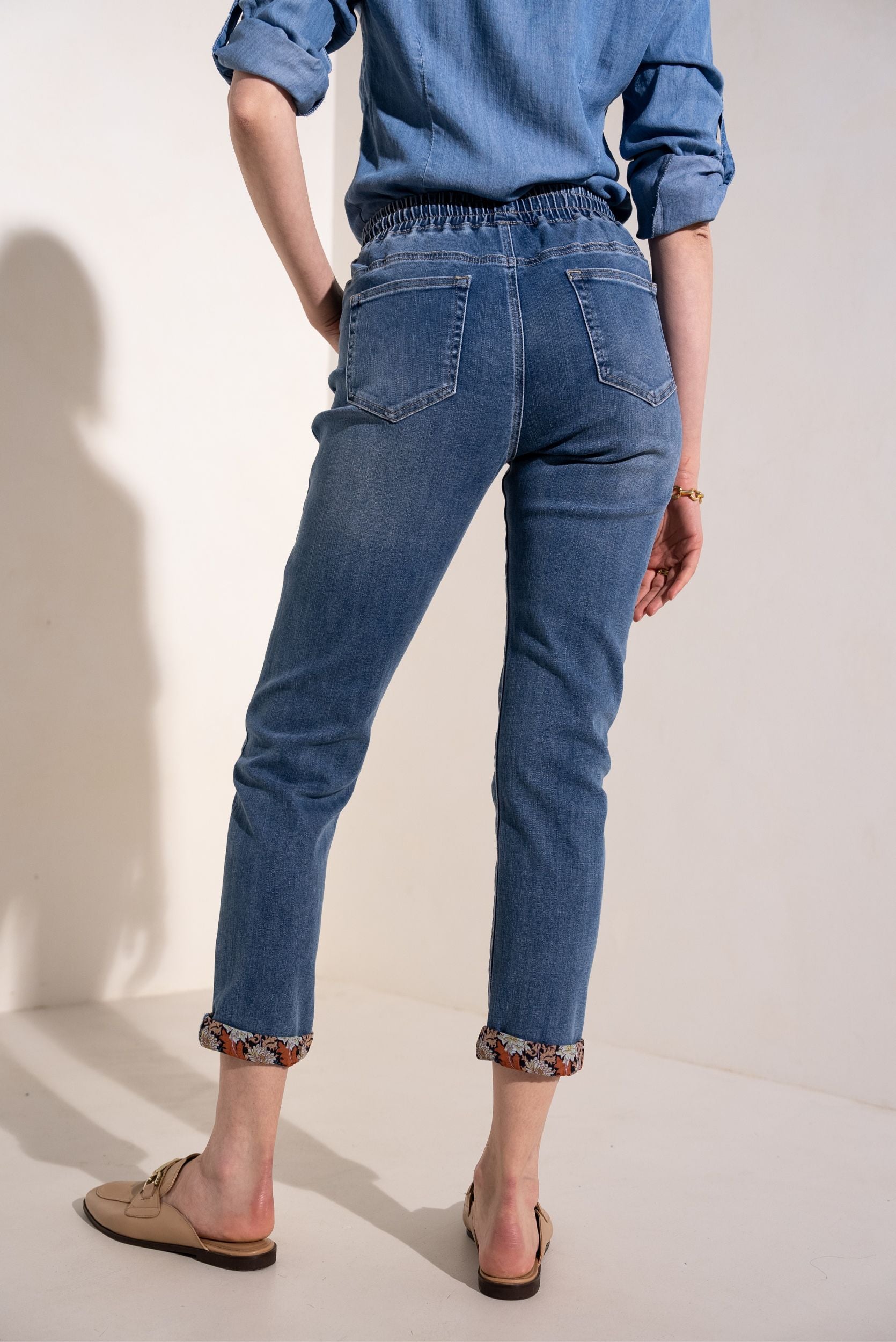 Eva straight jeans. Elastic waist jogging pants with Liberty print cuffed bottom. Jean pockets.