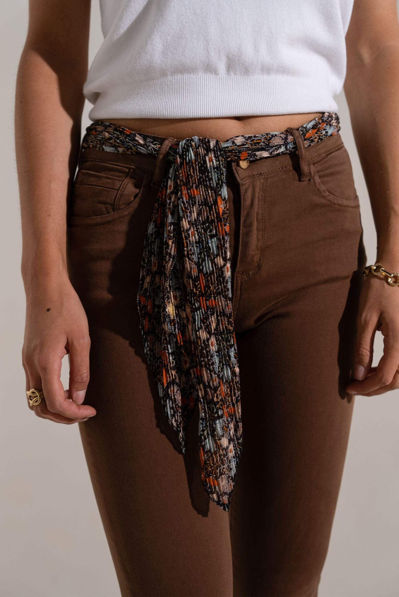 Sivetha organic cotton canvas pants in bottle chocolate color, accompanied by its scarf-belt as a timeless accessory.