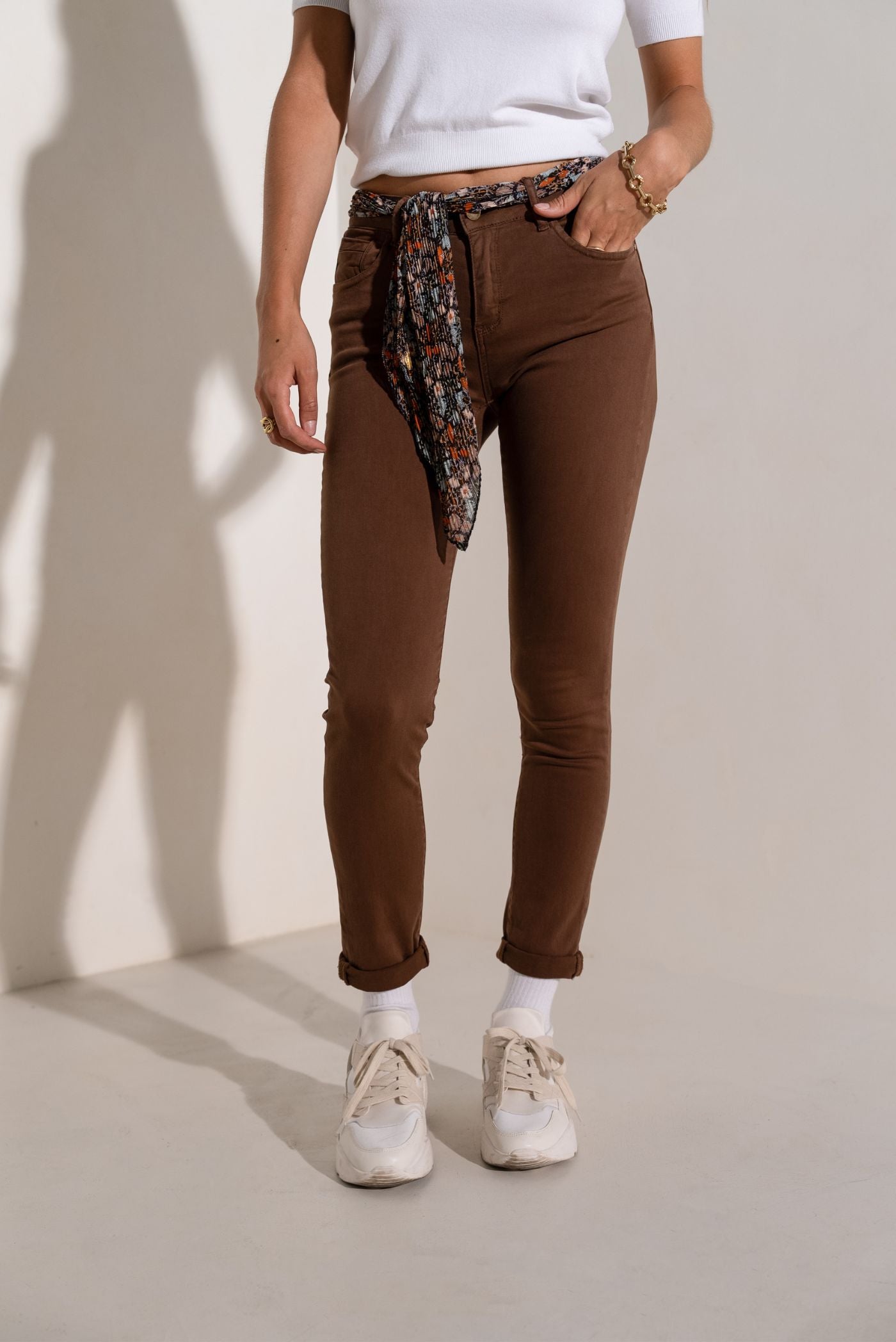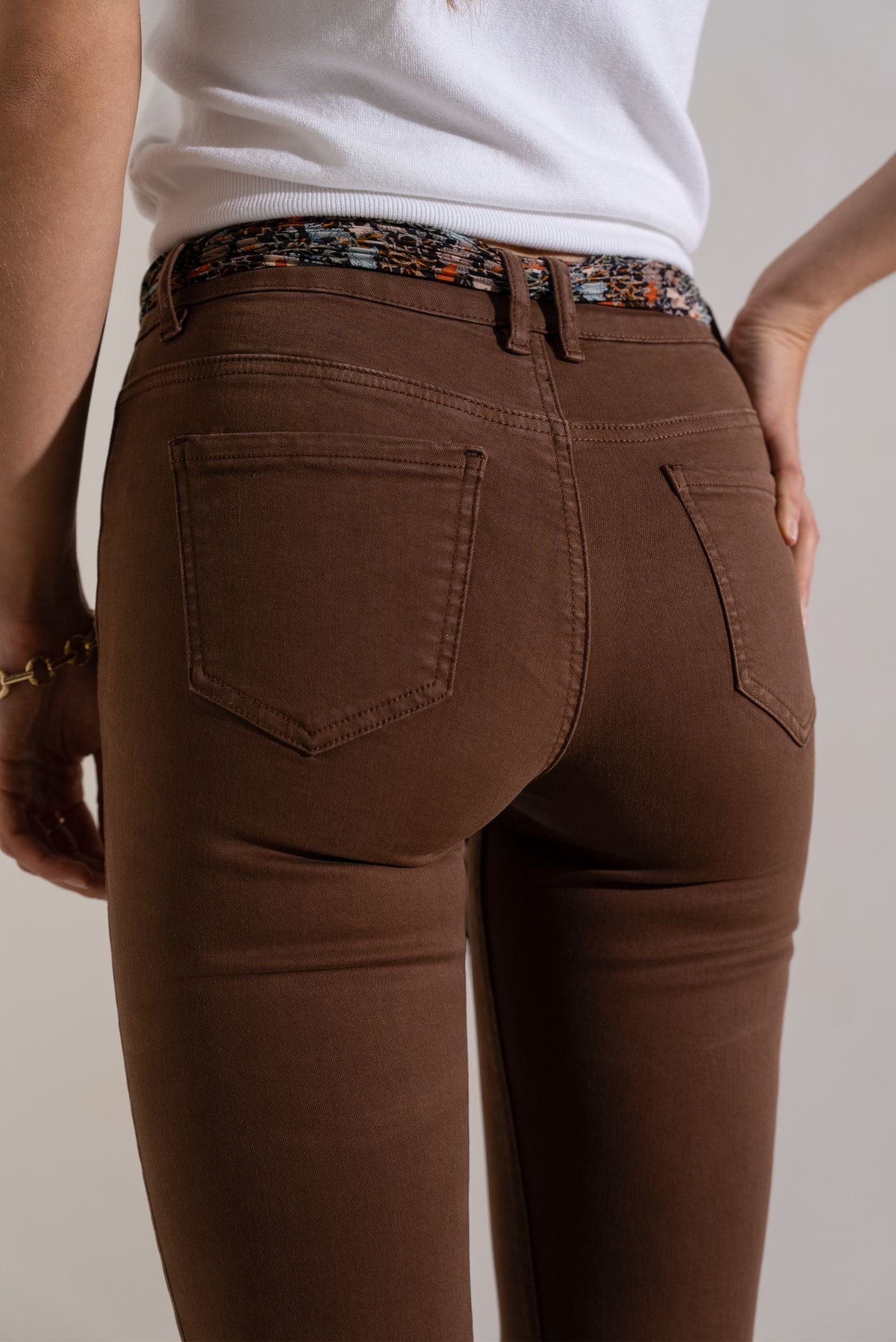 - Design: Organic cotton canvas pants in bottle chocolate color, accompanied by its scarf-belt as a timeless accessory. Made with stretch cotton, these pants combine comfort and style. It also has 5 practical pockets for a functional look.
