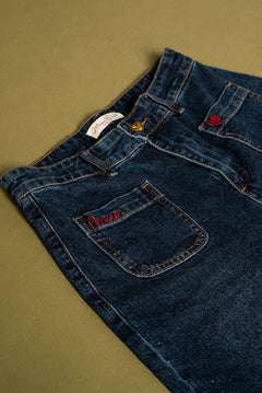 Détails : Toile denim bleu brut, col montant esprit col officier, broderie rouge subtile sur la poche poitrine, poignets boutonnés ajustables