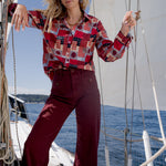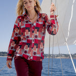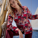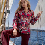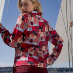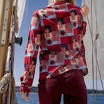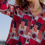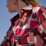 Détails : Motif patchwork multicolore dans les tons rouges et bleus, col classique, boutonnière discrète et finitions contrastantes
