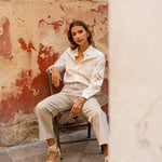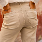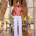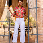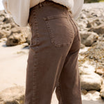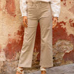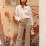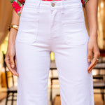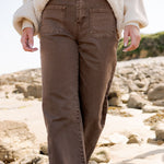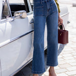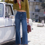Wide cut jeans, both comfortable and stretchy. With belt loops and 2 square pockets. Giving the look a classy, elegant, and dressed-up style.