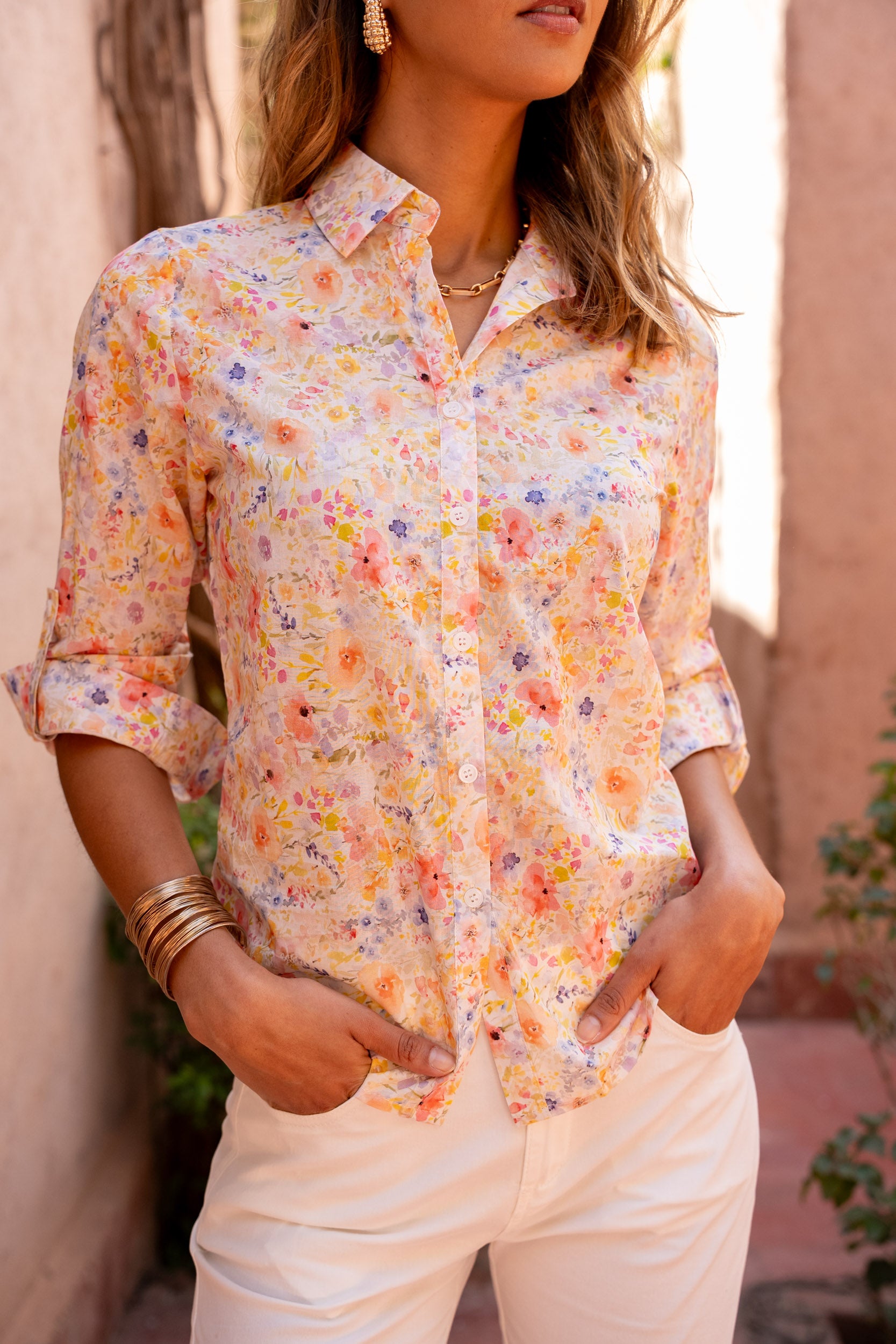 Multicolored floral print all over the fabric, classic shirt collar, long sleeves with the option to roll up with a button, button closure on the front, patch chest pocket.