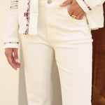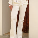 Ecru denim jeans, flare cut, inspired by the 70s, with five practical pockets.