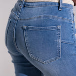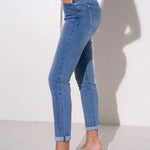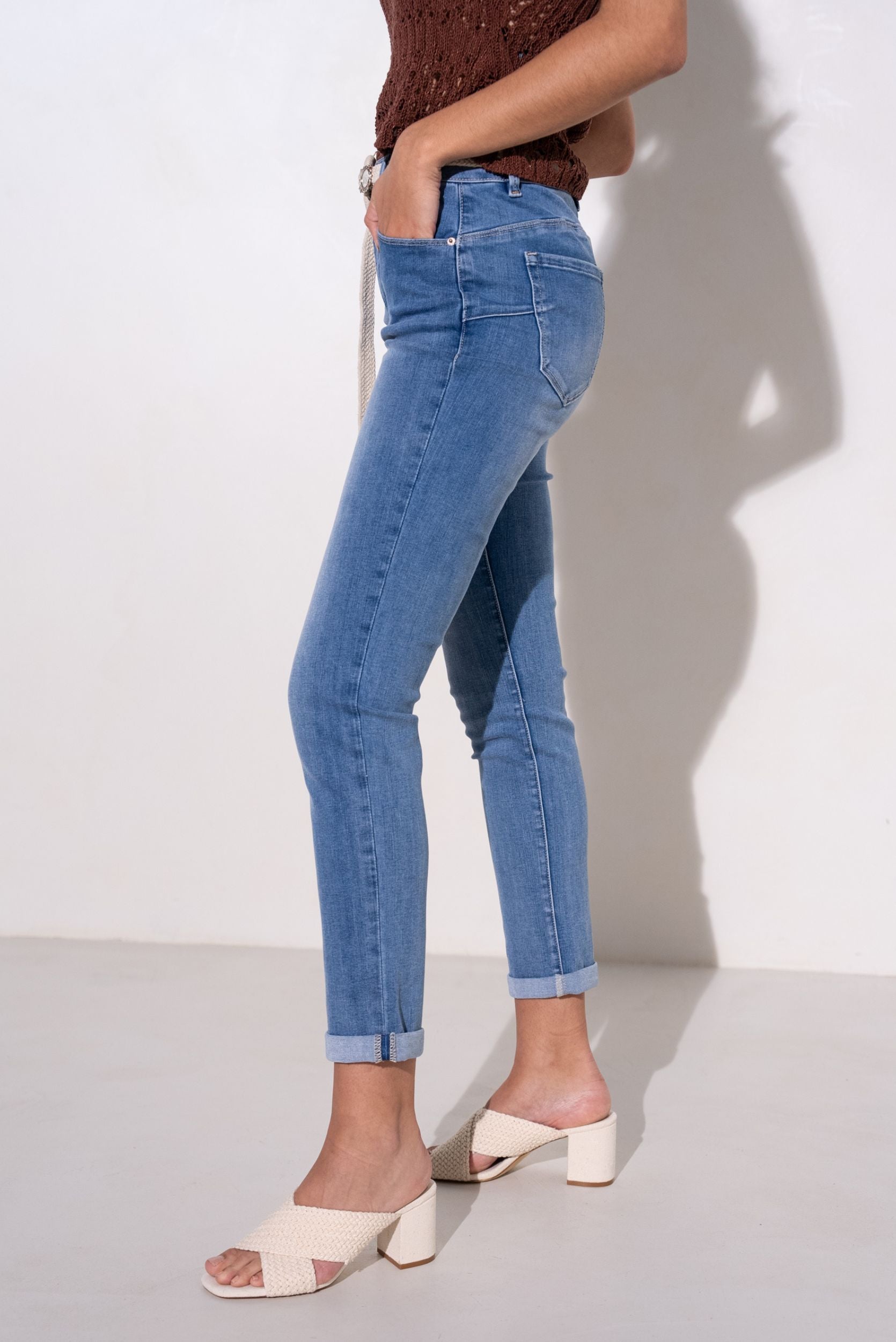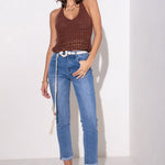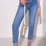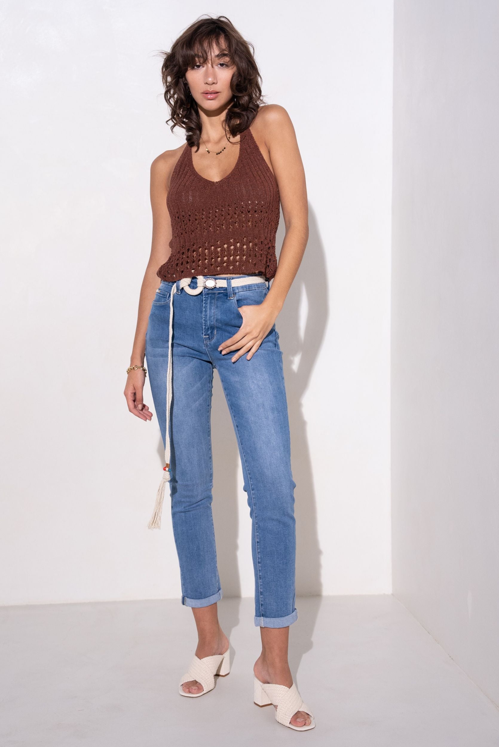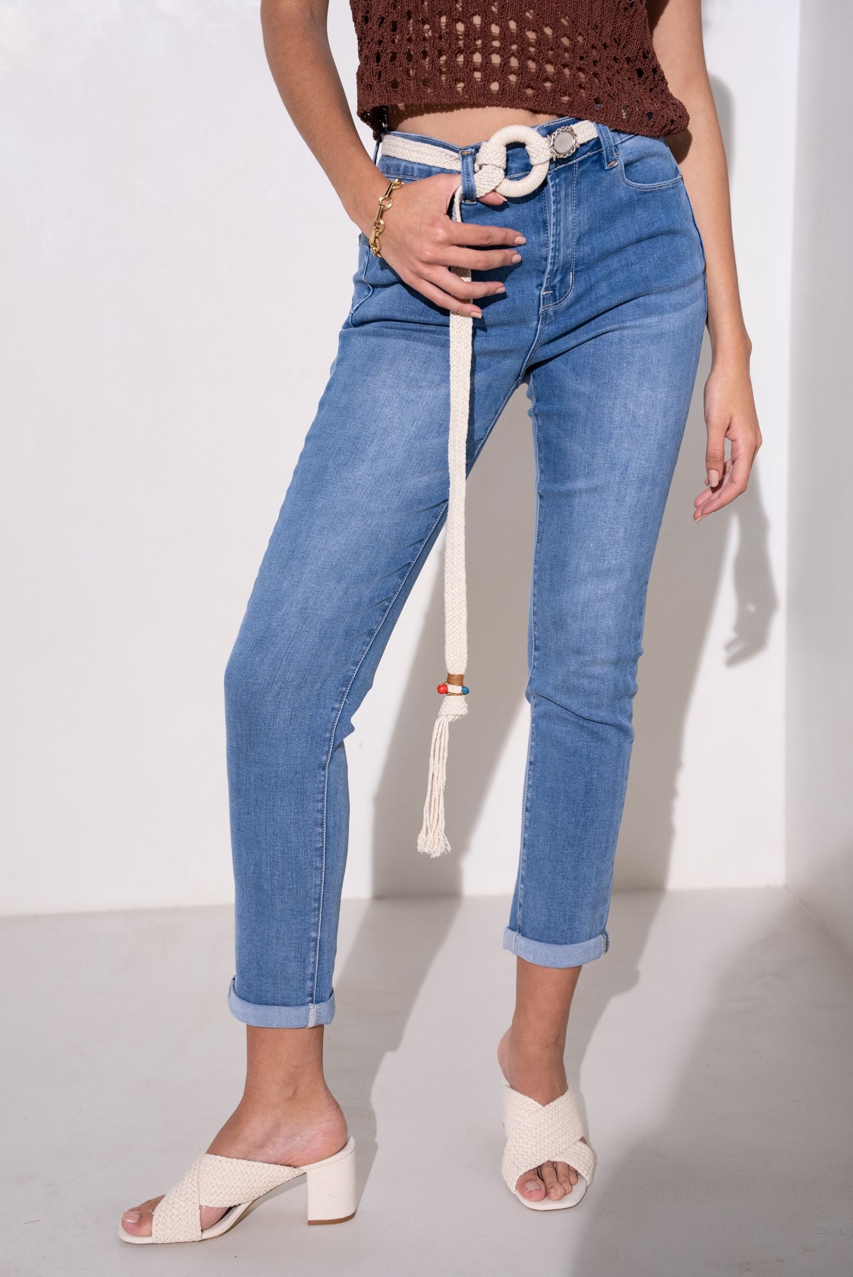 Mia straight denim jeans. Natural rope belt. Belt loop. Jeans pockets.
