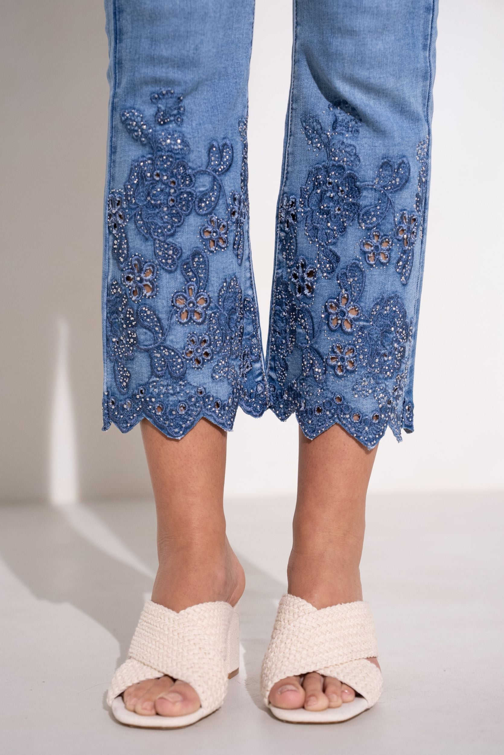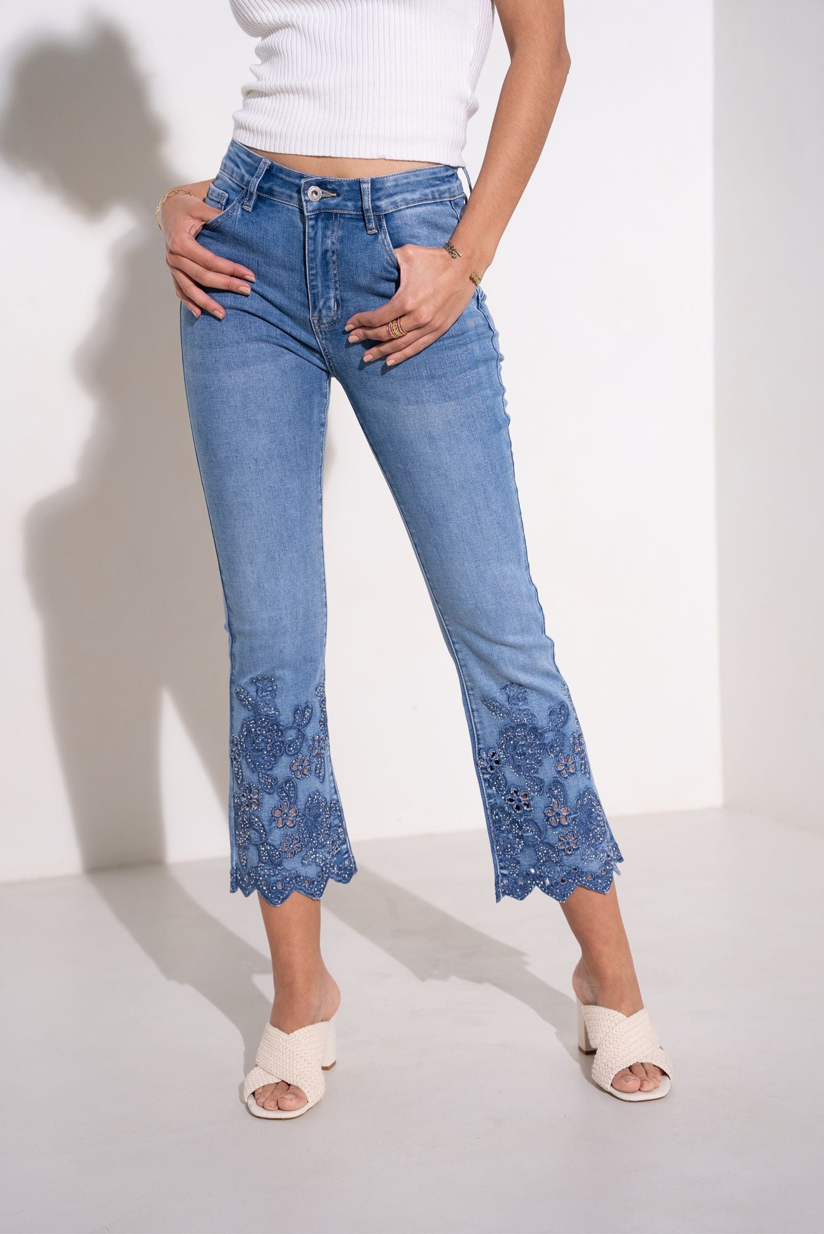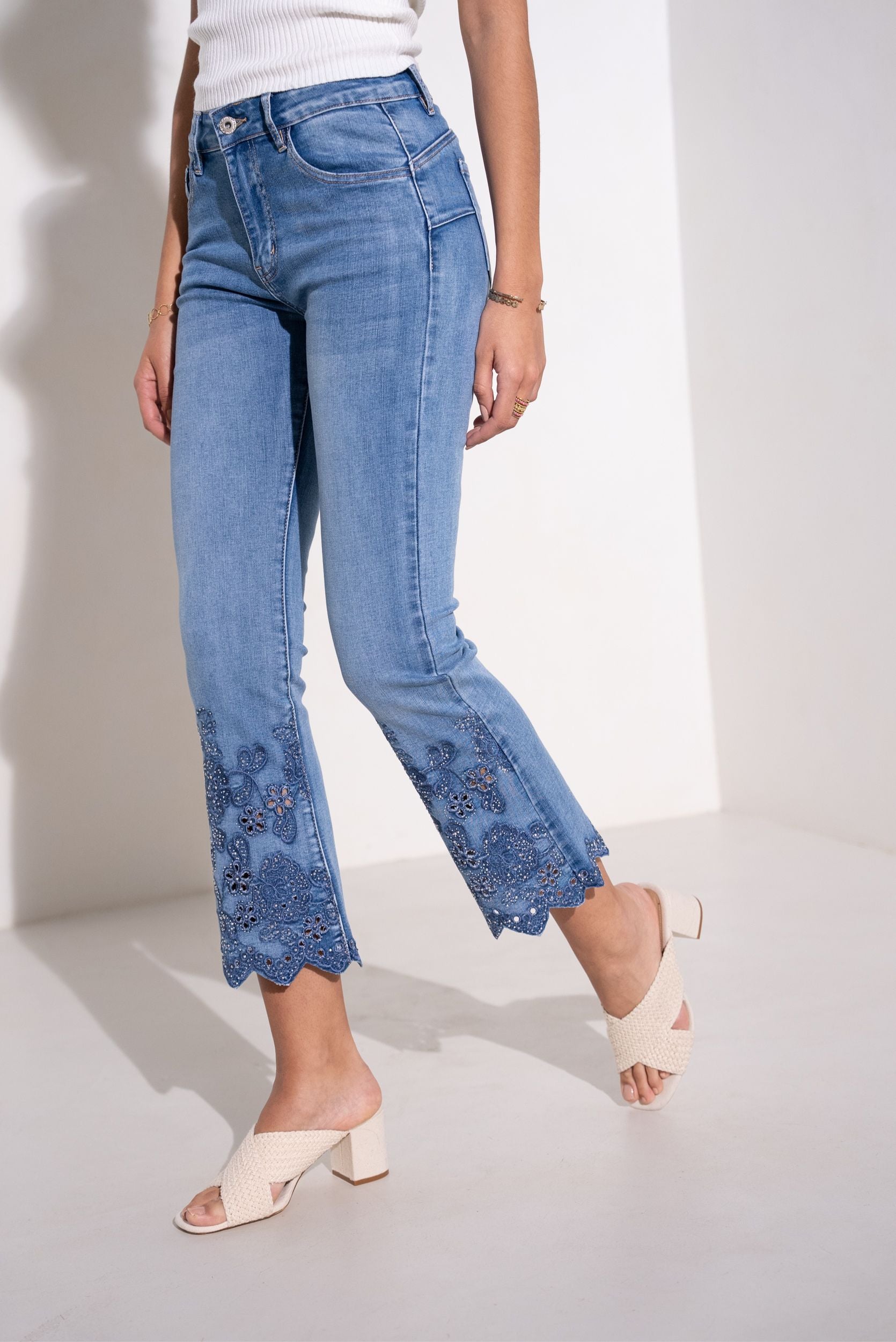 Flared pants with floral embroidery at the bottom of the leg. Belt loop. Jeans pockets.