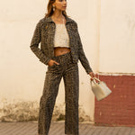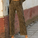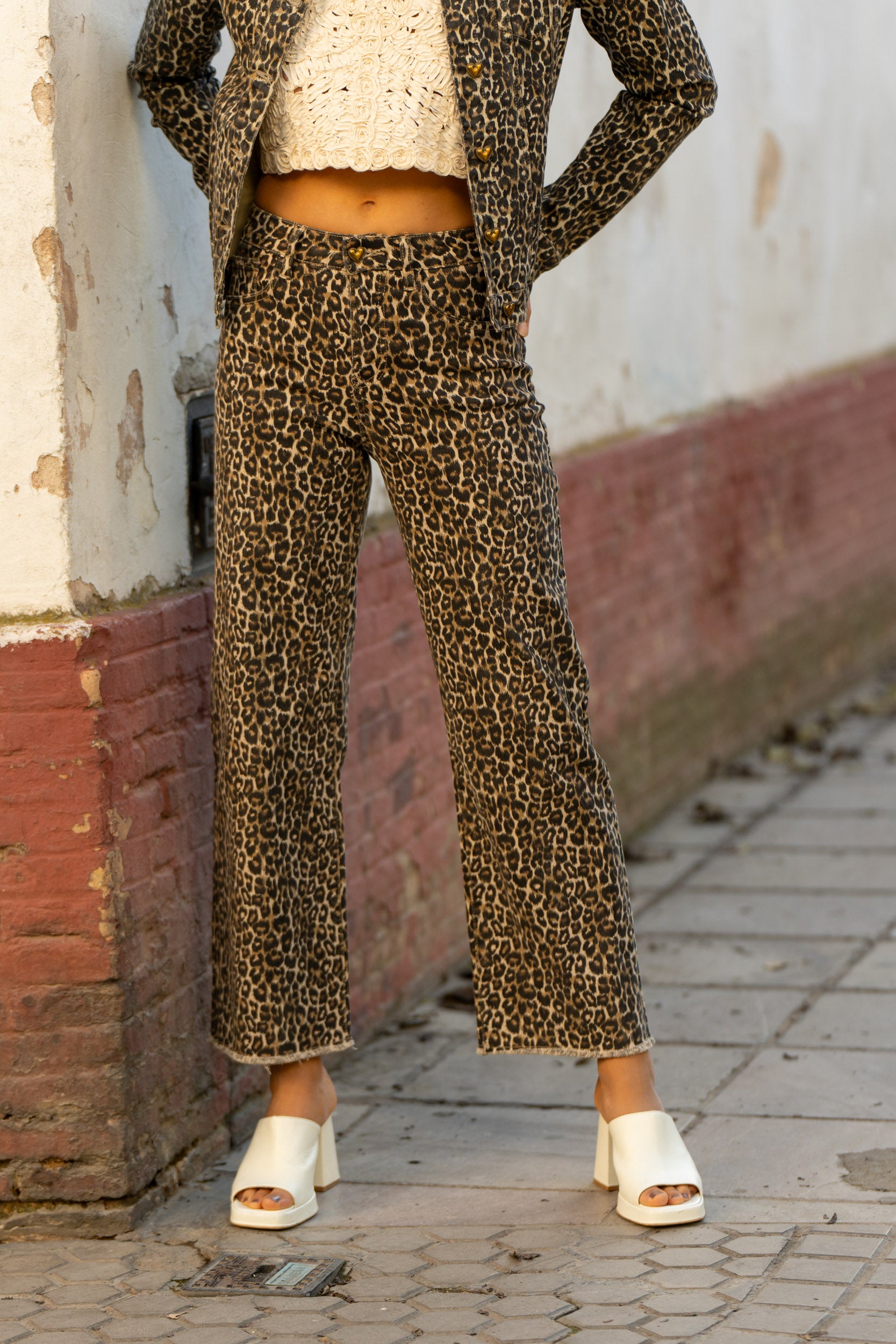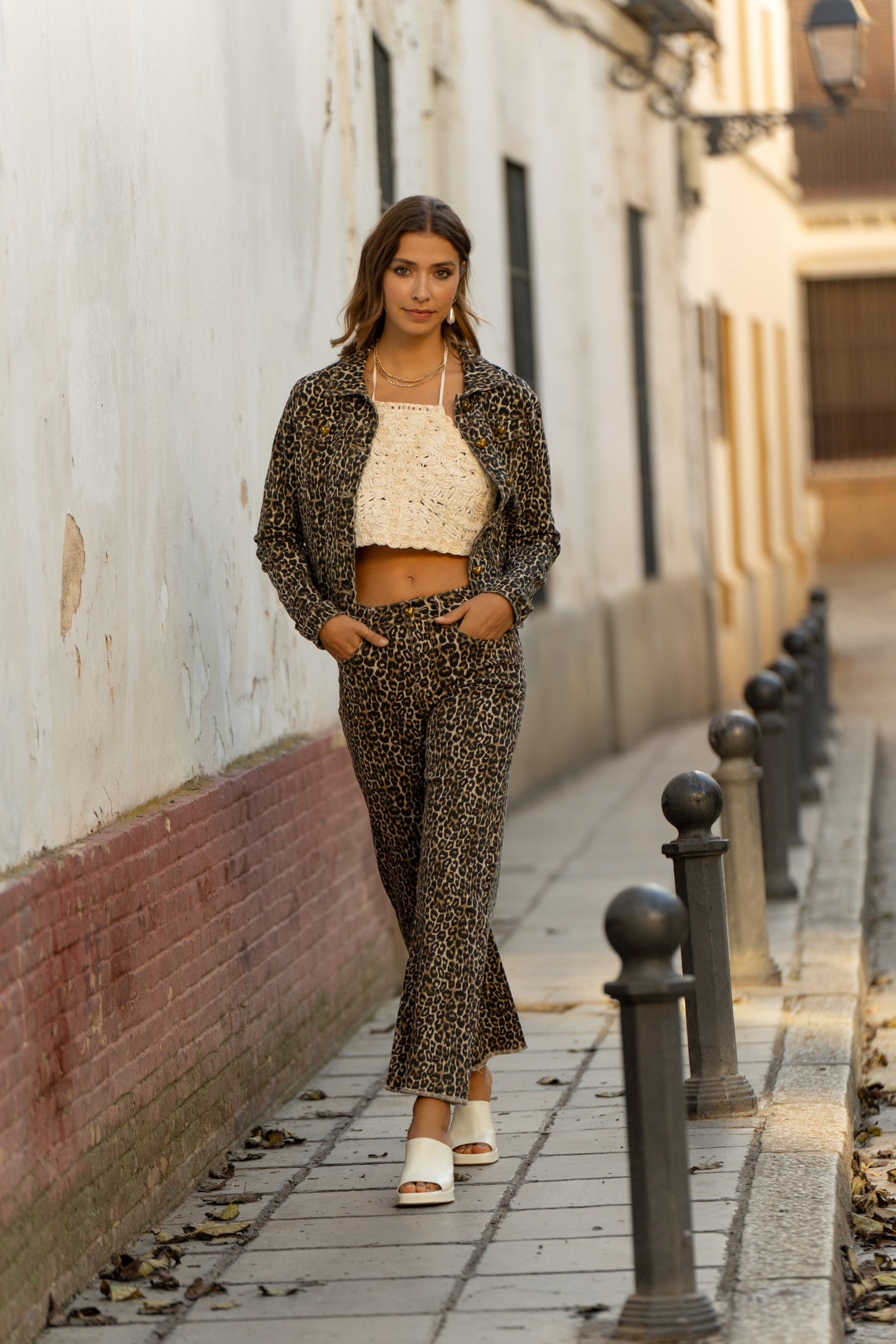 Camel leopard print jeans, with a vintage heart-shaped closure button for a romantic and retro touch. It features belt loops and five pockets for a practical and stylish look. A bold model that combines comfort and originality for a unique look.