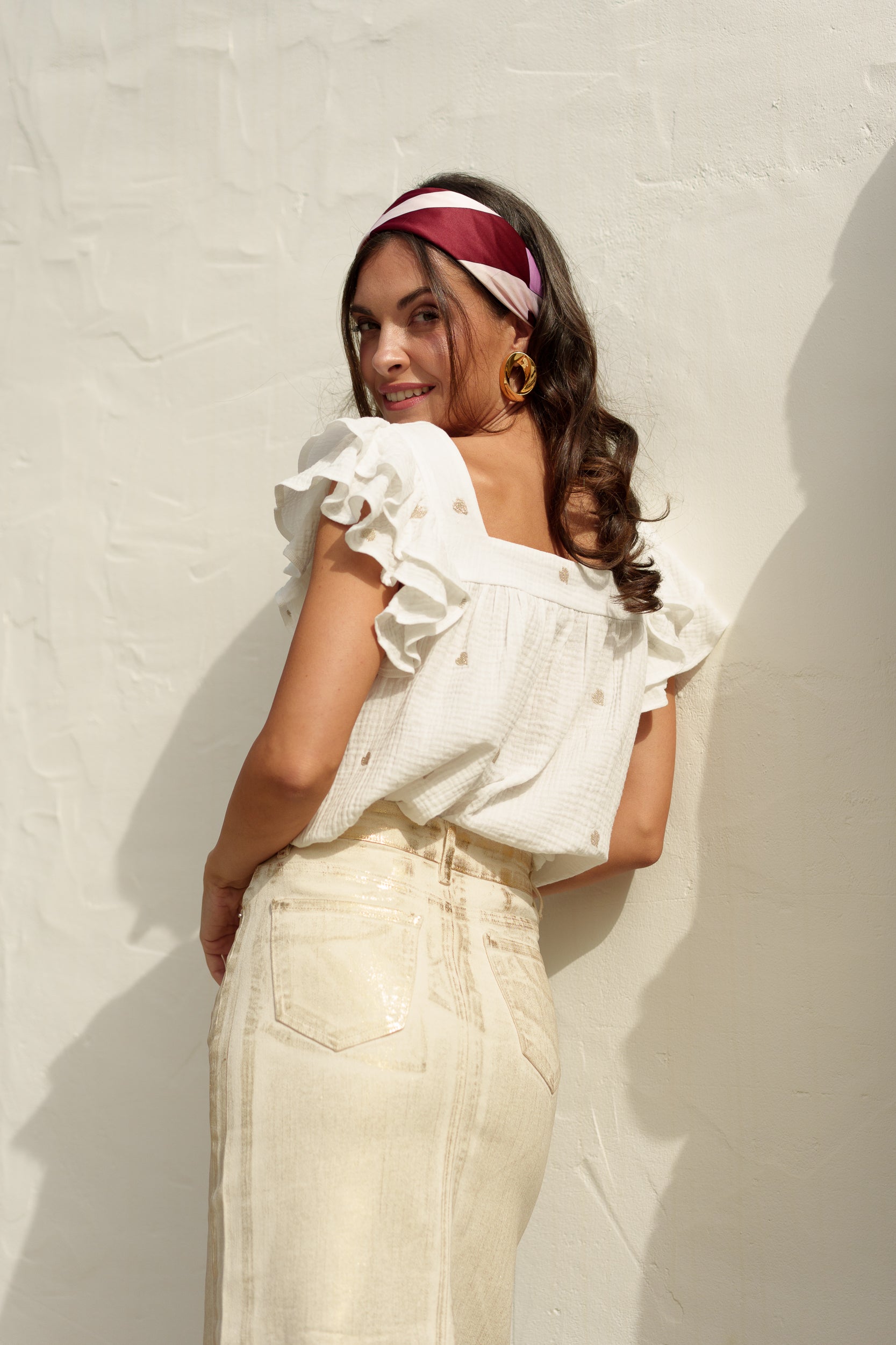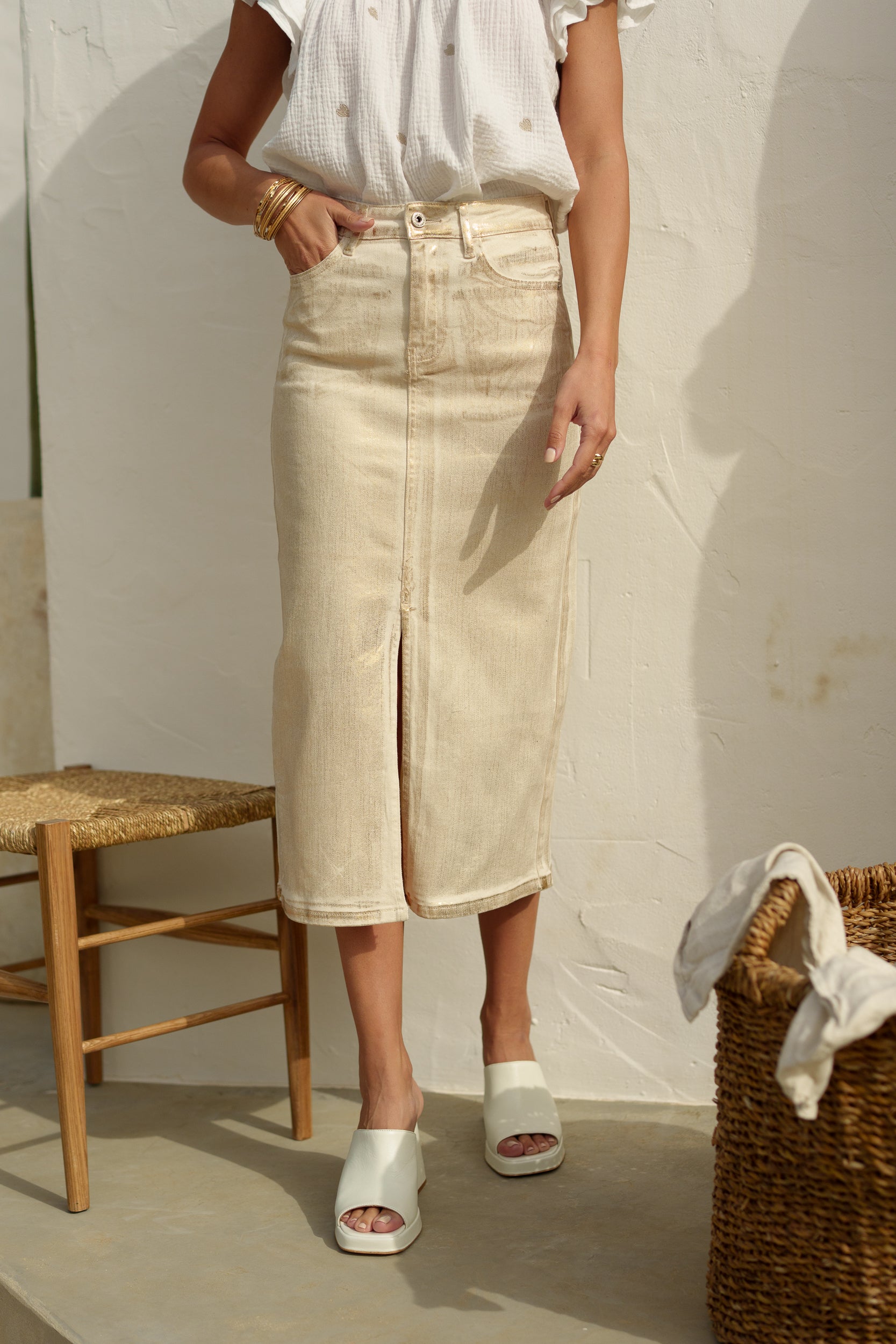 Long beige denim skirt with gold lamé threads, featuring a front slit for a touch of modernity and elegance.