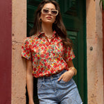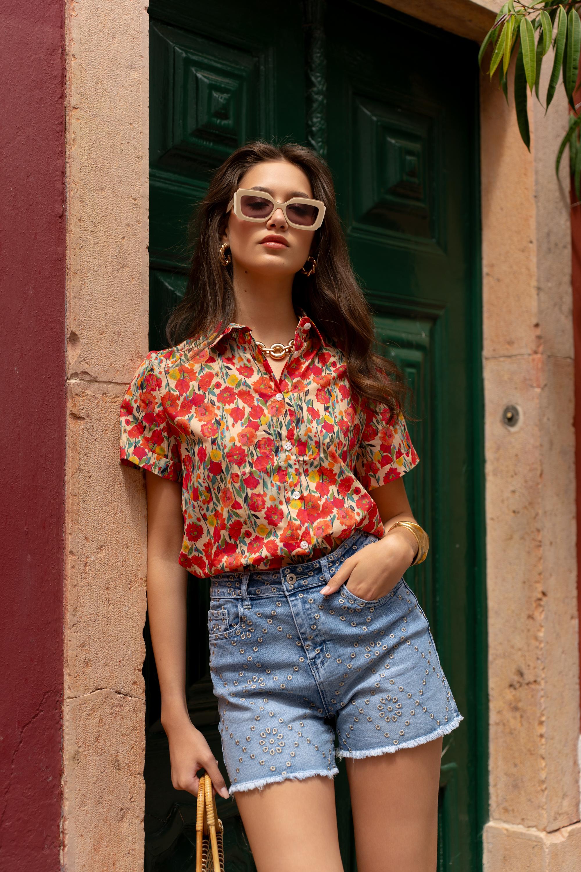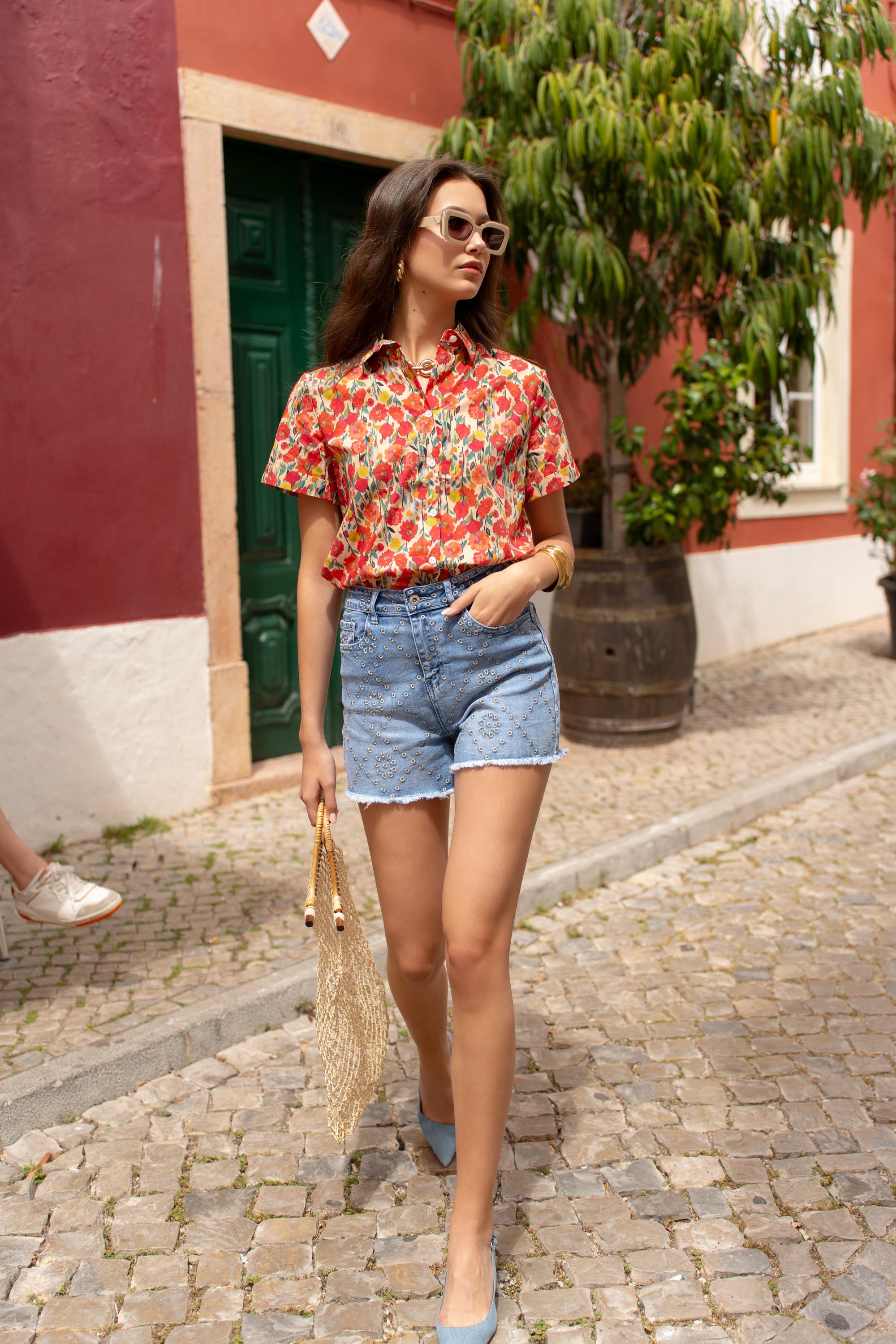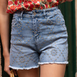 Loose cut denim shorts with full English embroidery with beige threads, adding an elegant and refined touch to this timeless basic.