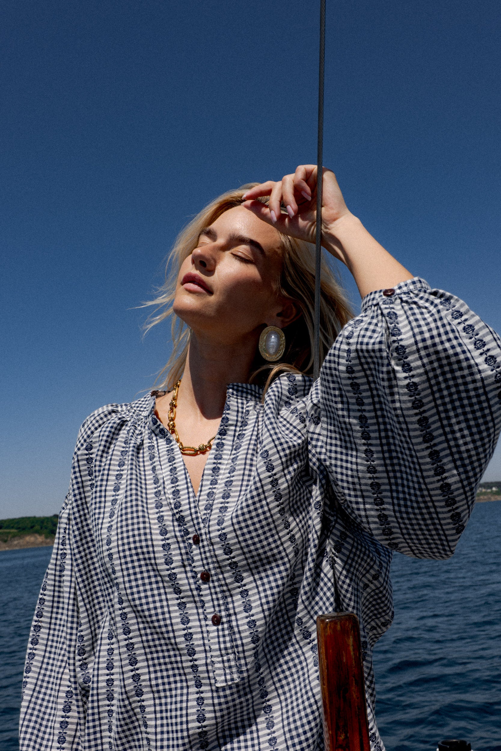 Détails : Joli vichy bleu rehaussé de délicates broderies, col volanté, patte de boutonnage discrète, finition froncée pour un esprit rétro