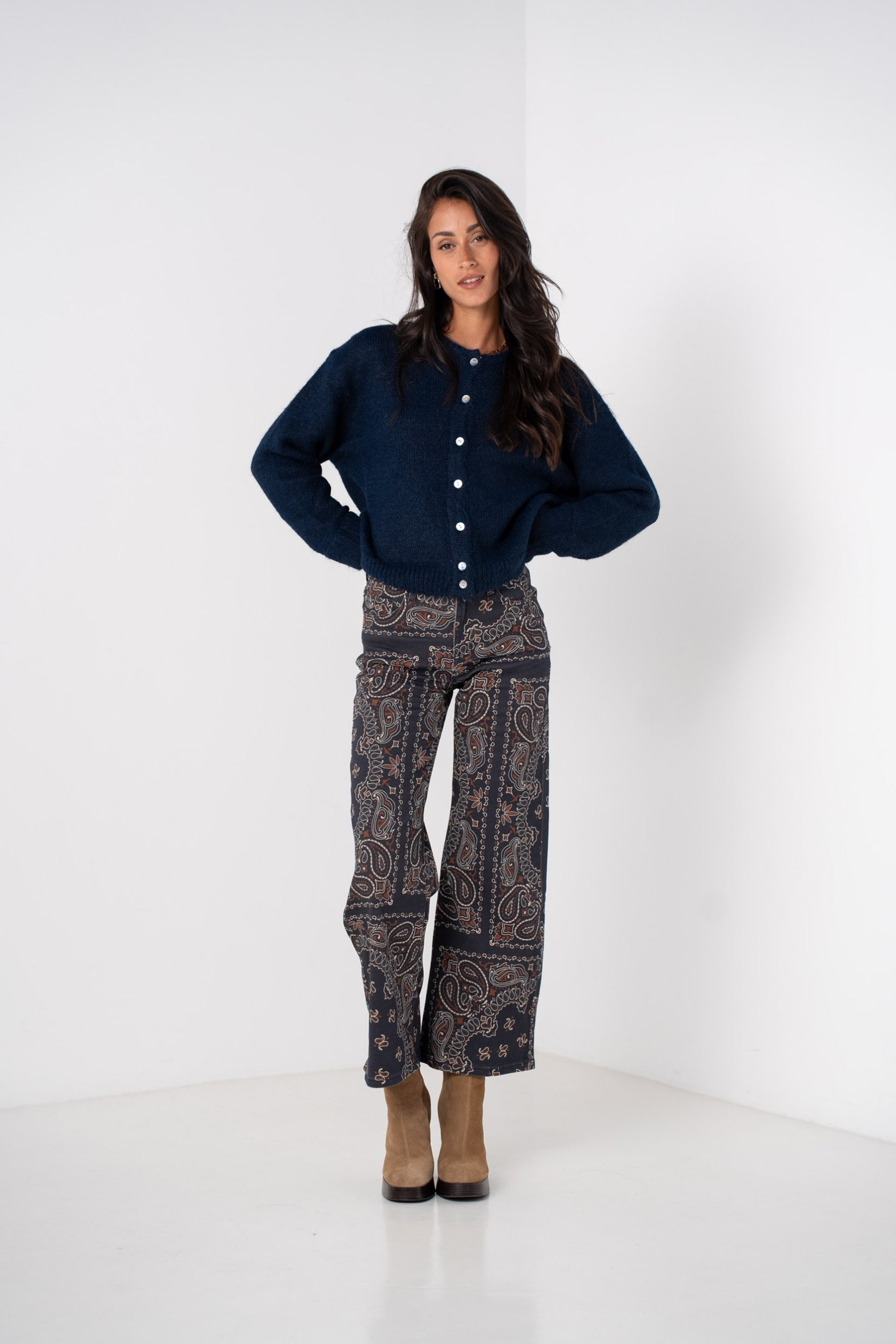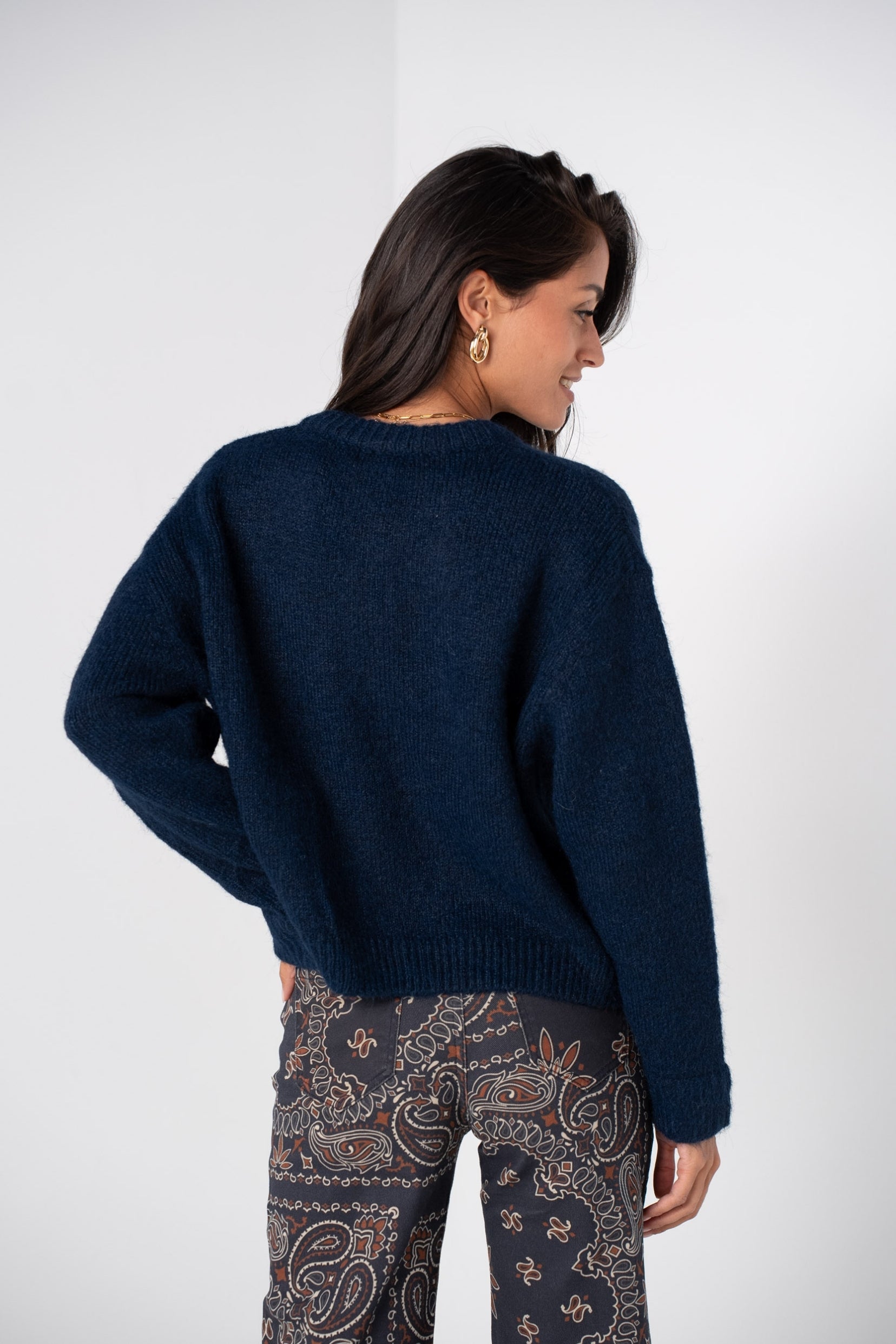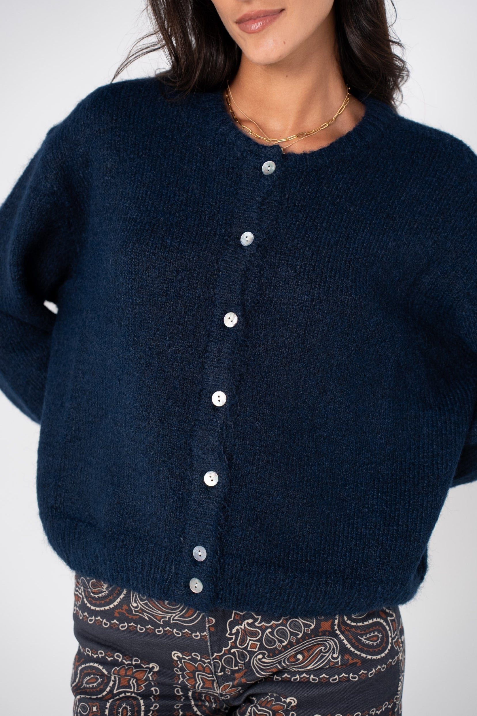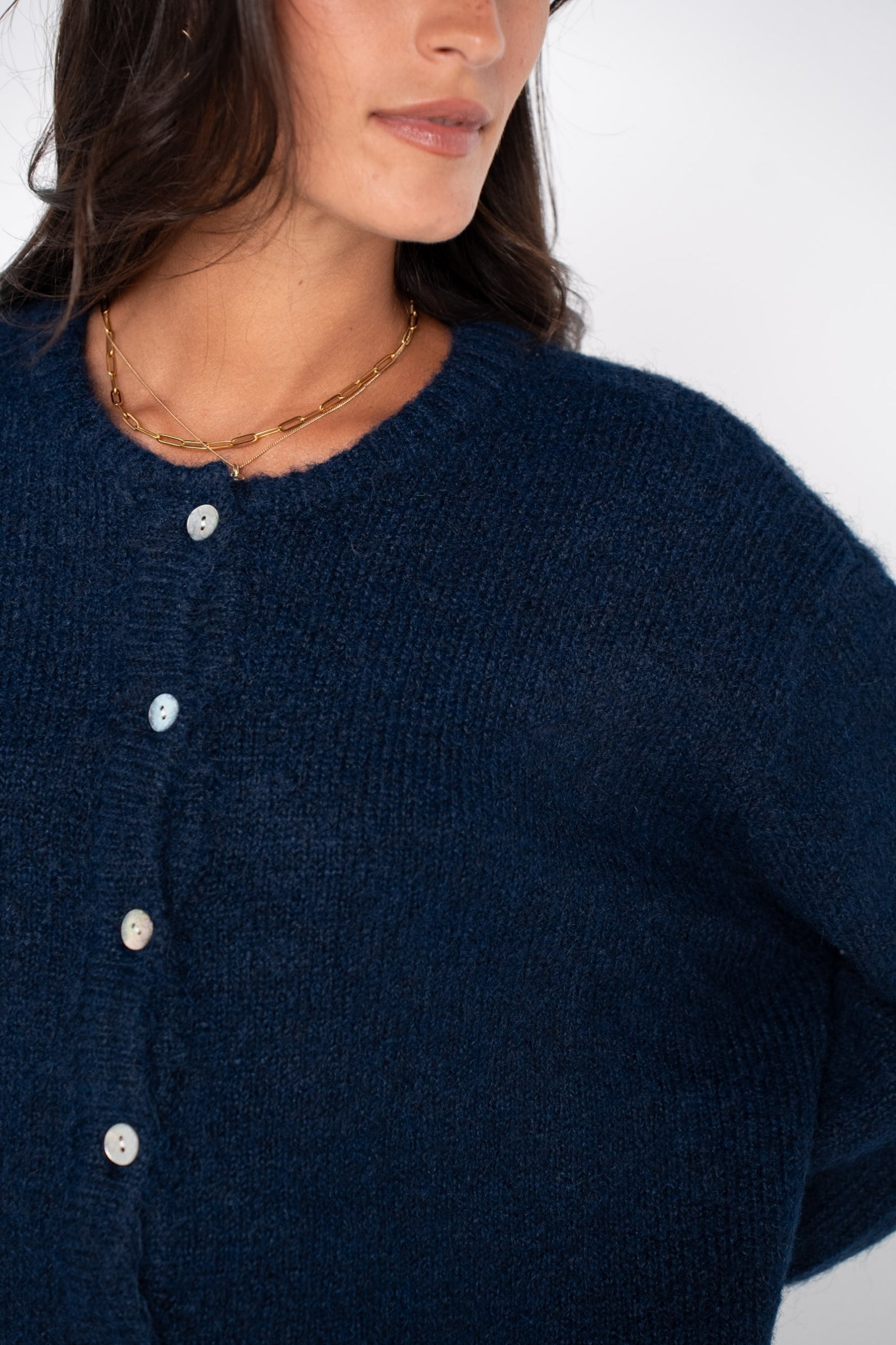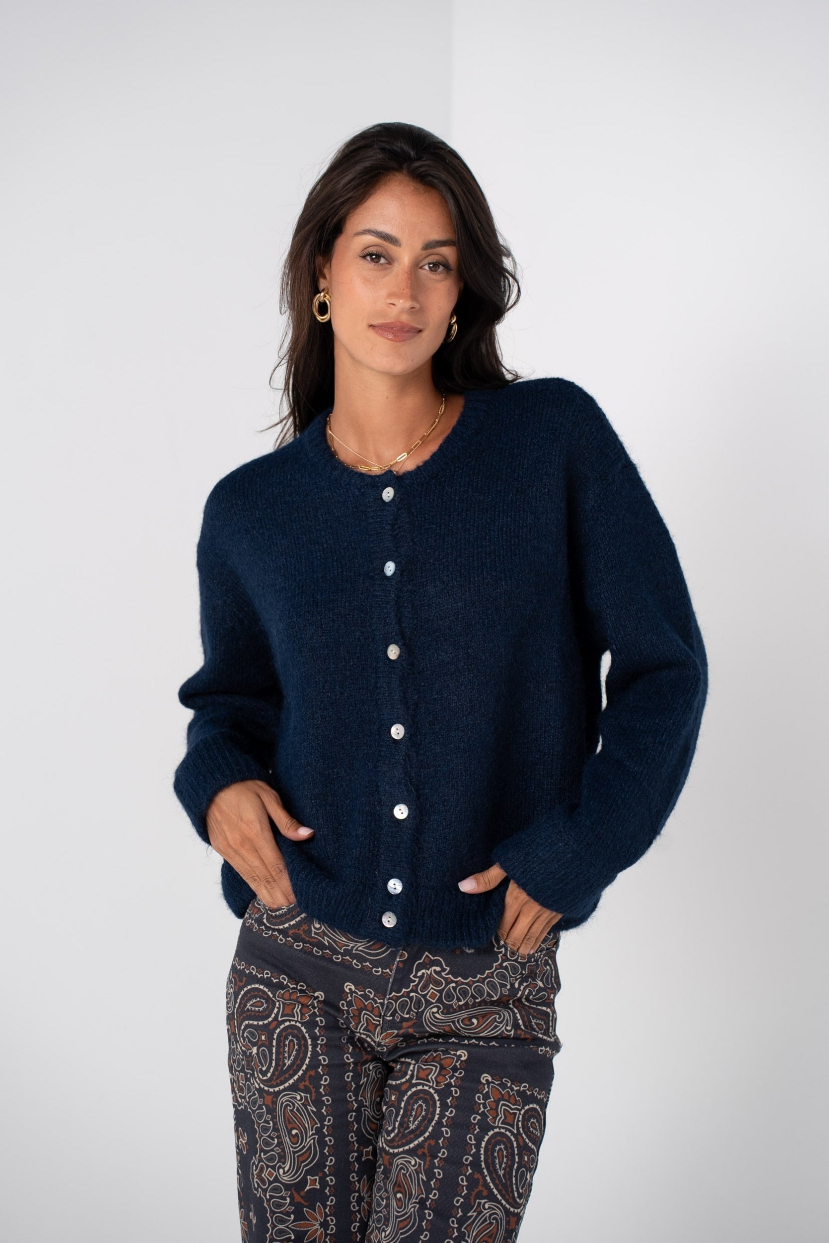 Maille duveteuse et chaude, coloris bleu marine profond. Patte de boutonnage discrète, finitions travaillées en bords-côtes.