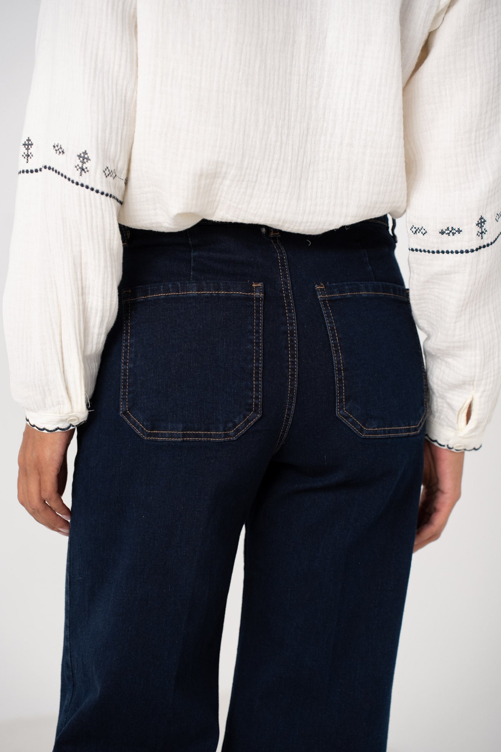 Taille haute, jambe large et fluide pour une allure structurée mais décontractée.