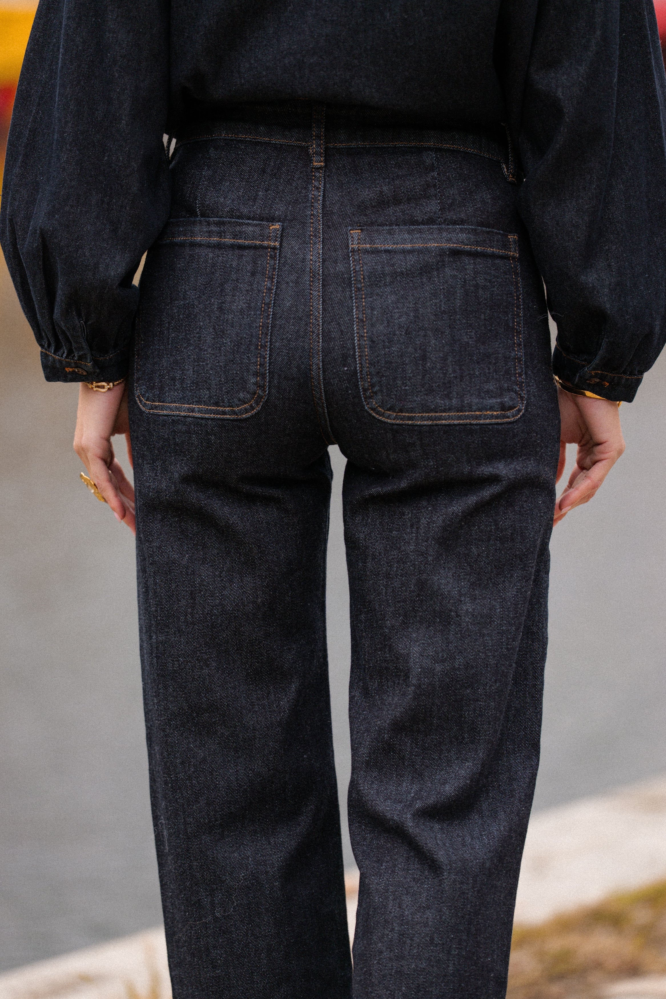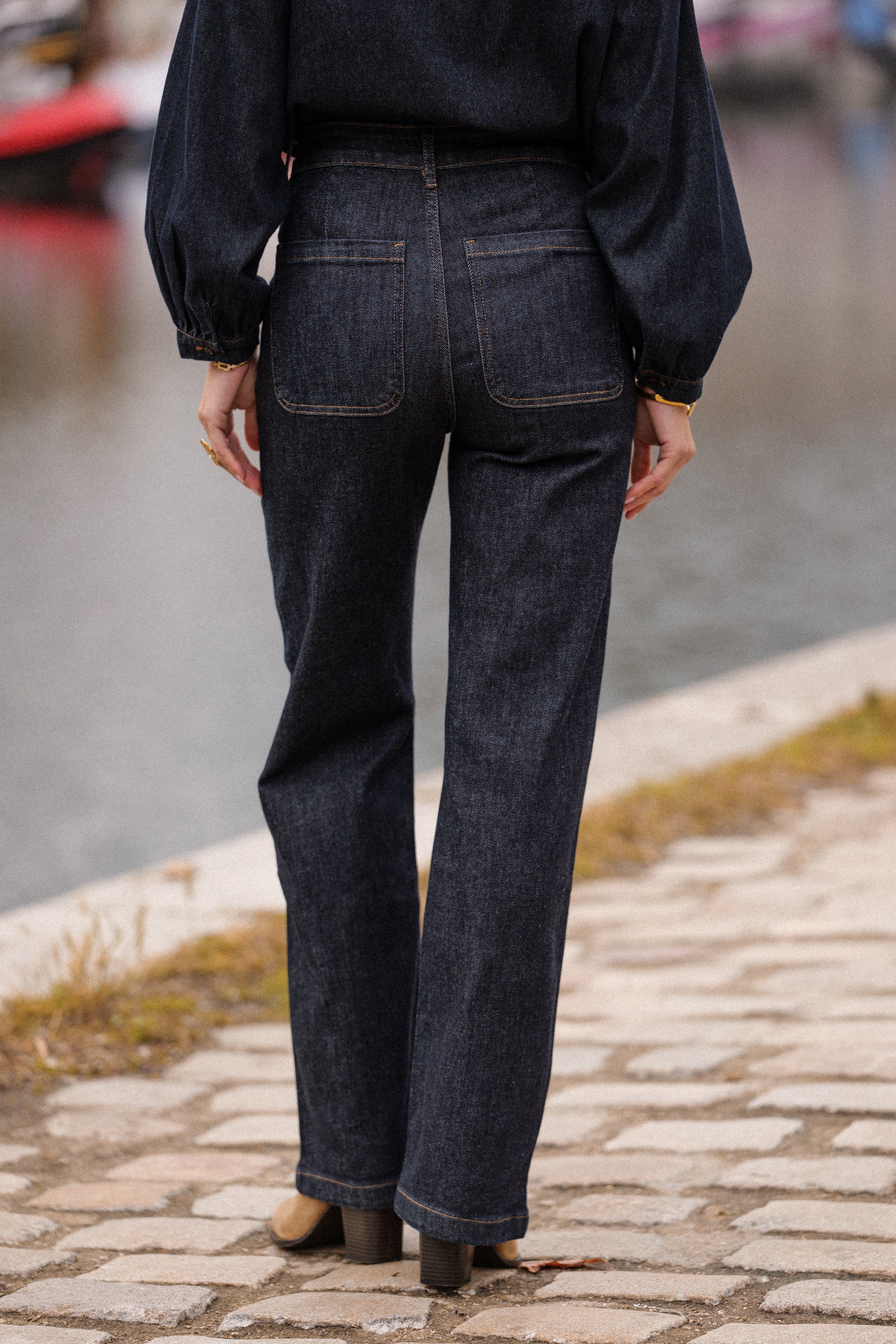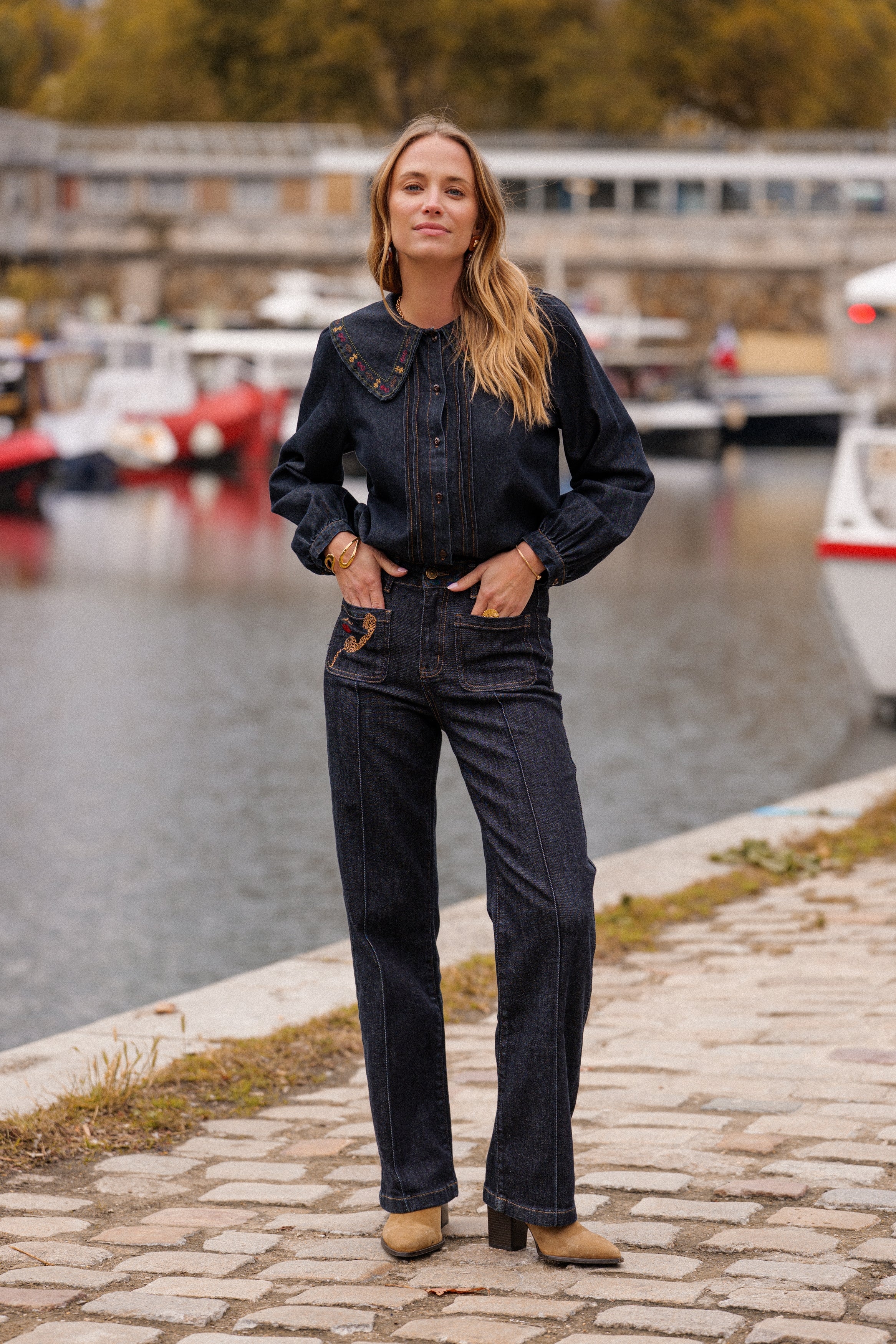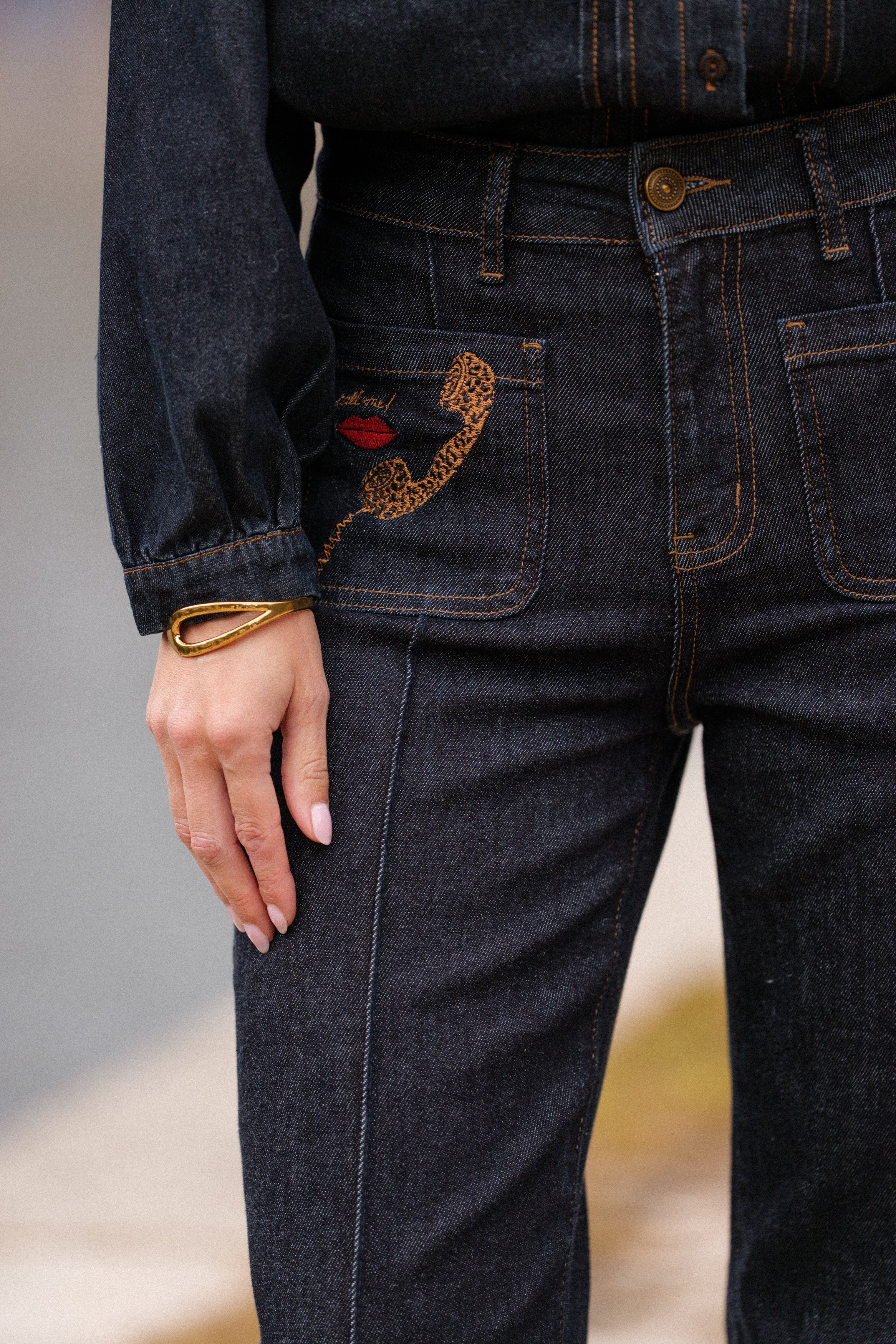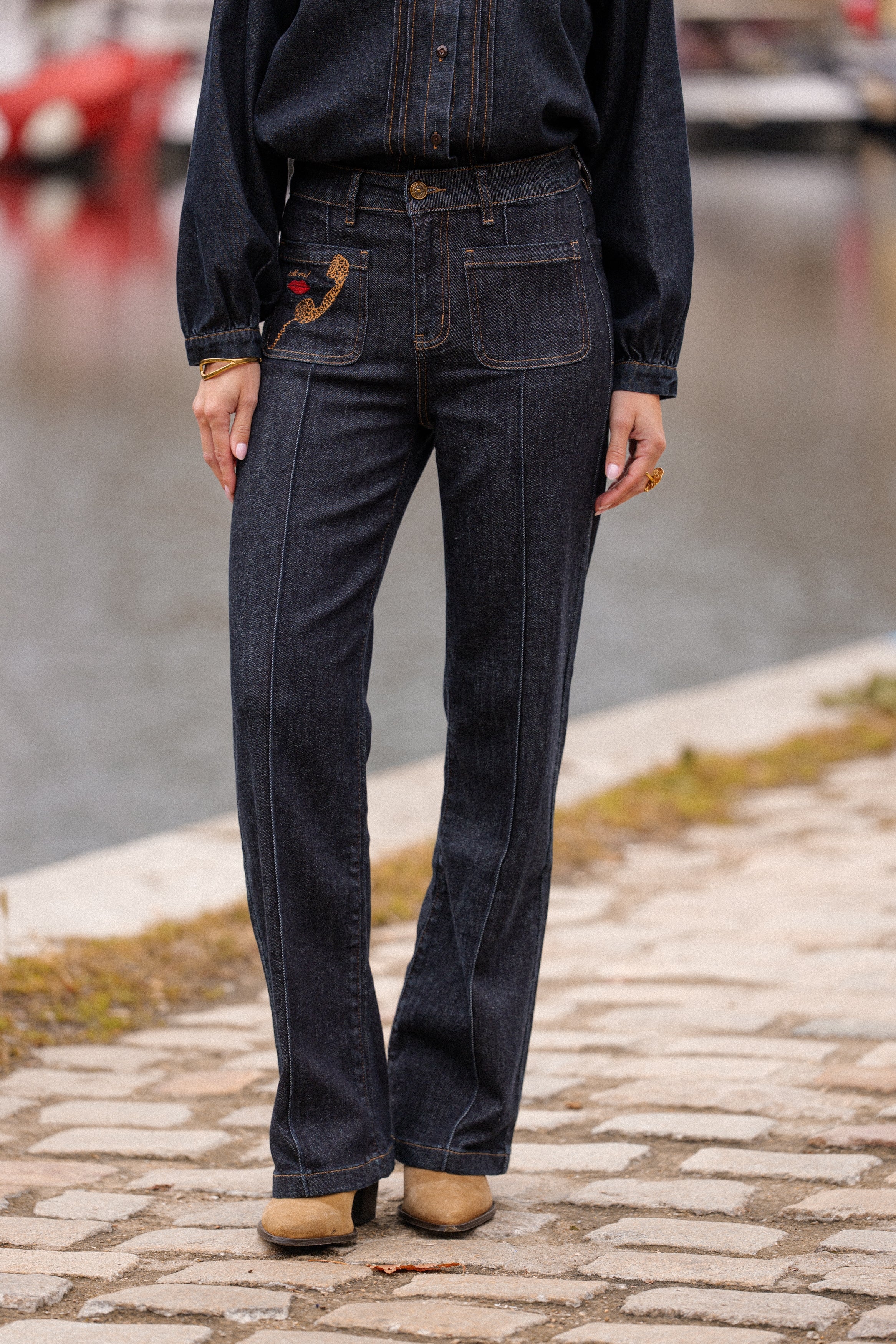 Détails : Broderie bouche et foulard sur la poche, pinces allongeantes sur jambe, denim brut structurant