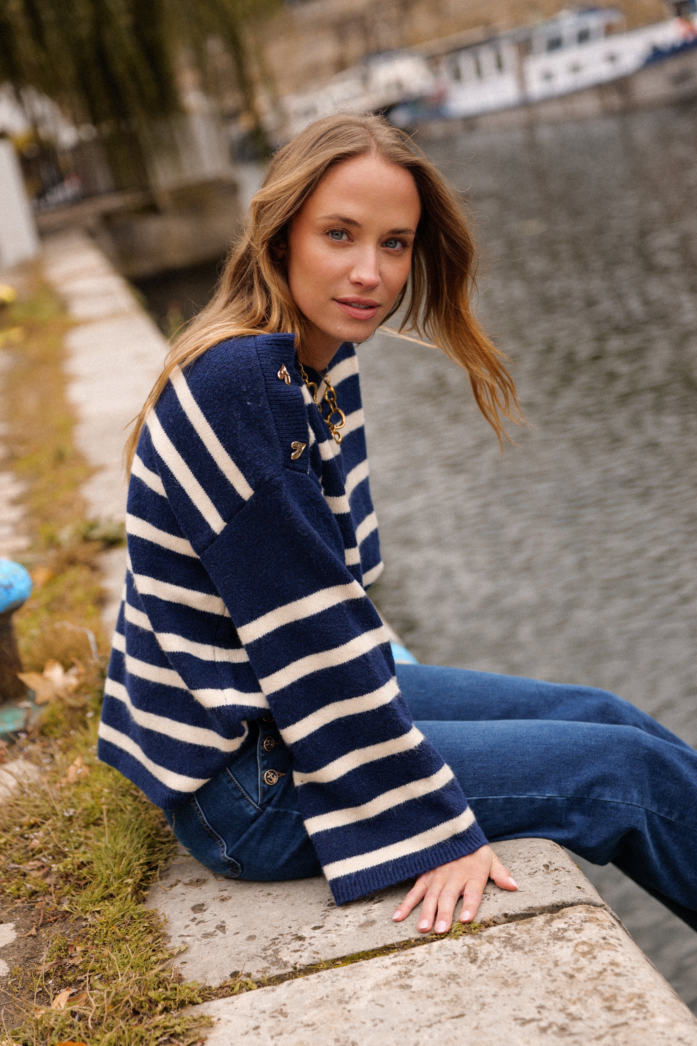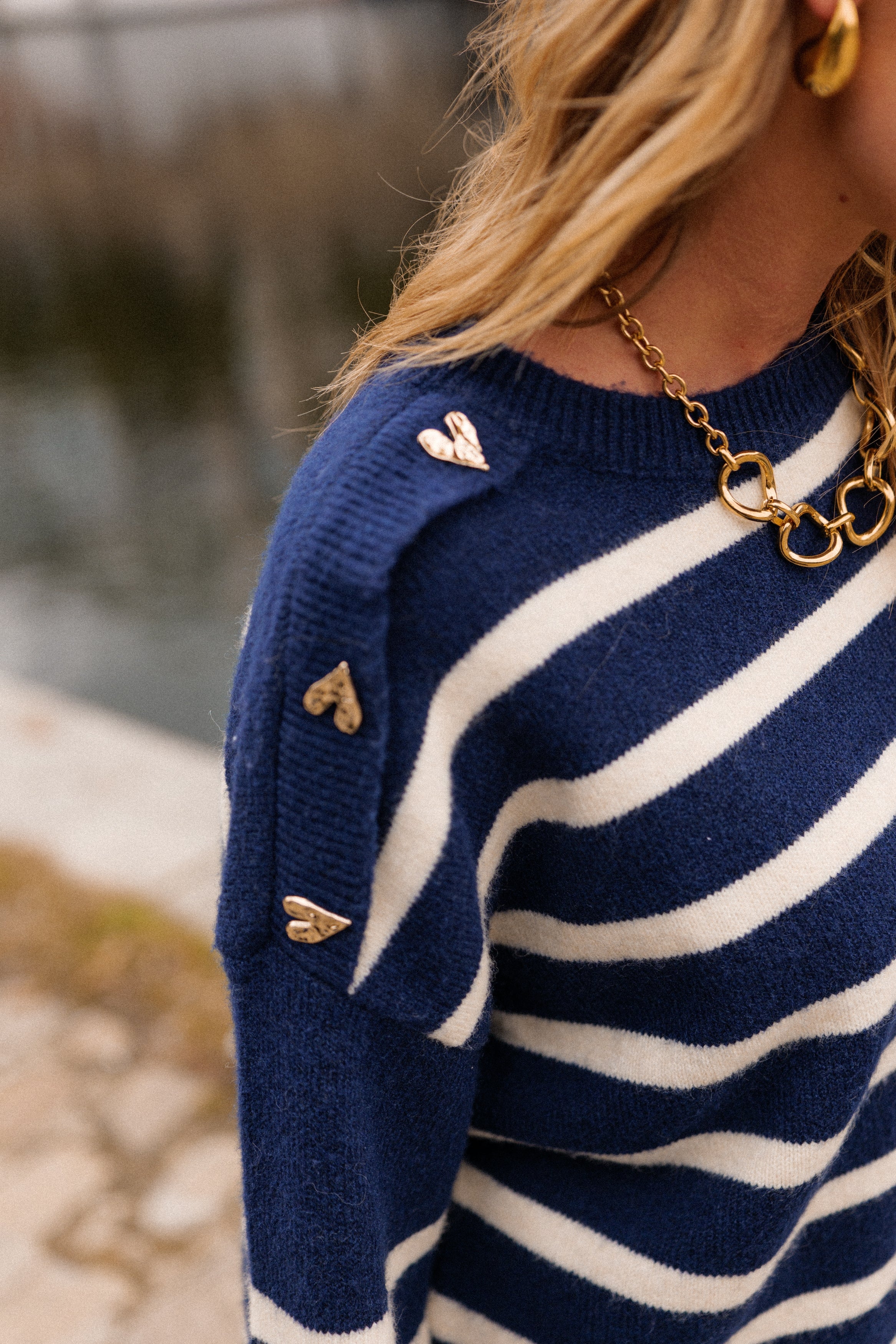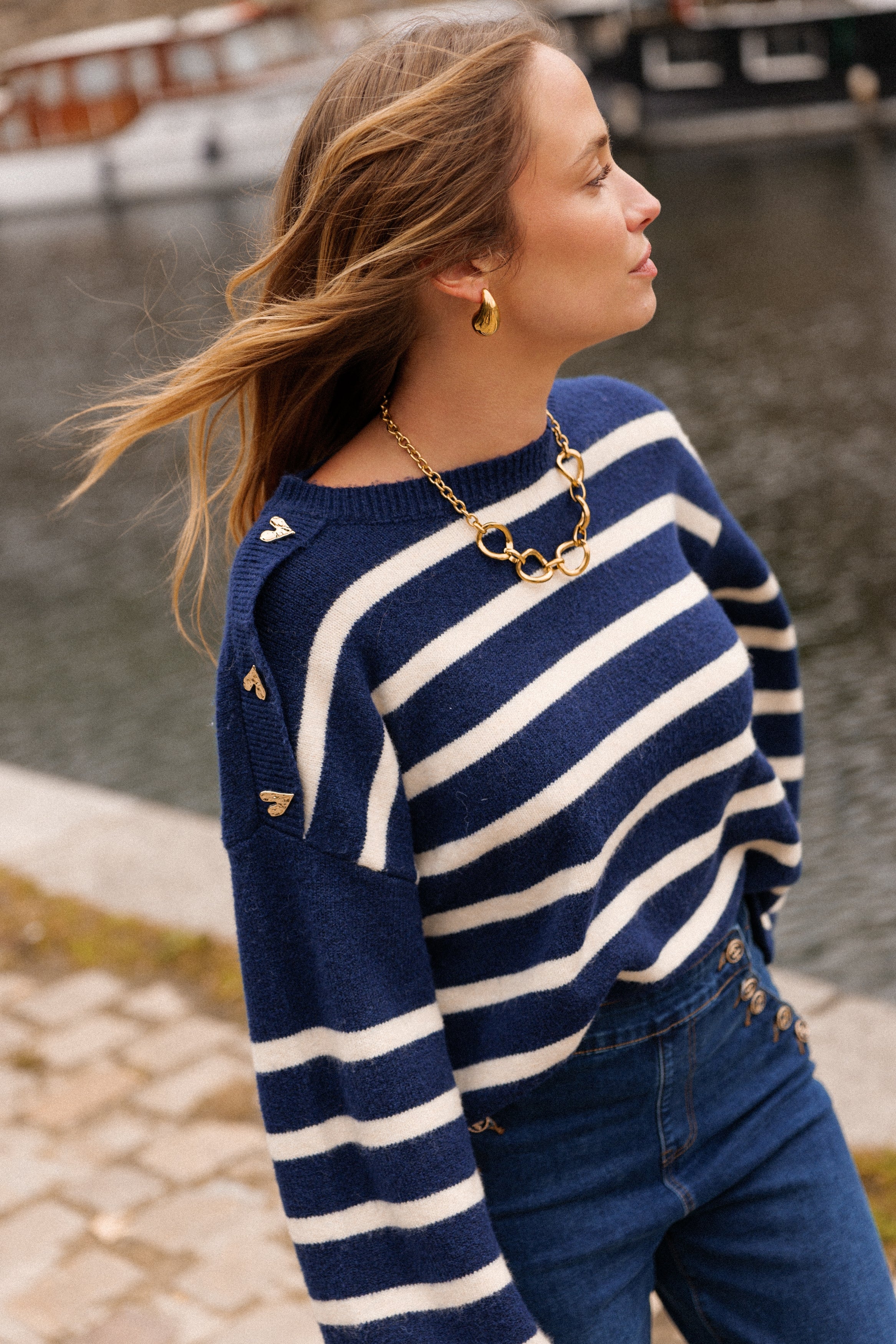 Détails : Rayures esprit marinière, boutons dorés en forme de cœur sur l’épaule