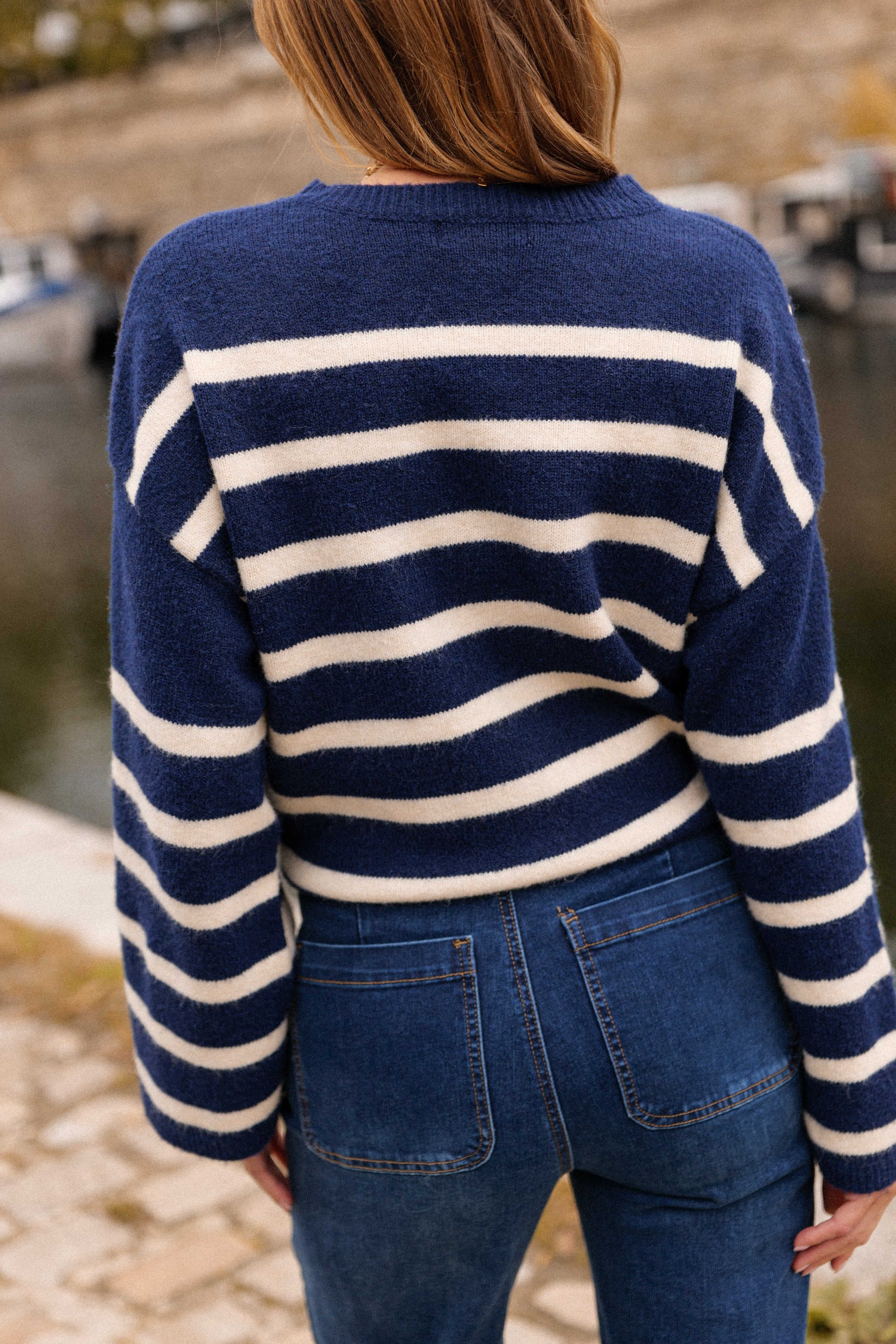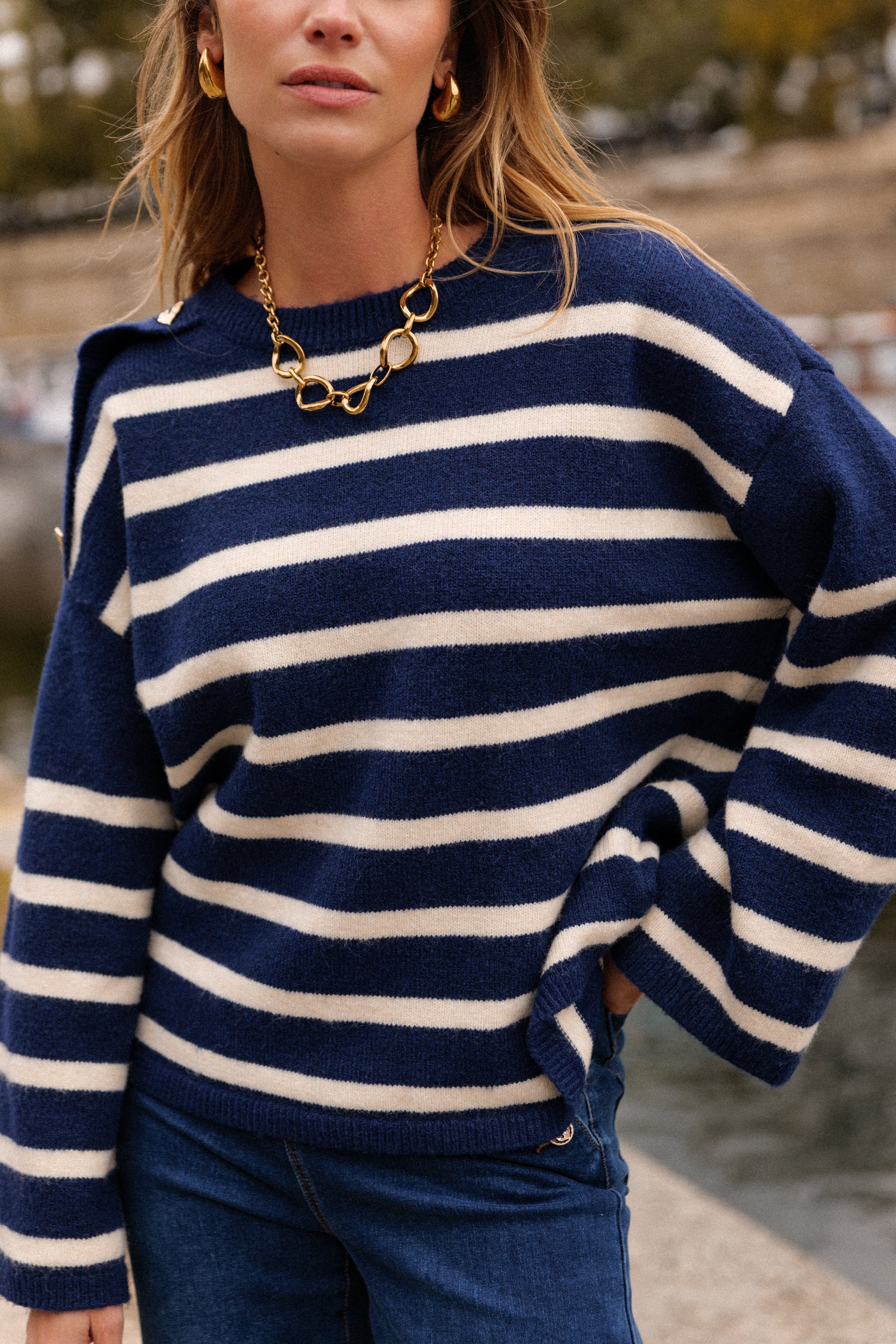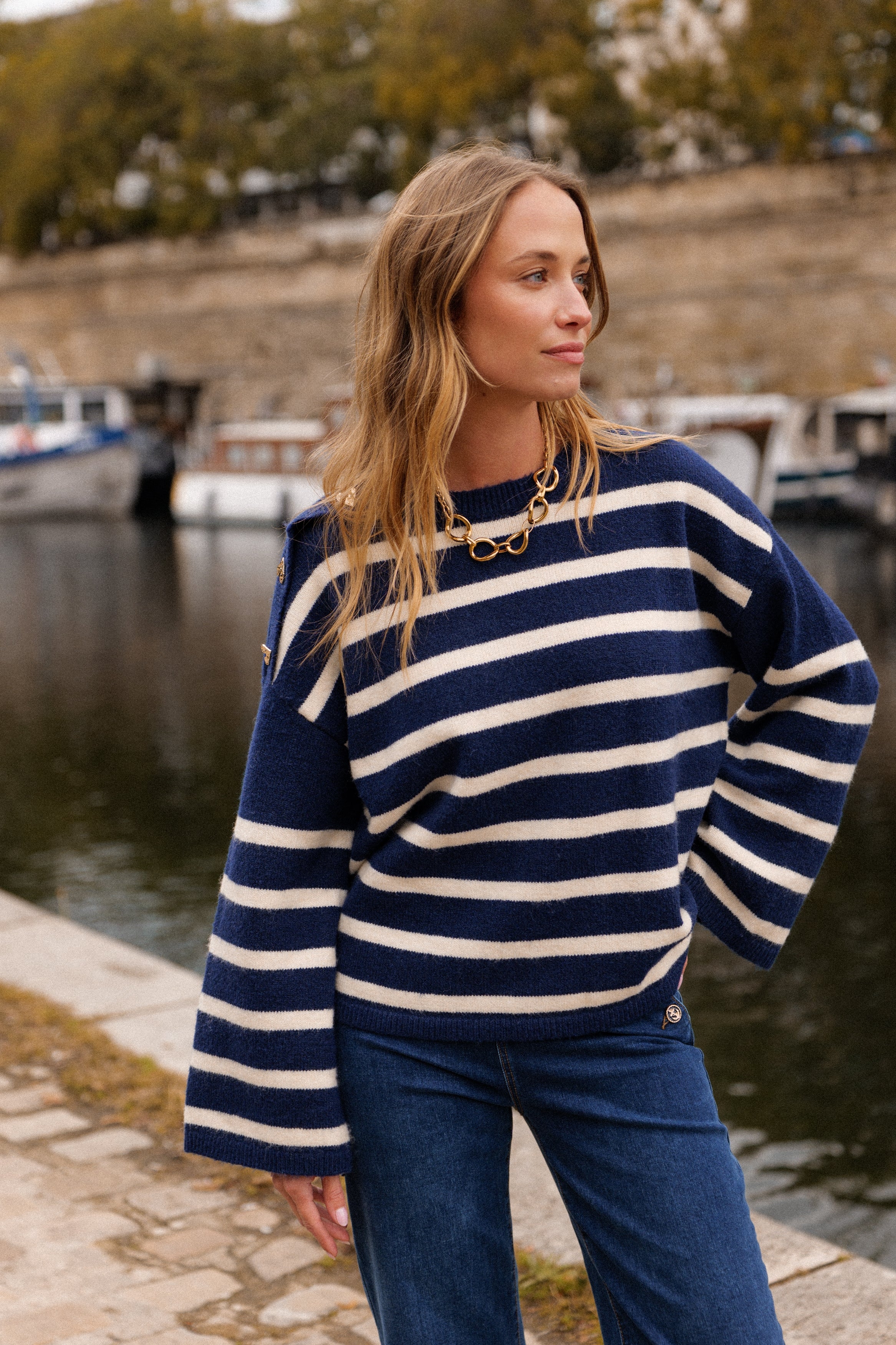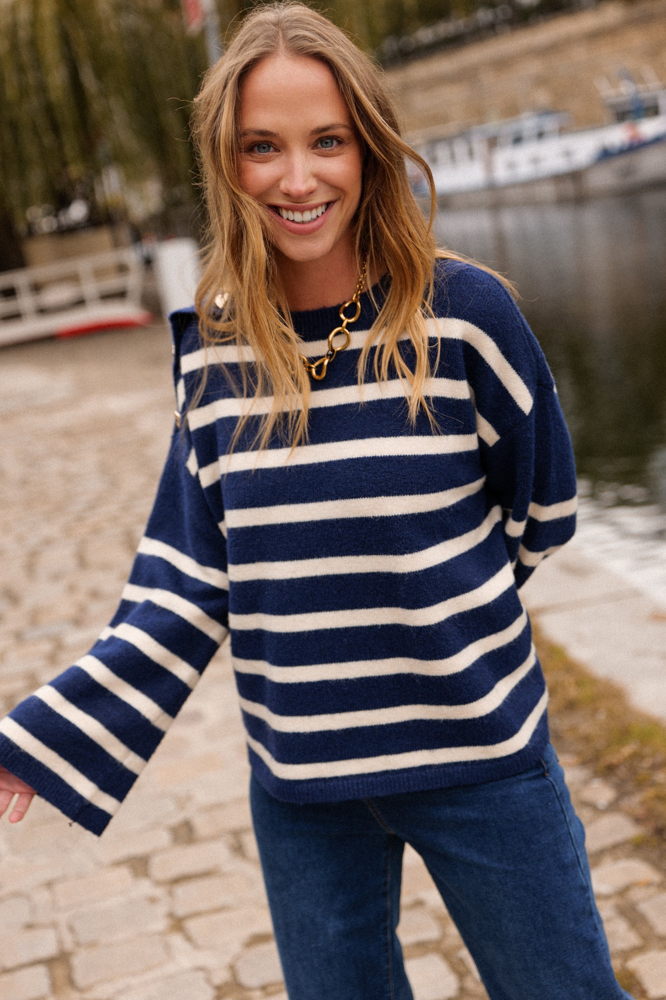 Détails : Rayures esprit marinière, boutons dorés en forme de cœur sur l’épaule