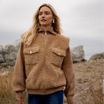 Détails : Corps en fausse fourrure bouclée toute douce, manches en maille côtelée ton sur ton, poches à rabat esprit utility chic, fermeture zippée dorée.