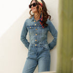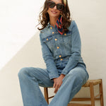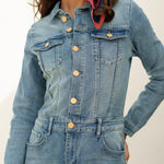 Stretch cotton denim jumpsuit for optimal comfort. Accented with jeweled gold buttons for an extra touch of elegance. The cut of the legs is loose for a modern and relaxed style.