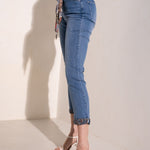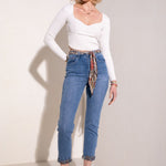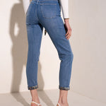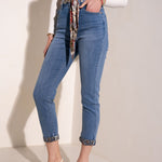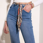 Mom pants with printed cuffs and printed belt. Belt loop. Jeans pockets.