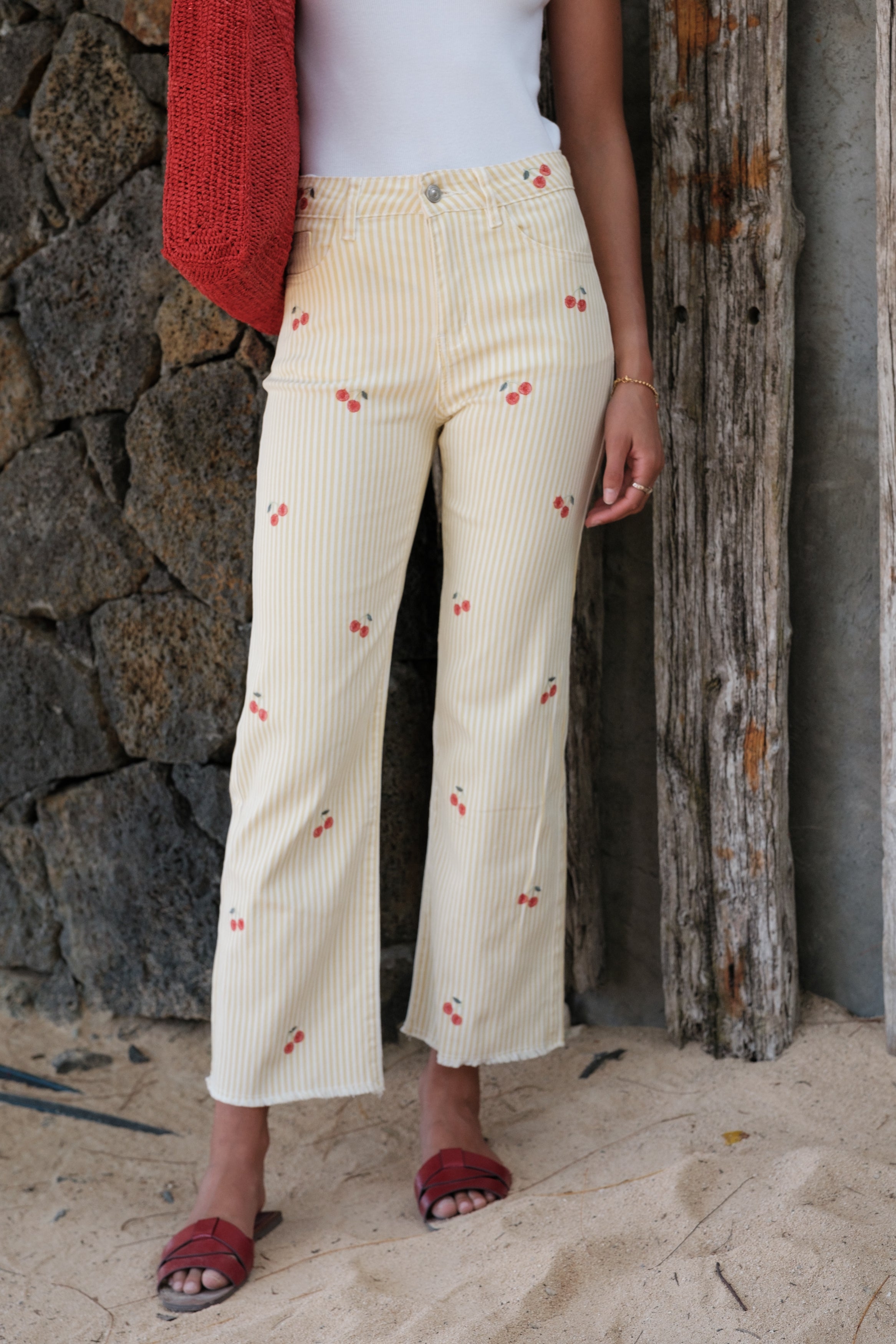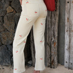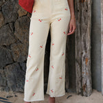 Petites cerises brodées ton sur ton rouge, délicates et régulières.