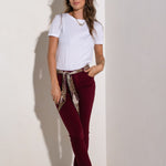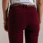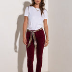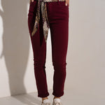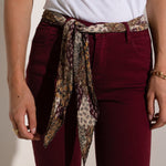Louisa organic cotton canvas pants in burgundy color, accompanied by its scarf-belt as a timeless accessory.