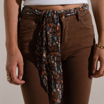 Sivetha organic cotton canvas pants in bottle chocolate color, accompanied by its scarf-belt as a timeless accessory.