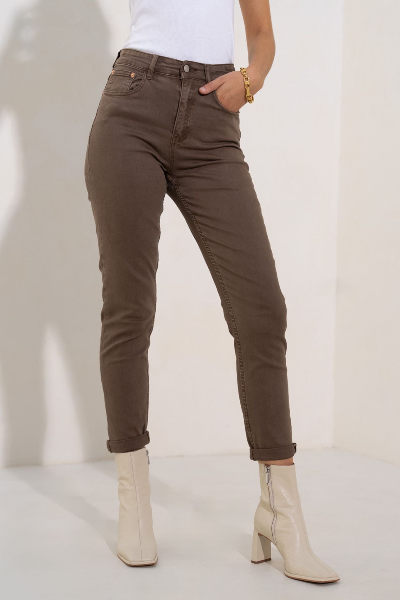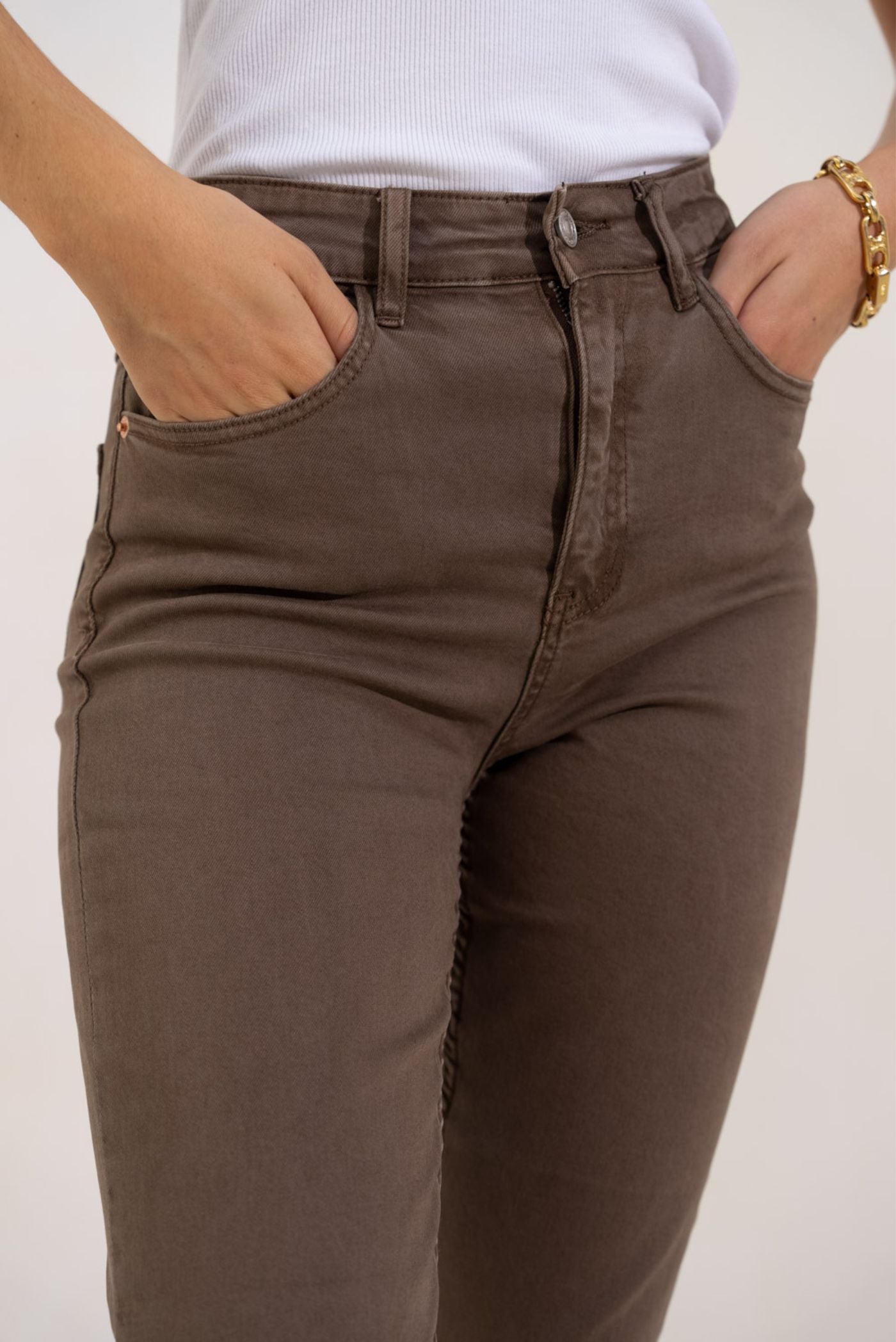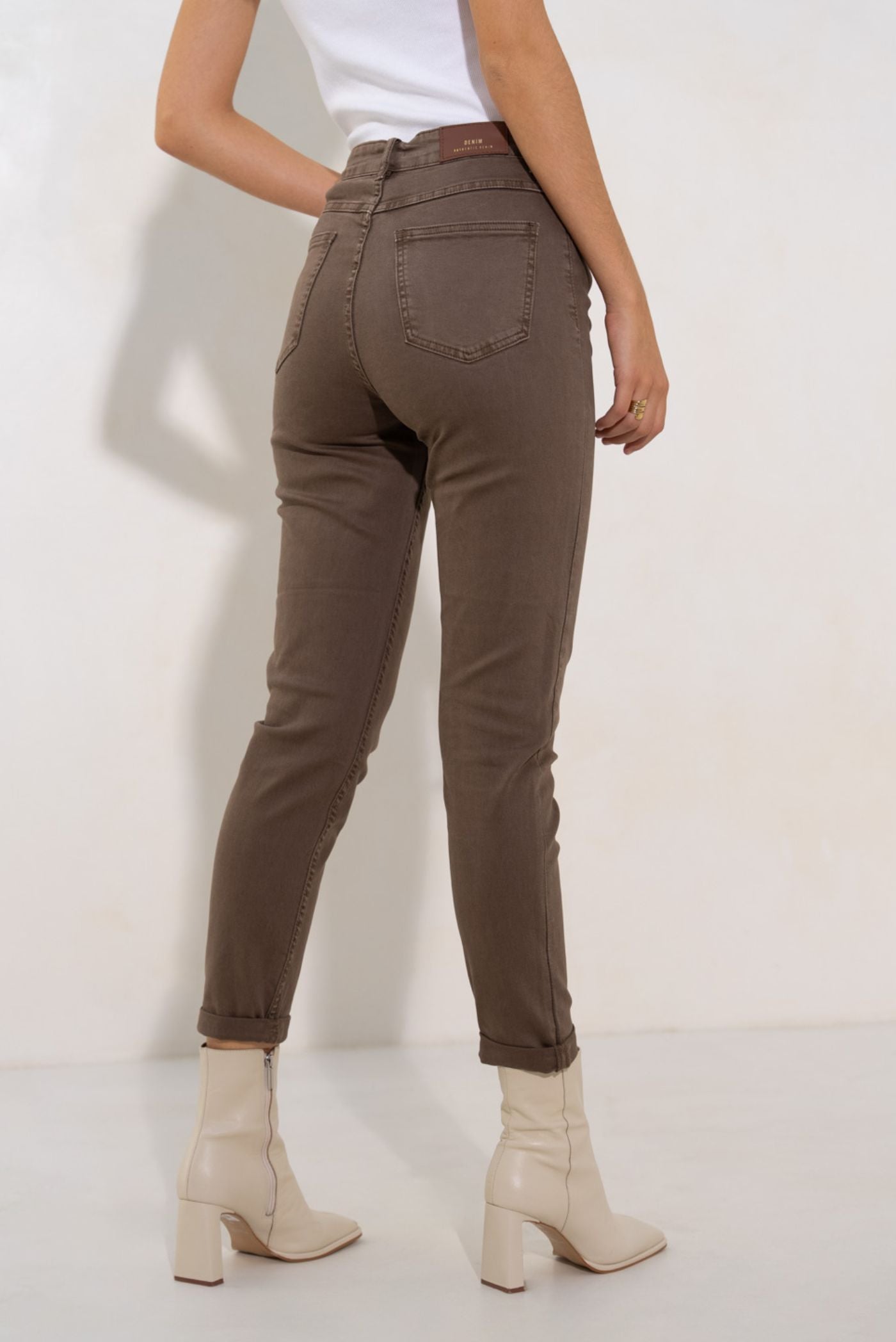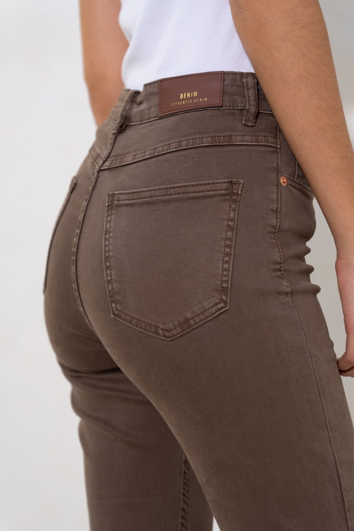 - Design: High-waisted pants that slim the hips, taupe-colored denim canvas.