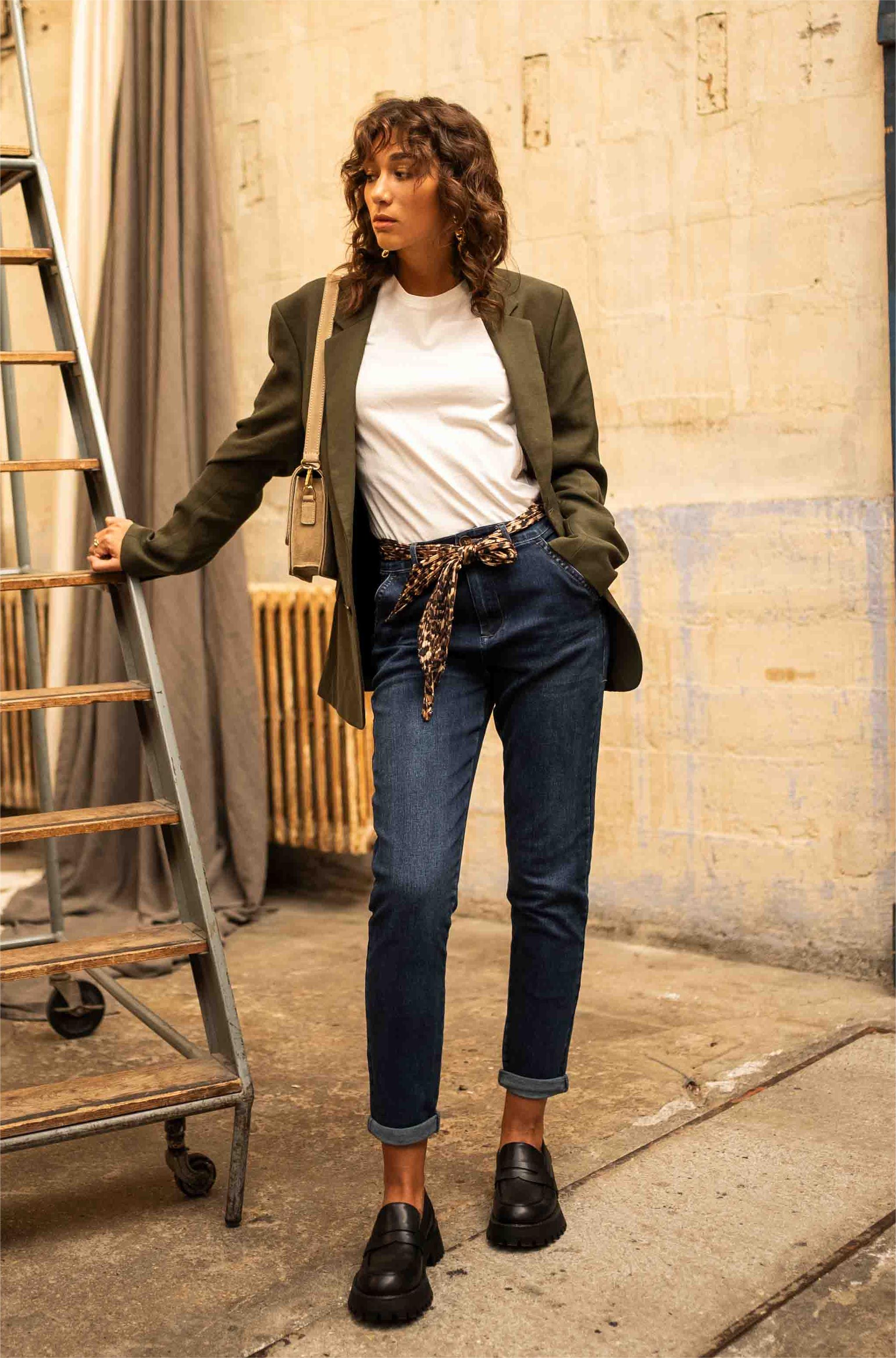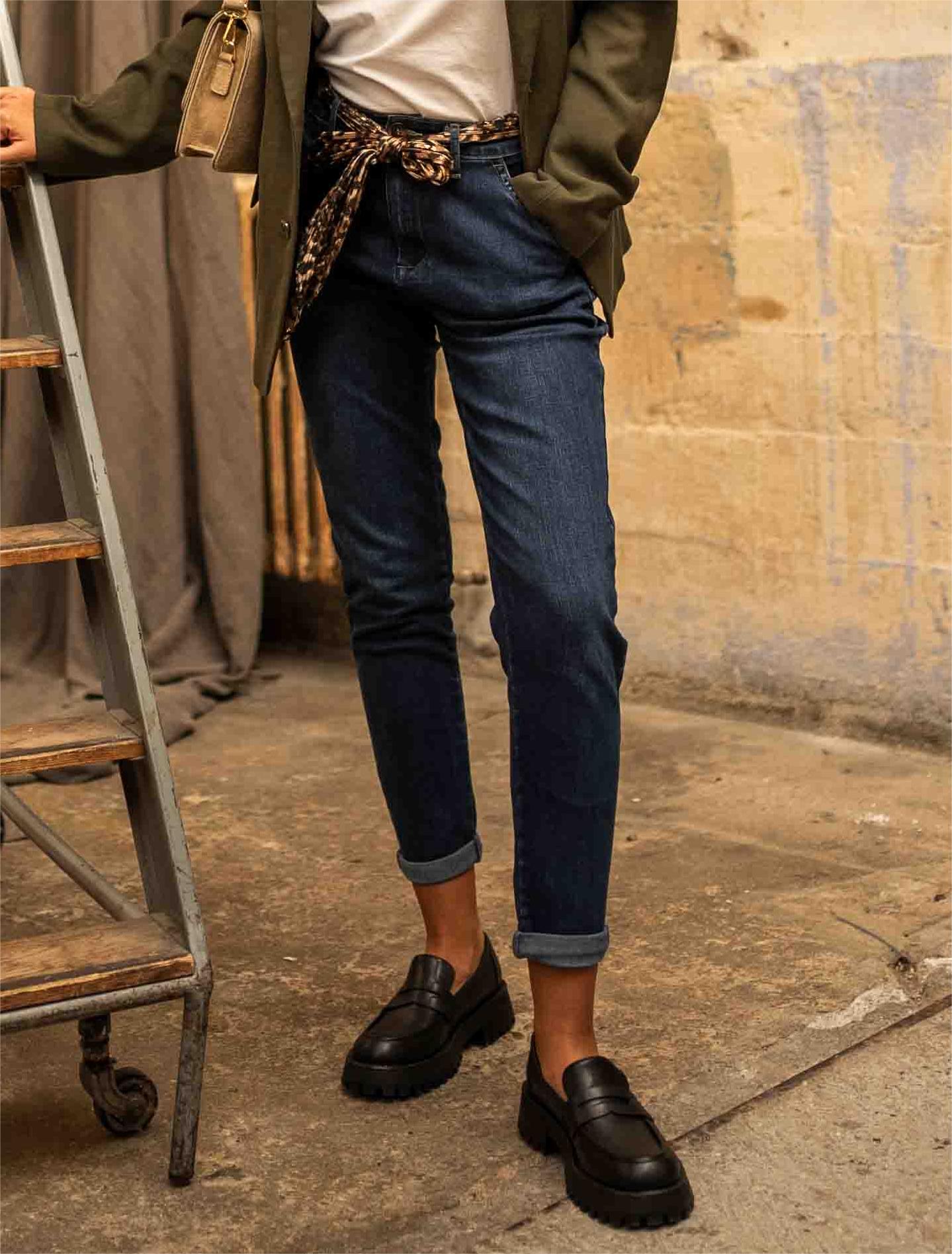 Pantalón chino denim, corte mom fit en lona de algodón.