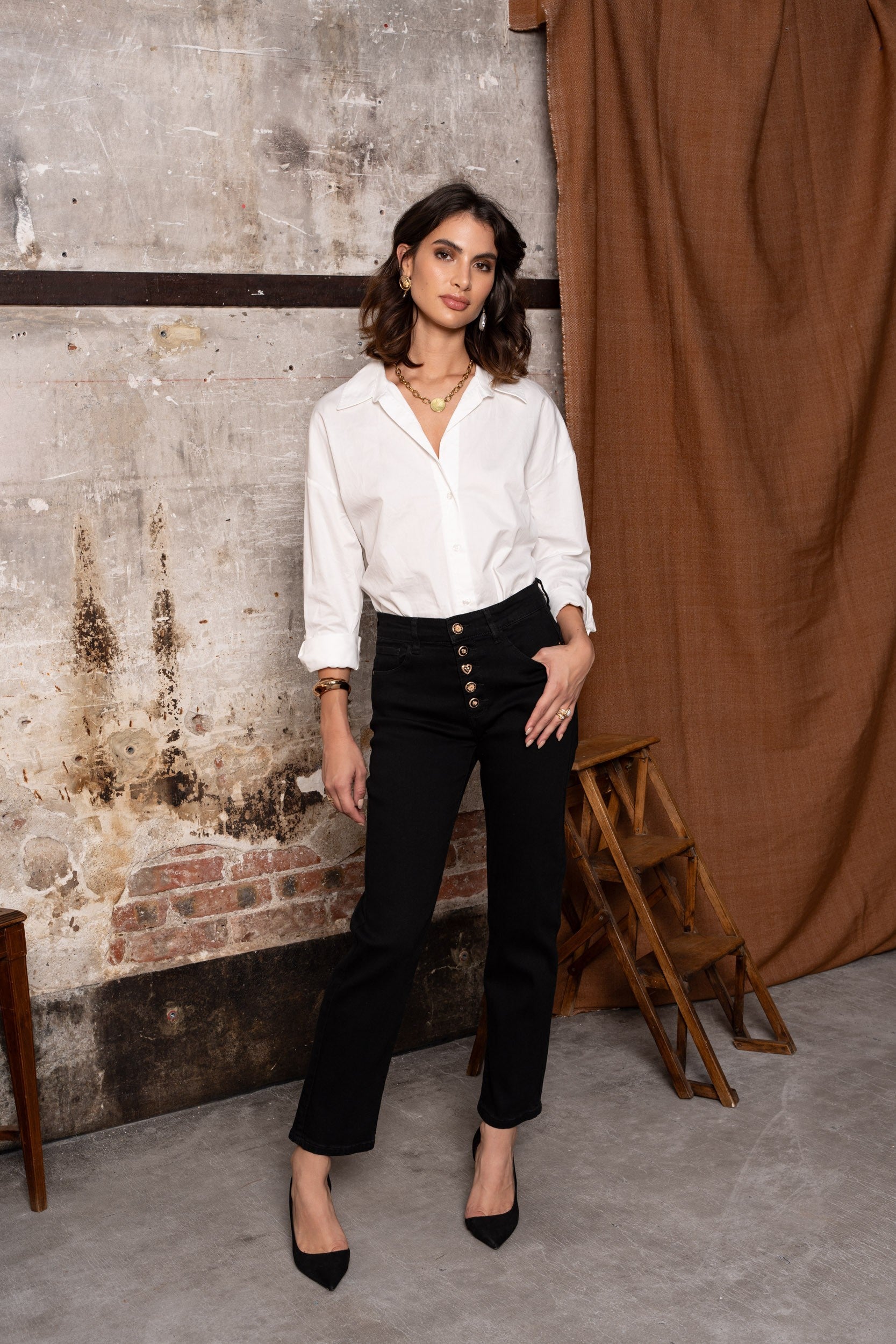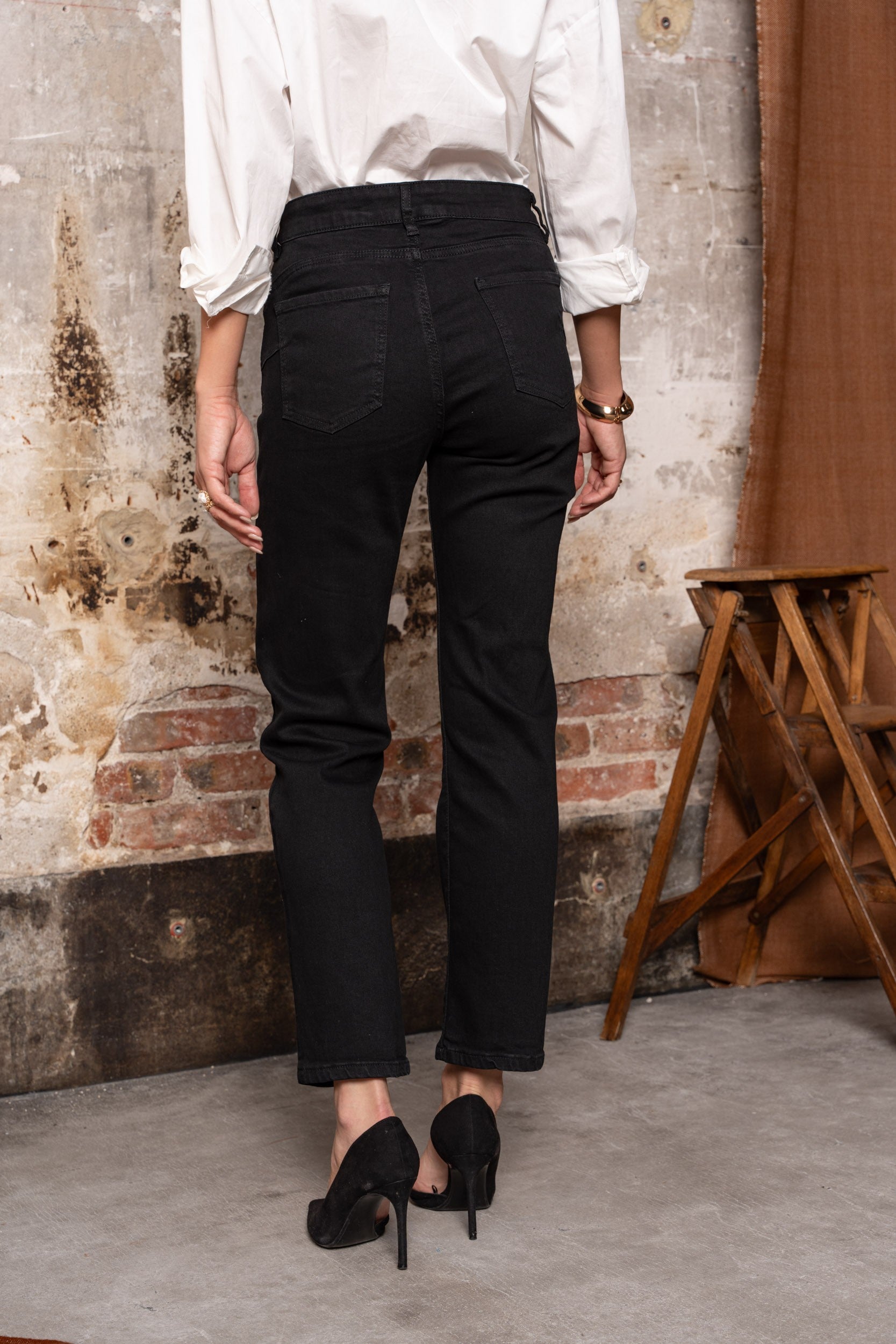 Jeans negros de corte recto, apertura con botones dorados lacados en negro, decorados con tinta azul marino, motivos de corazones y flores.