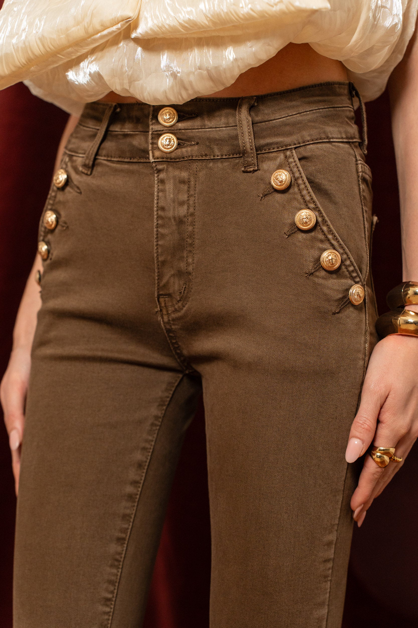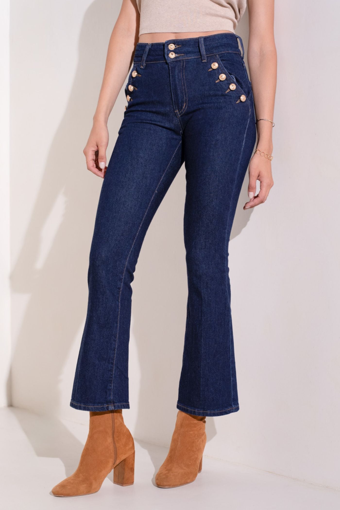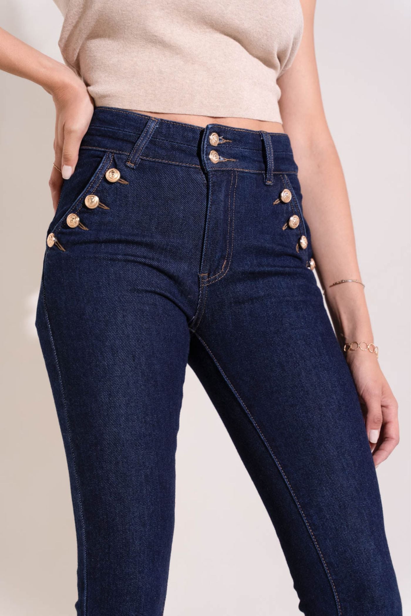 - Diseño: Pantalón vaquero azul crudo con 4 bolsillos y cremallera. Botones dorados de cintura media
