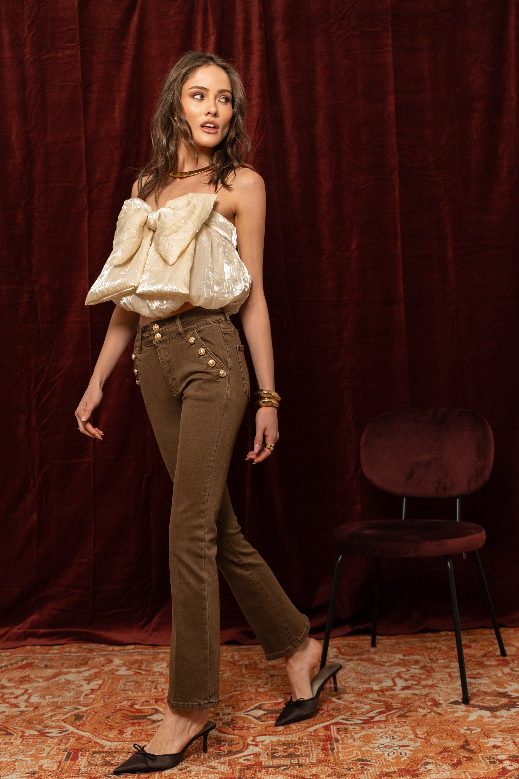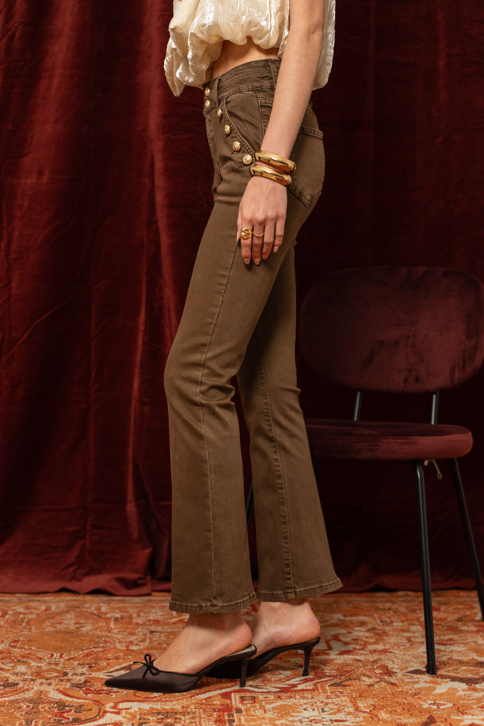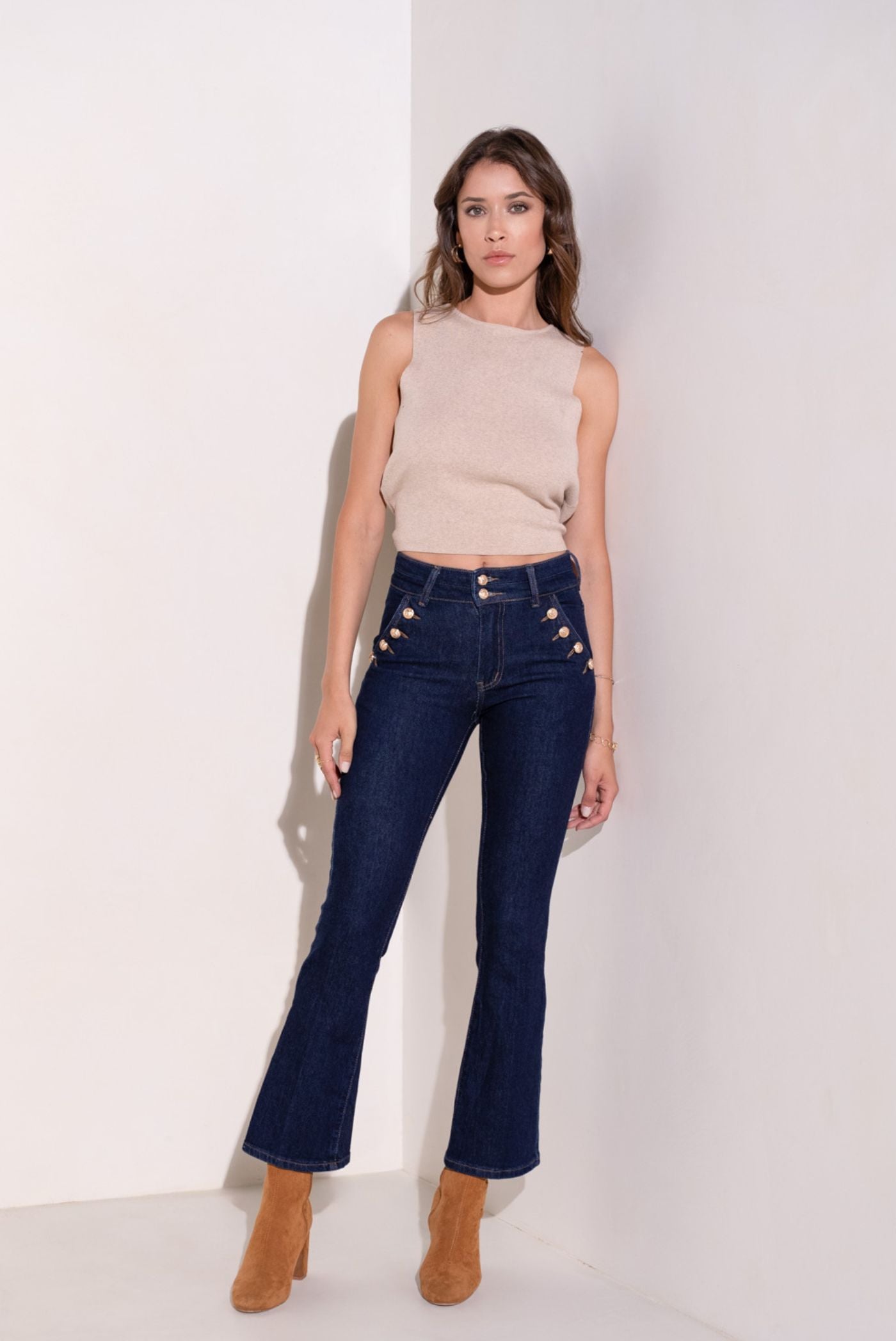 - Diseño: Pantalón vaquero azul crudo con 4 bolsillos y cremallera. Botones dorados de cintura media