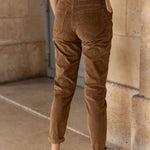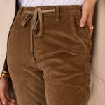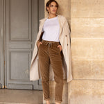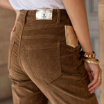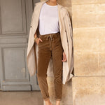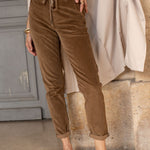 Pantalon mom fit en velours de coton stretch , avec fermeture par zip et bouton, agrémenté d'une ficelle de resserrage. Coupe casual et confortable.