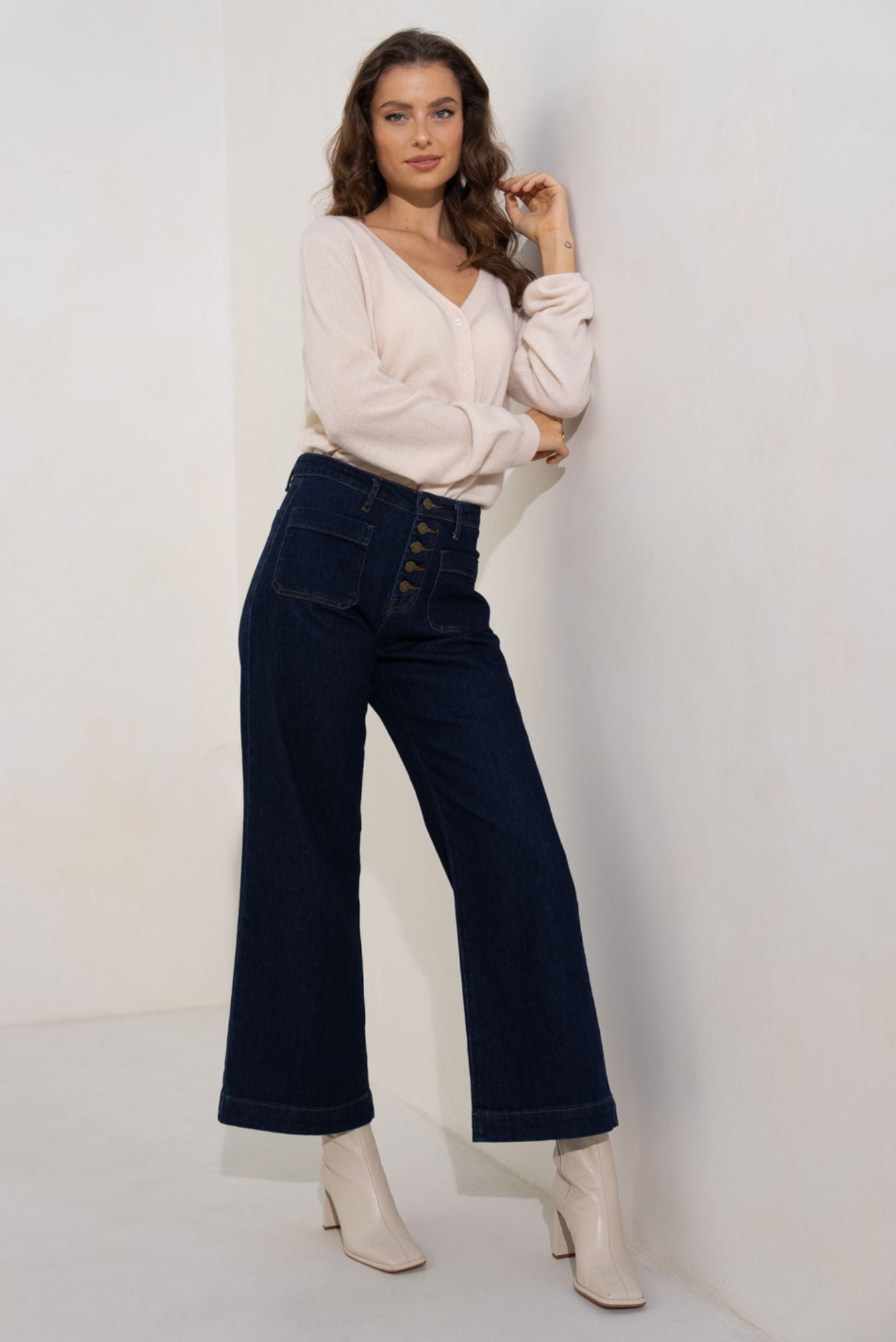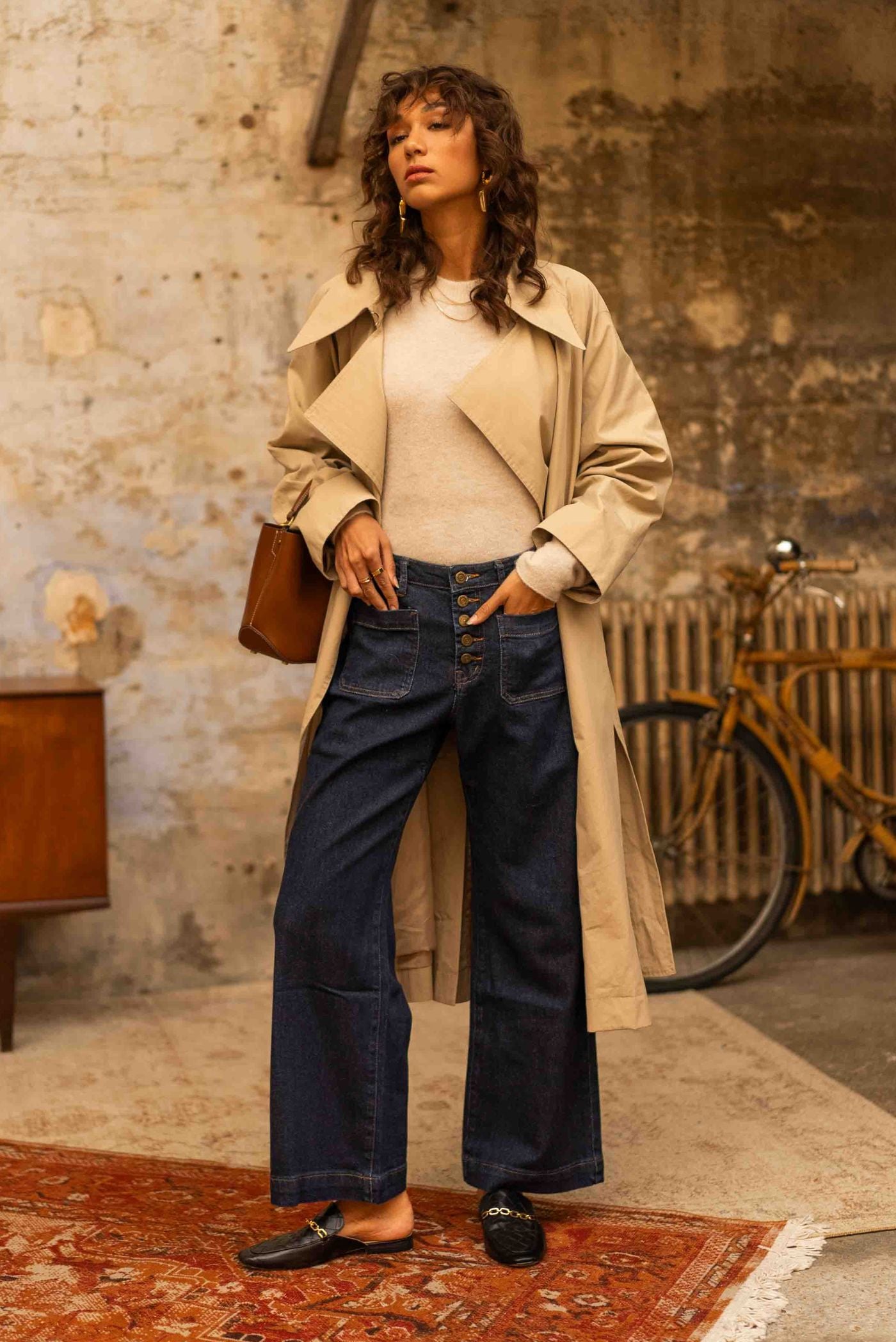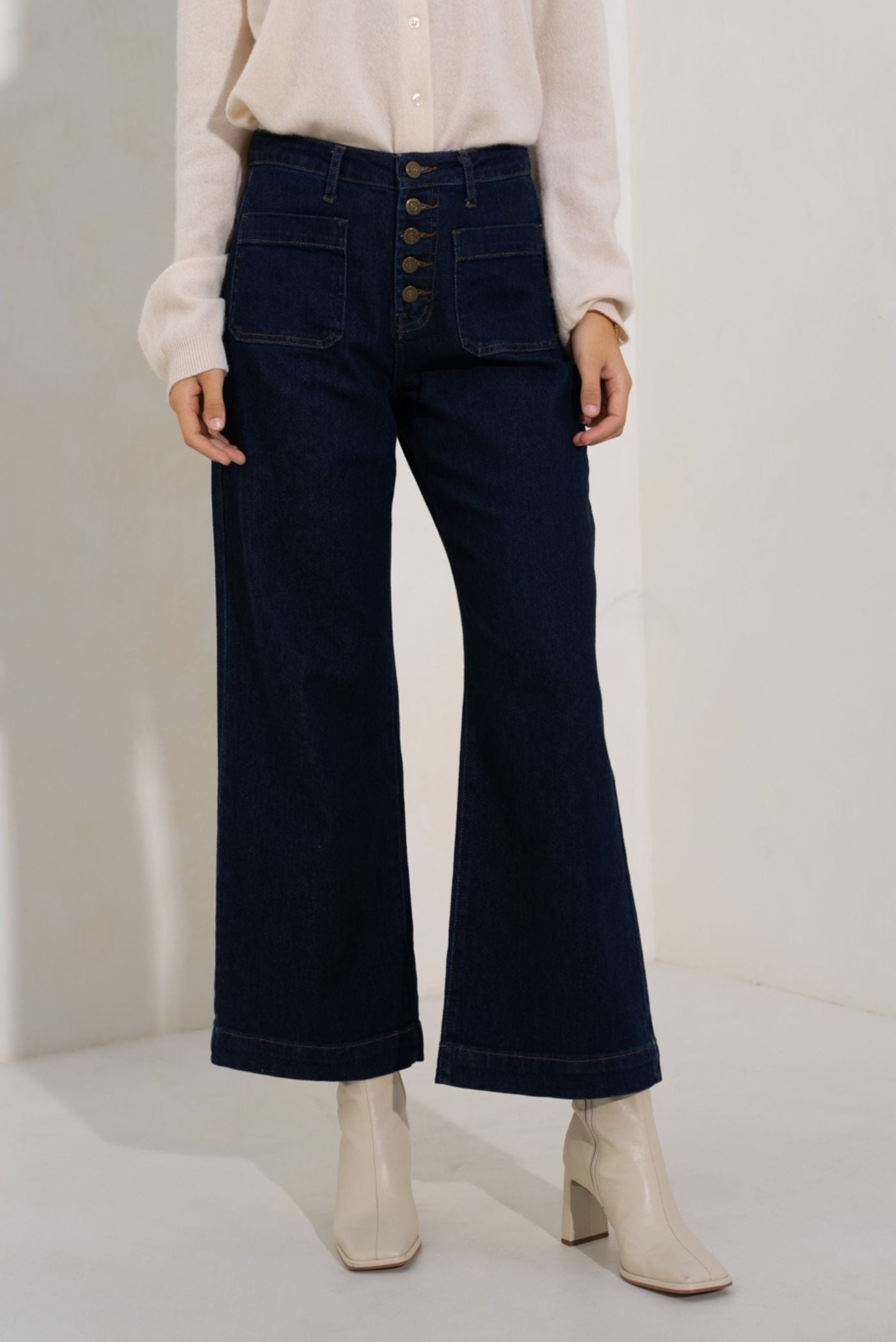- Diseño: Pantalón ancho recto con 2 bolsillos de parche que le dan un aire chic y un lado vintage con sus 5 botones oro viejo.