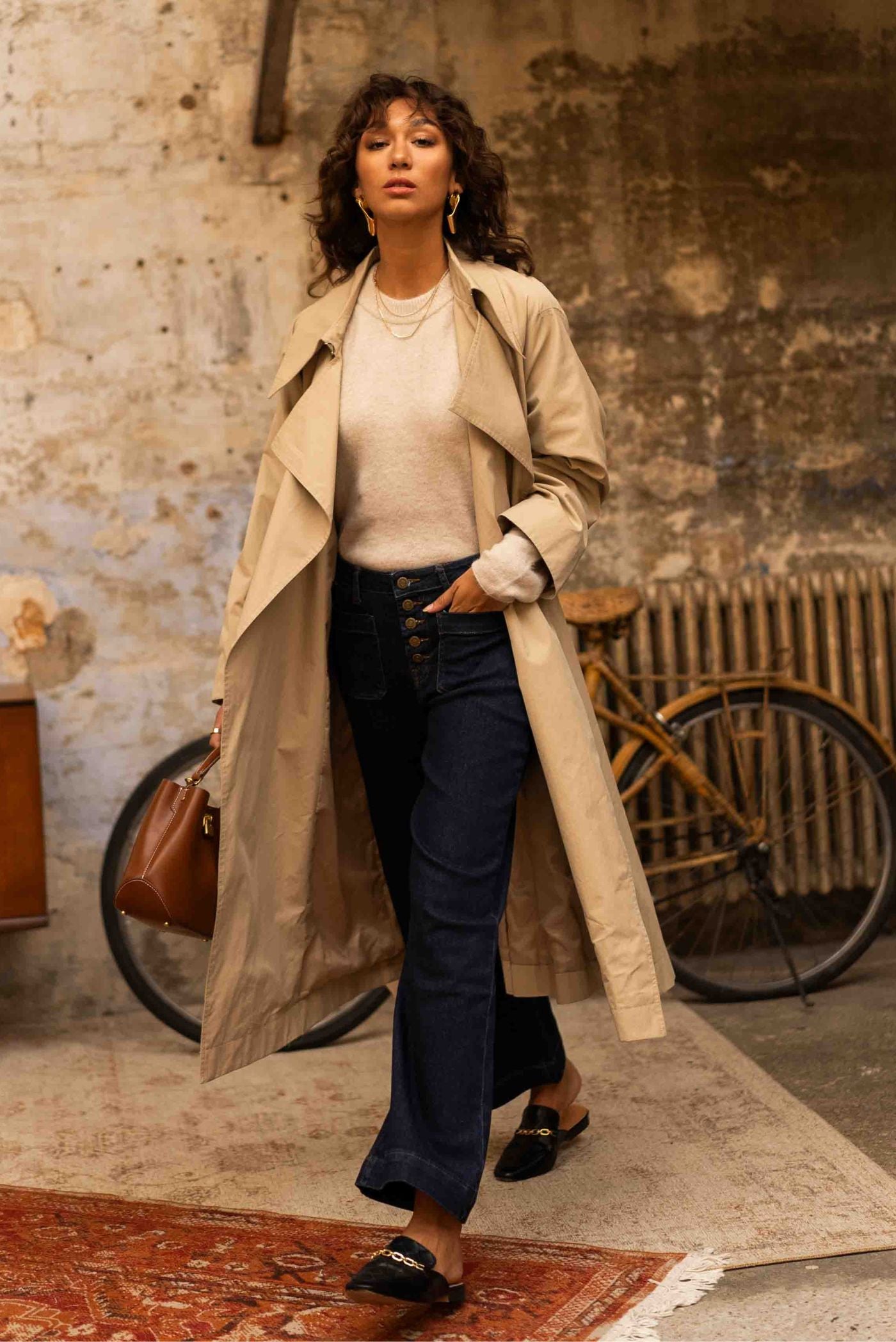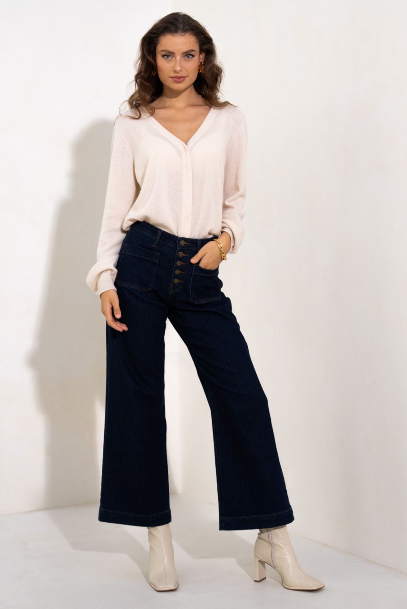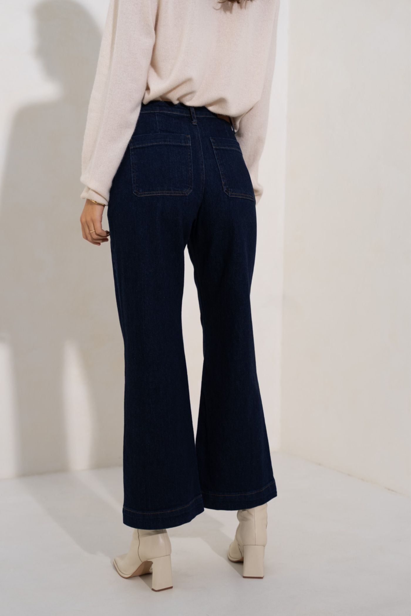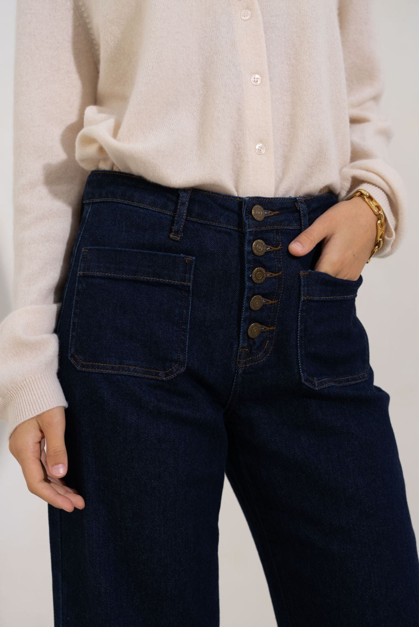- Diseño: Pantalón ancho recto con 2 bolsillos de parche que le dan un aire chic y un lado vintage con sus 5 botones oro viejo.