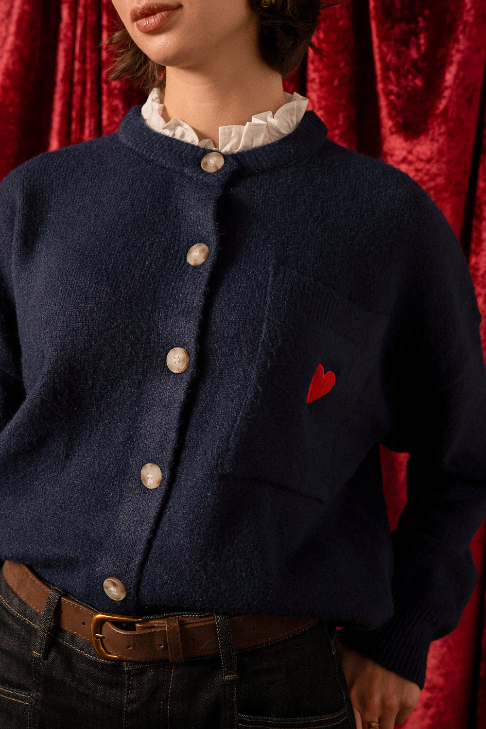 Coupe : Maille cardigan doté de son détail col chemisier volanté, boutons boisés naturels, broderie coeur.