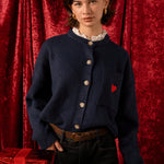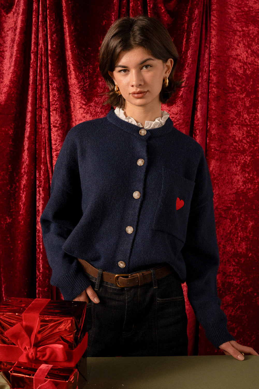 Vibe : Cardigan doux avec son sublime détail cœur et son col chemise volanté, rempli de tendresse.
