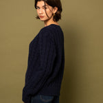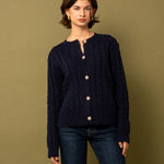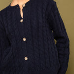 Détails : Maille torsadée, encolure ronde et boutons en bois authentiques