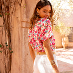 Pantalon 7/8ème blanc uni en tissu léger avec une ceinture tressée beige et des poches avant et arrière classiques
