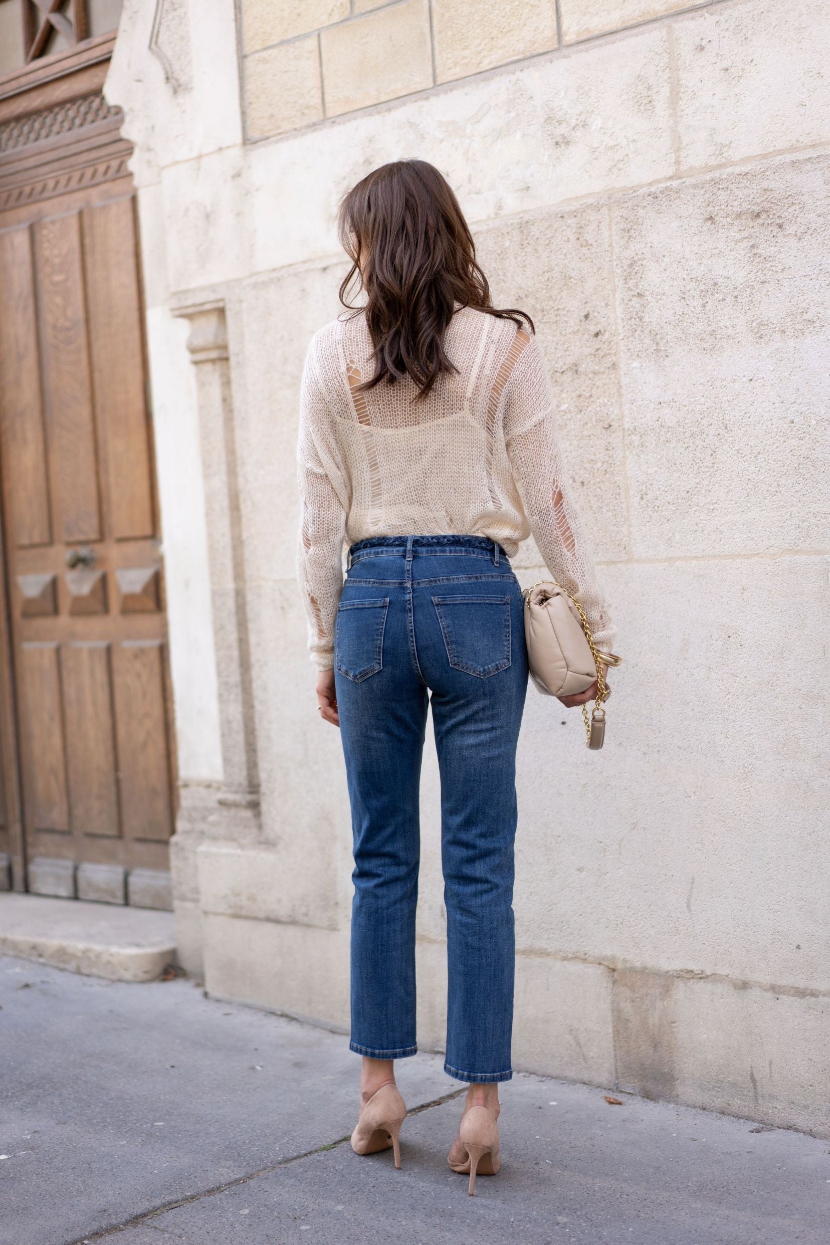Jean coupe droite avec ceinture en jean tressée assortie aux poches avant également tressées. Boucle de ceinture en forme de papillon.