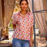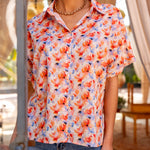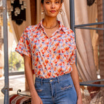 Imprimé floral multicolore sur l'ensemble du tissu, col chemise classique, manches courtes, fermeture boutonnée sur le devant.