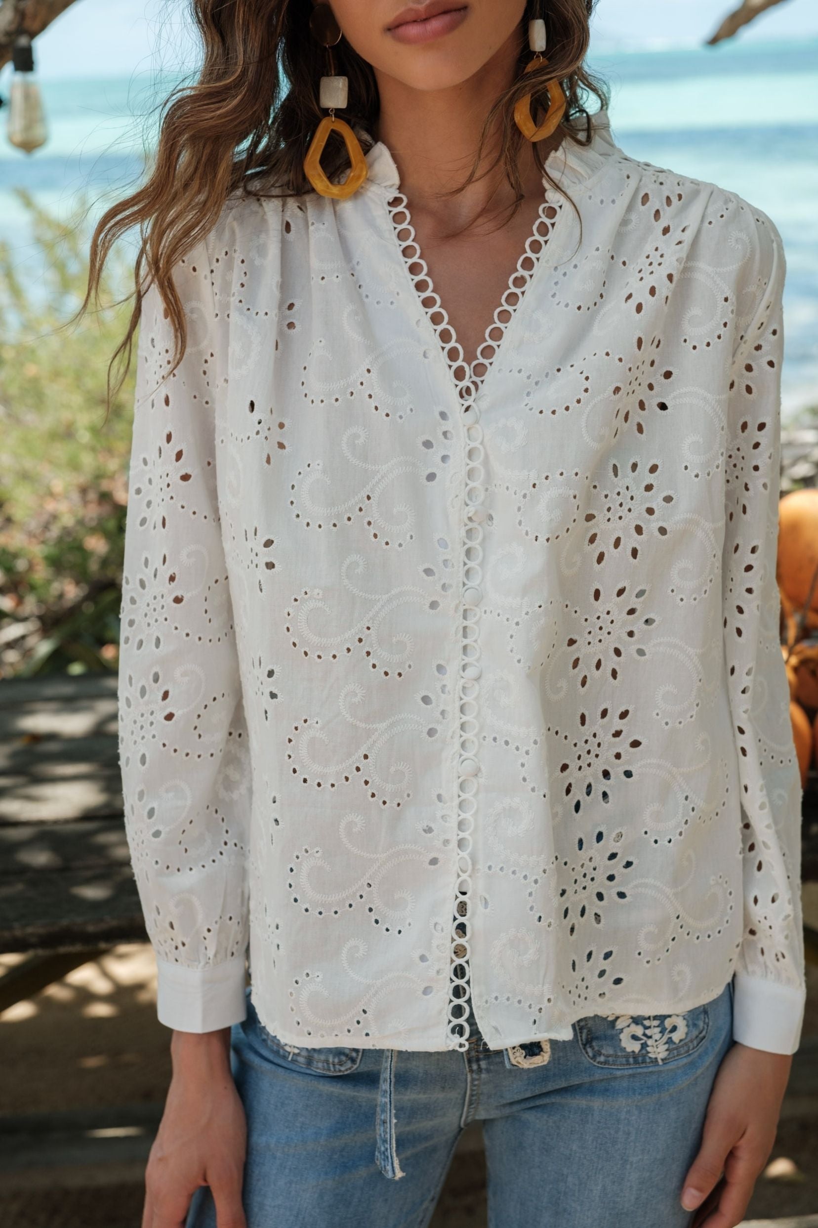 Détails : Voile de coton brodé esprit broderie anglaise, léger et aérien. Finition crochet le long de l’encolure et du devant, poignets boutonnés. Tombé souple et agréable au porté.