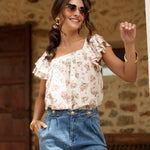 Top en gaze de coton avec encolure bateau et manches volantées romantiques. Agrémenté d'un imprimé à fleurs roses et vertes pour une touche de fraîcheur et de féminité.