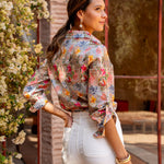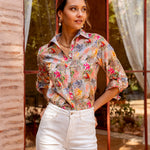 Tissu fluide à imprimé vibrant, col chemise structuré, fermeture boutonnée, manches ajustables à patte boutonnée, finitions raffinées.