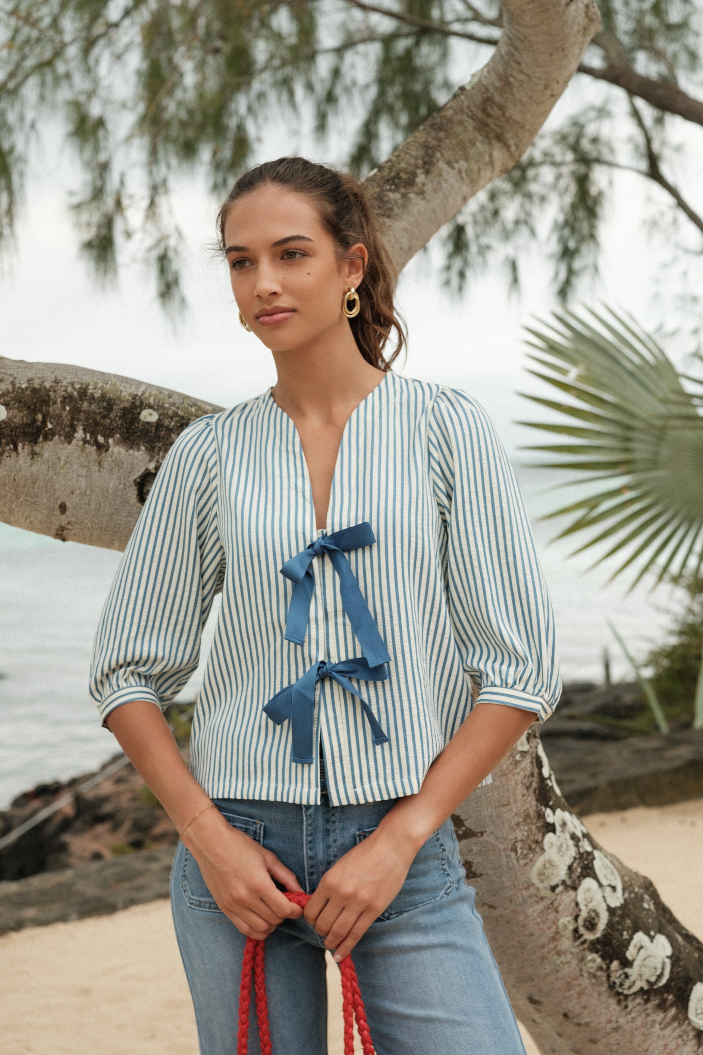 Deux liens à nouer sur le devant en bleu profond pour une touche raffinée.