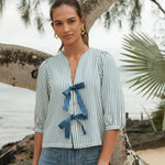 Détails : Coton rayé bleu et blanc, frais et lumineux.